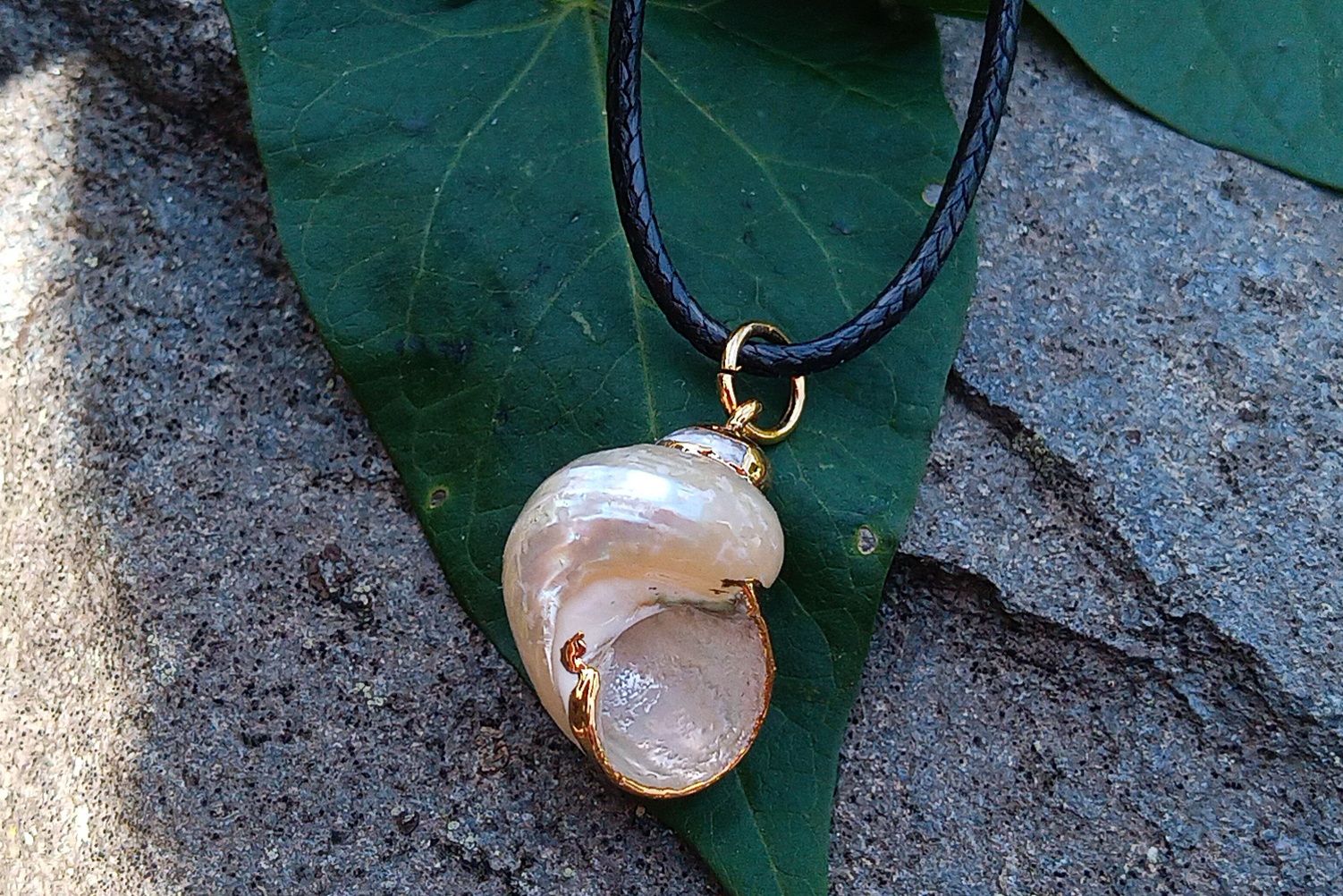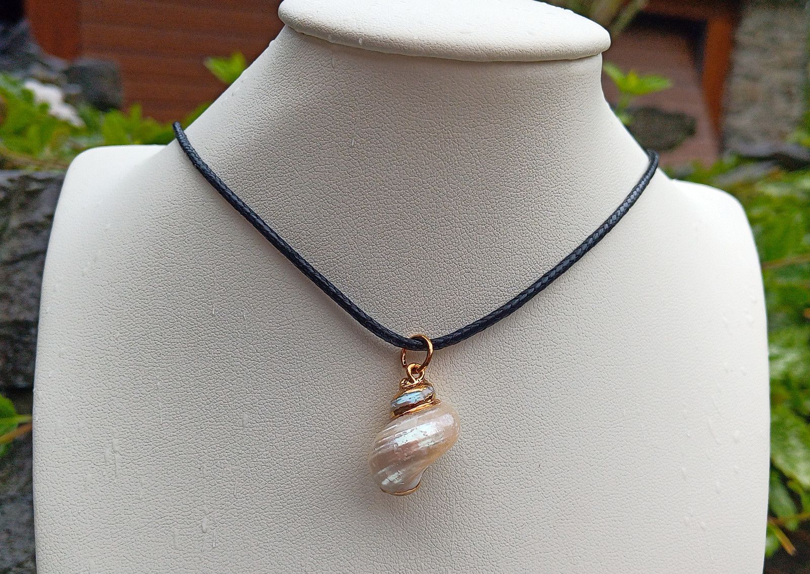 Bílo zlatavé nádherně duhově perleťová mušle z Tichého oceánu se zlatým zdobením zavěšená na černé bavlněné voskované šňůrce se zapínáním na karabinku o délce 45 cm. Šperk, který se vyrovná perlovým šperkům a s perlami dokonale ladí.