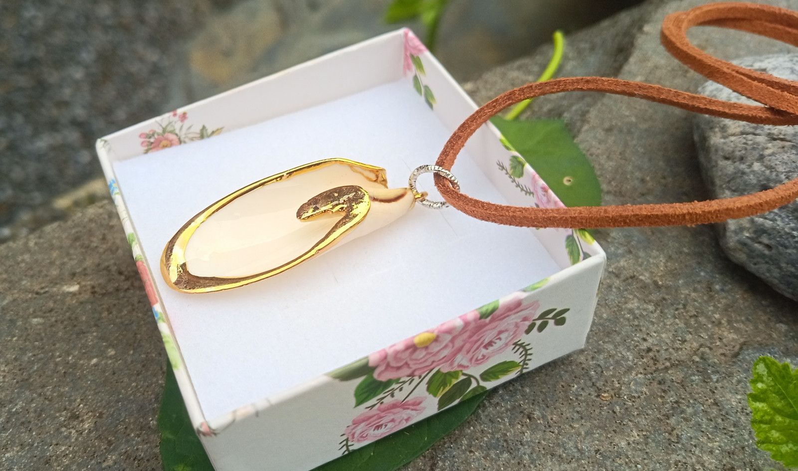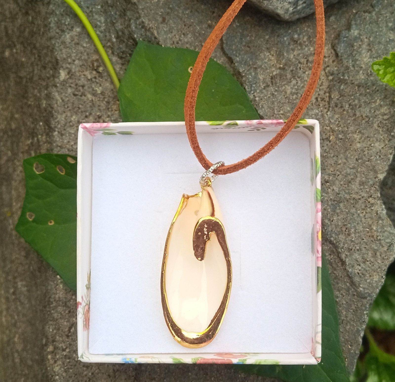 Vzácná mušle - lastura pocházející z moří v okolí Filipín se zlatým zdobením zavěšená na hnědé semišové kůži o délce 46-49 cm.