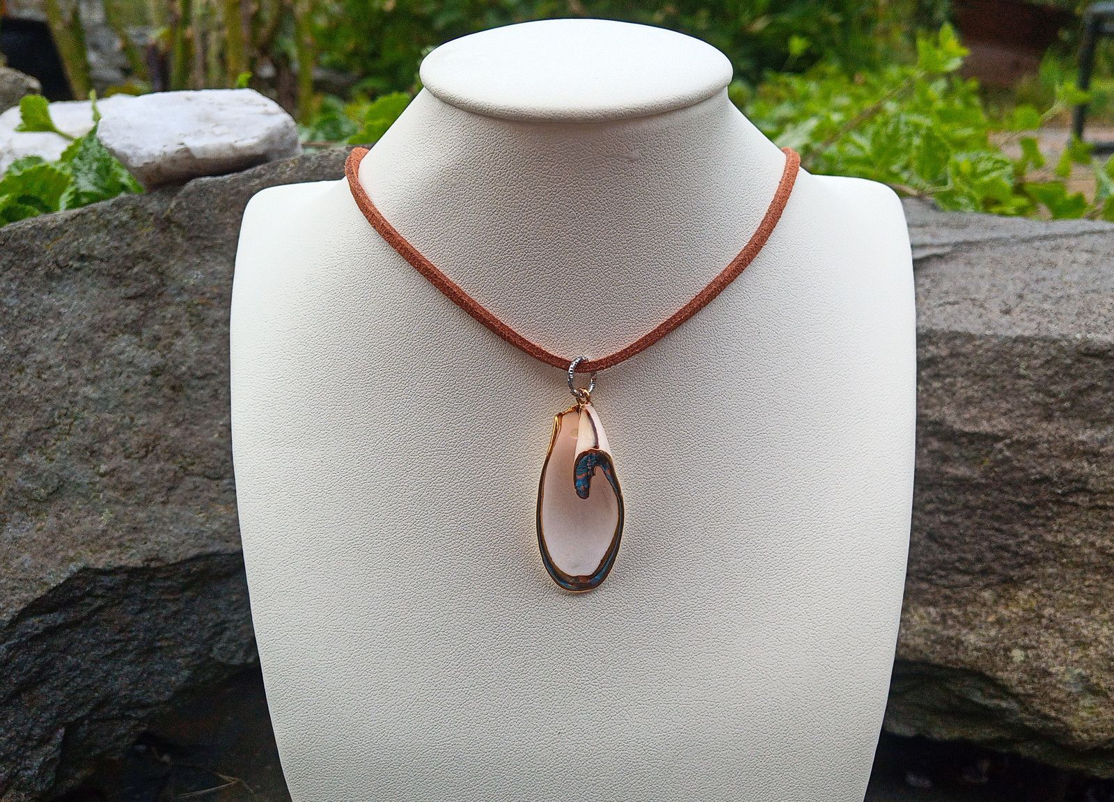 Mušle má barvu slonové kosti s hnědou linkou v horní části. Můžete ji nosit zavěšenou z obou stran a máte tak dva náhrdelníky v jednom :-)