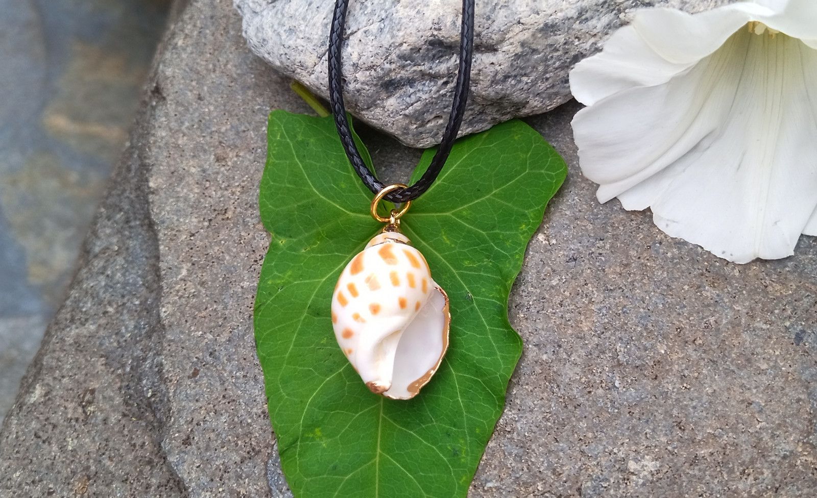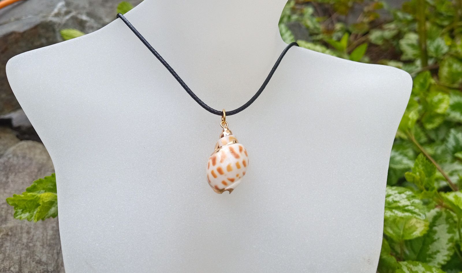 Nádherně vybarvená mušle z Tichého oceánu s pozlaceným zdobením zavěšená na černé bavlněné voskované šňůrce o délce 44 cm. Velikost mušle cca 30x20 mm.