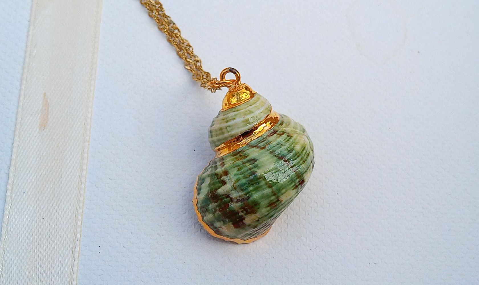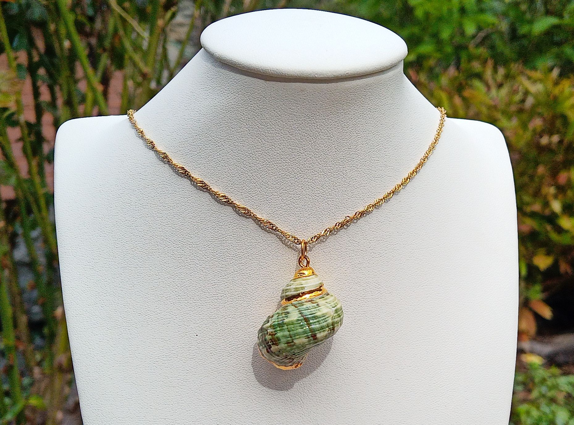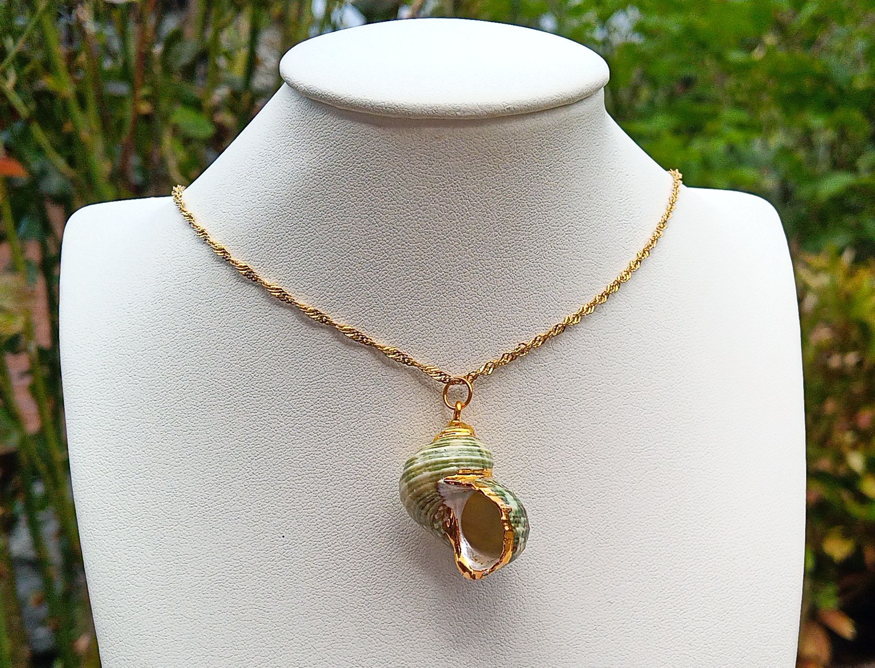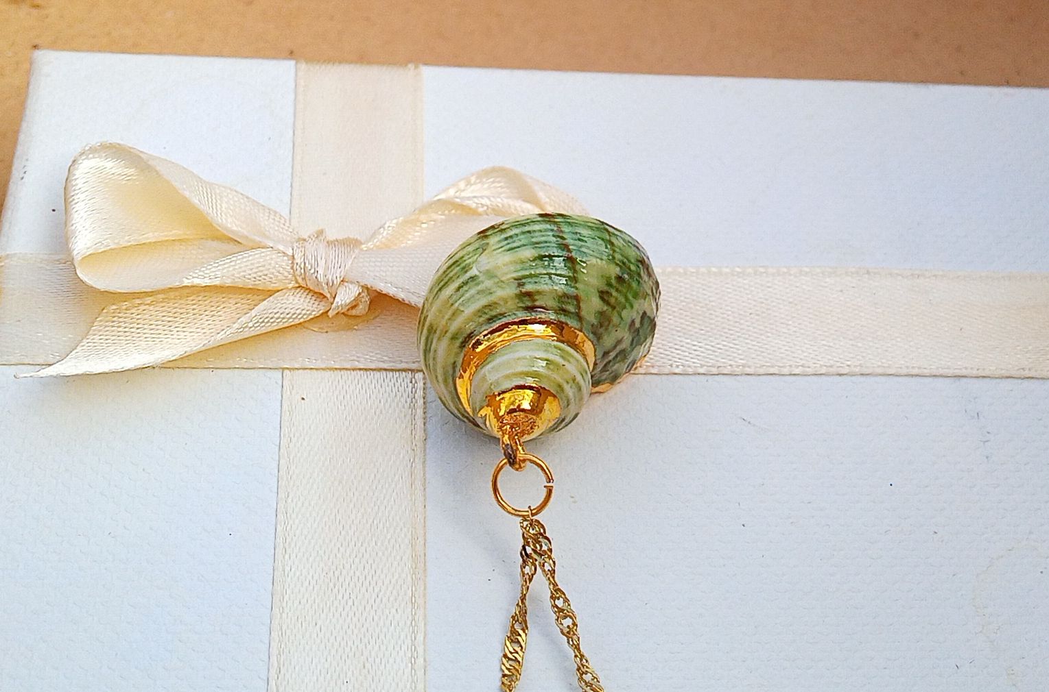 Zelená mušle z Tichého oceánu se zlatým zdobením zavěšená na pozlaceném spirálovém řetízku z chirurgické oceli o délce 45 cm. Velikost mušle cca 30x30 mm. Jedná se o vzácnou mušli, která se hodnotově vyrovná drahým perlám a krásně se spolu doplňují.