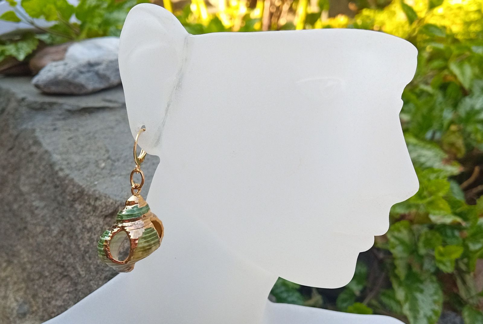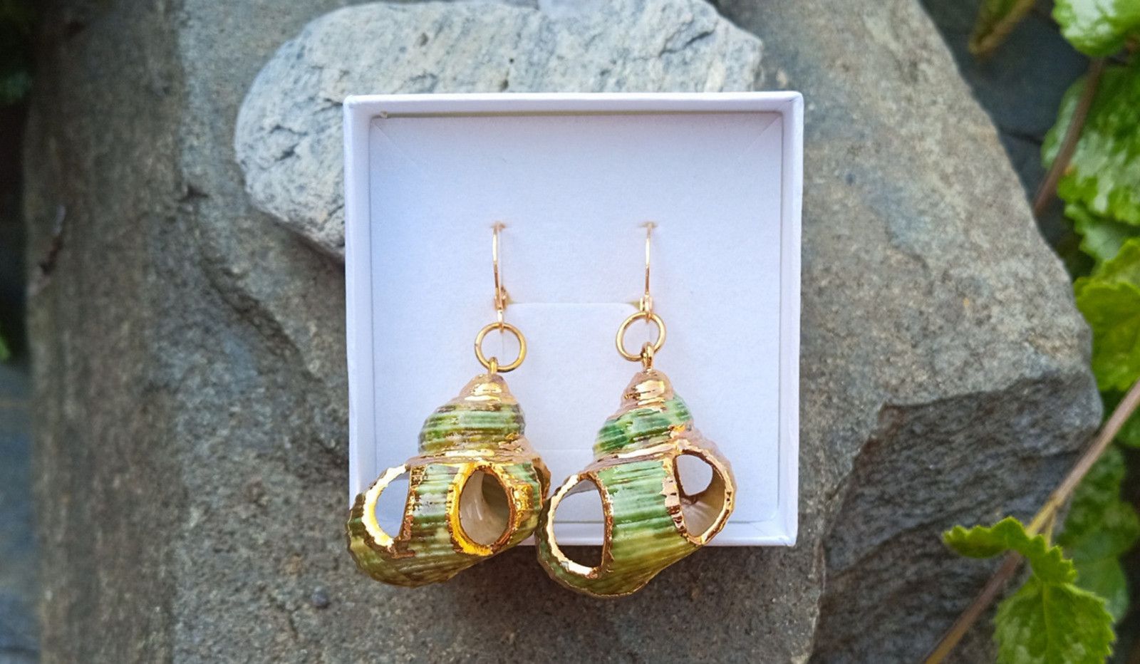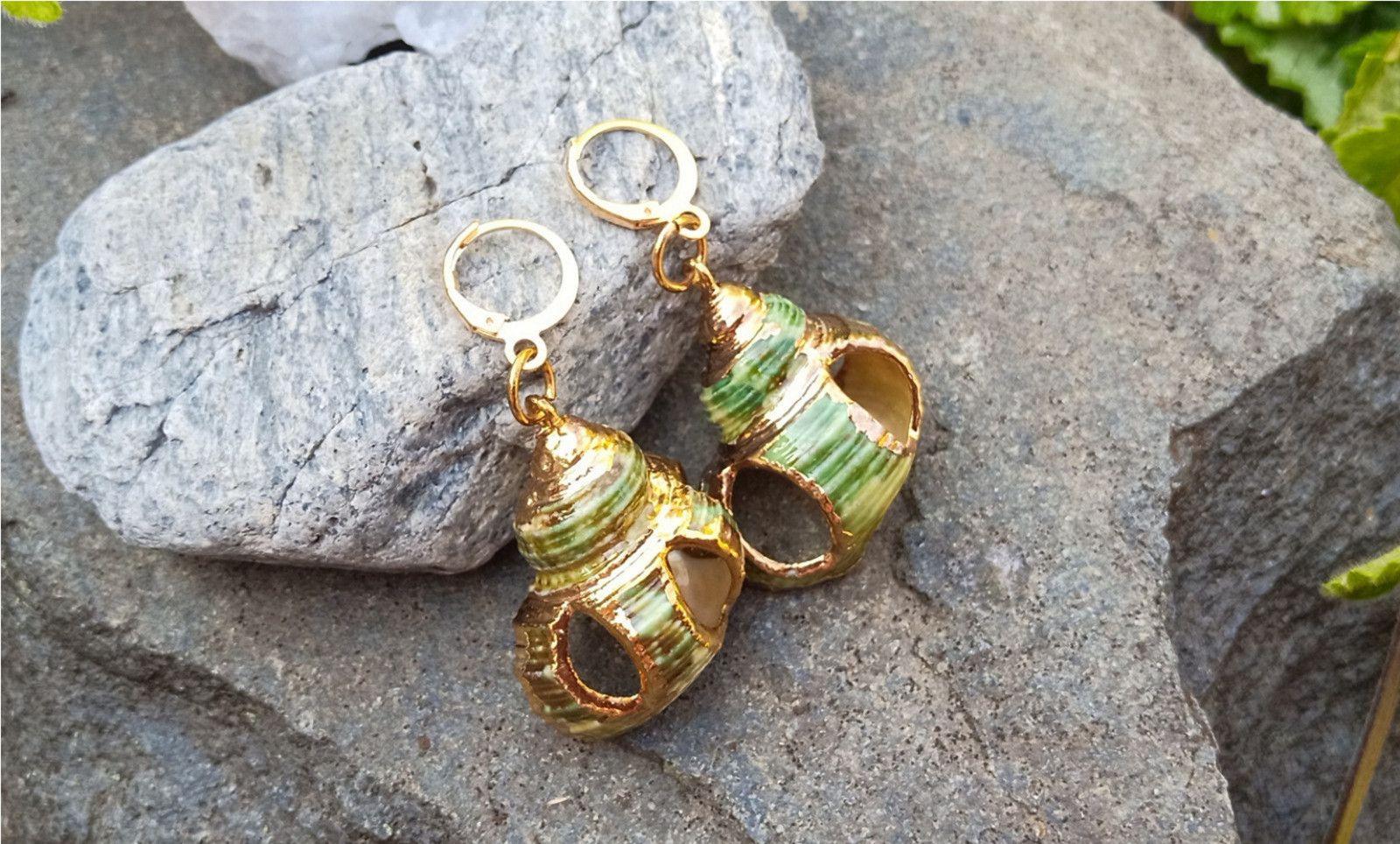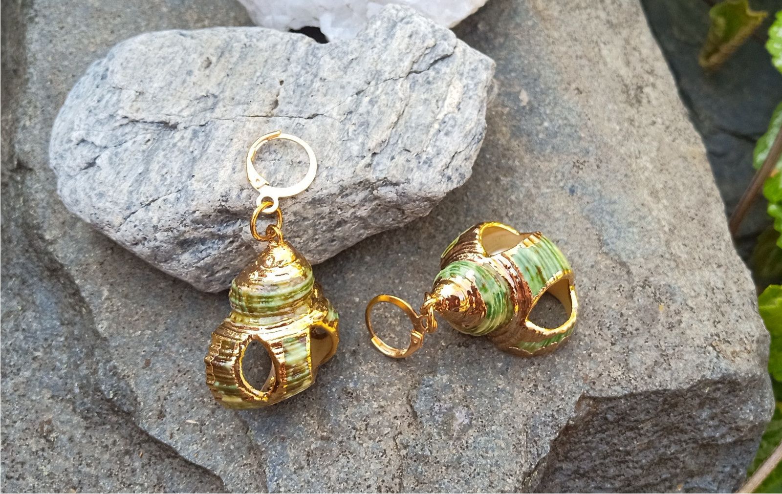 Zelené nádherně perleťové mušle z Tichého oceánu se zlatým zdobením zavěšené na zavíracích pozlacených háčcích. Velikost lastur cca 30x25 mm. Pokud máte zájem, mohu předělat jiné háčky - tvar i materiál, např. na pozlacené stříbro apod.