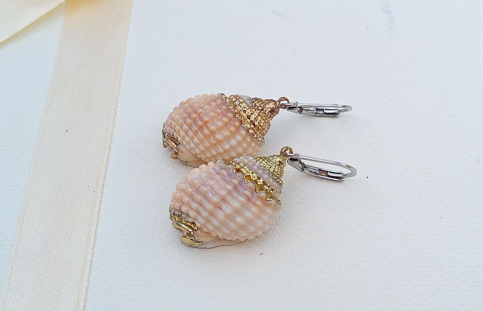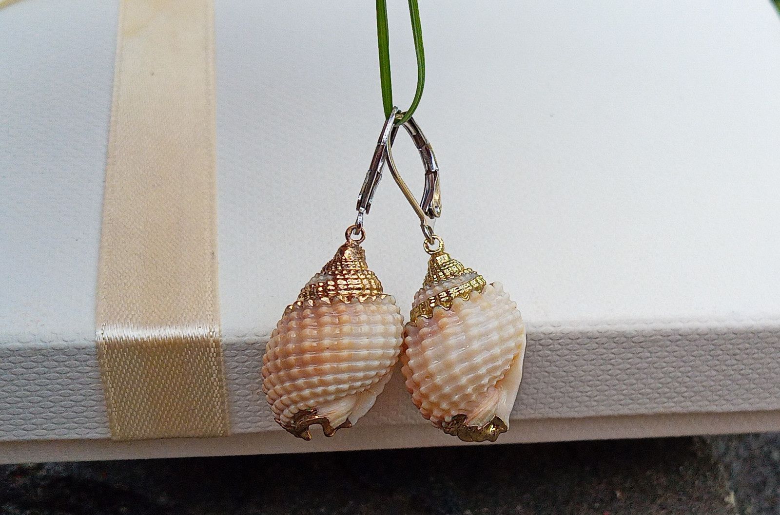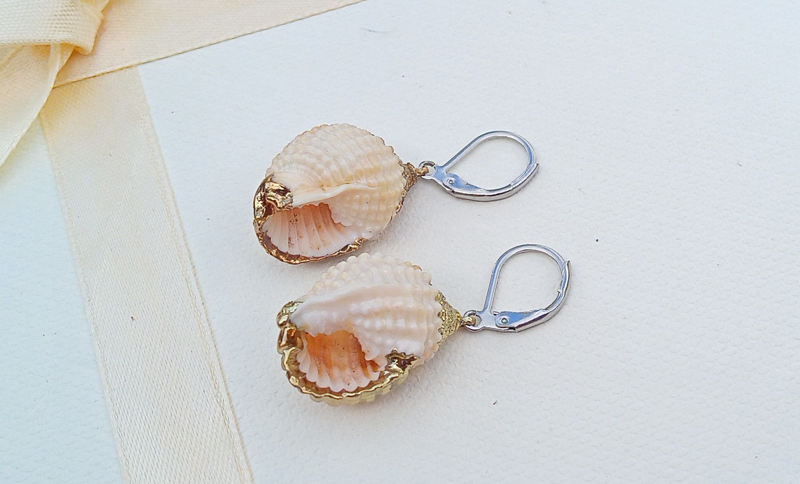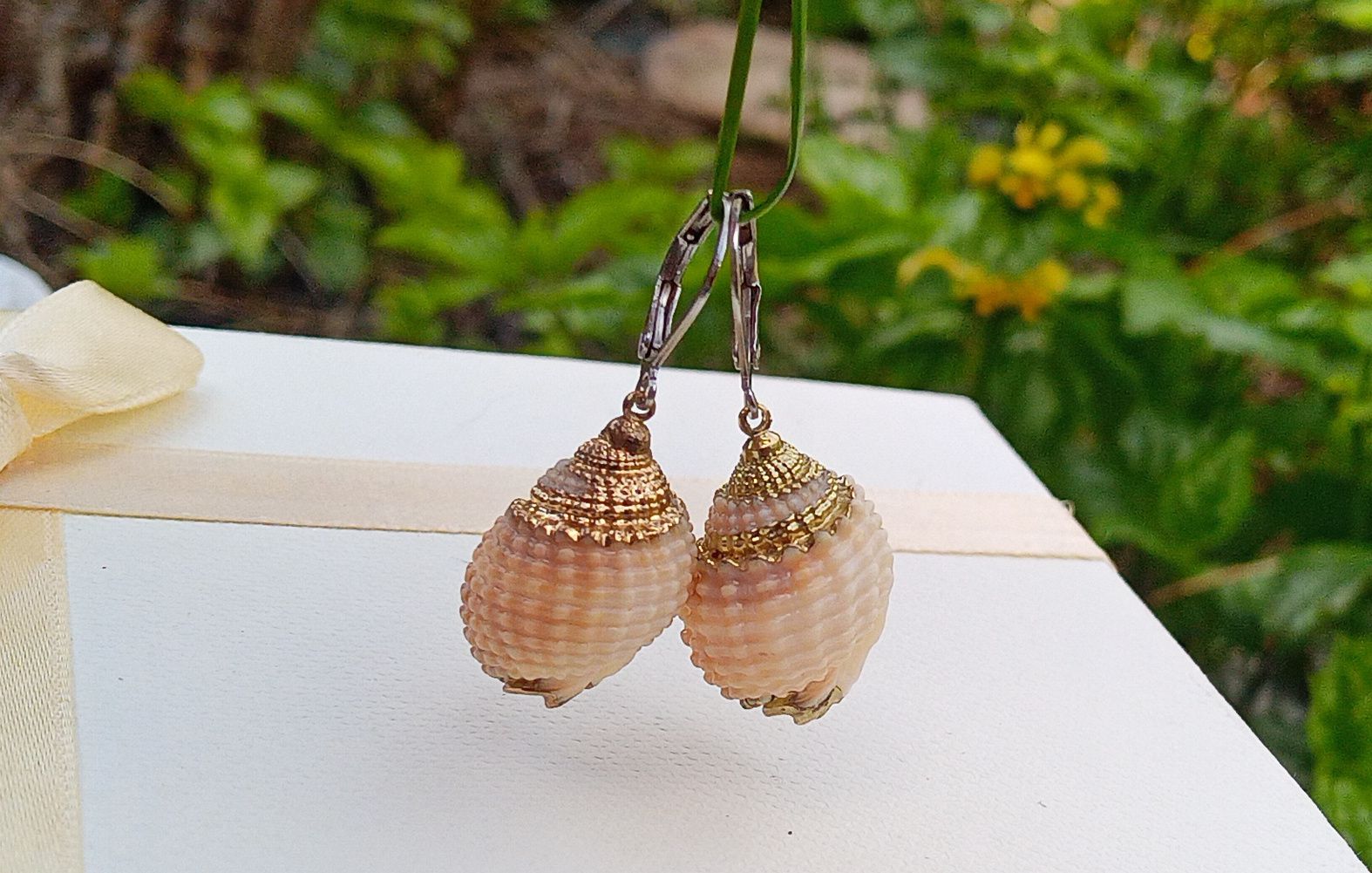 Béžové nádherně perleťové mušle z moře v okolí Filipín se zlatým zdobením zavěšené na zavíracích háčcích z chirurgické oceli - hypoalergenní, vhodné i pro alergiky. Šperk, který se vyrovná perlovým šperkům a s perlami dokonale ladí.