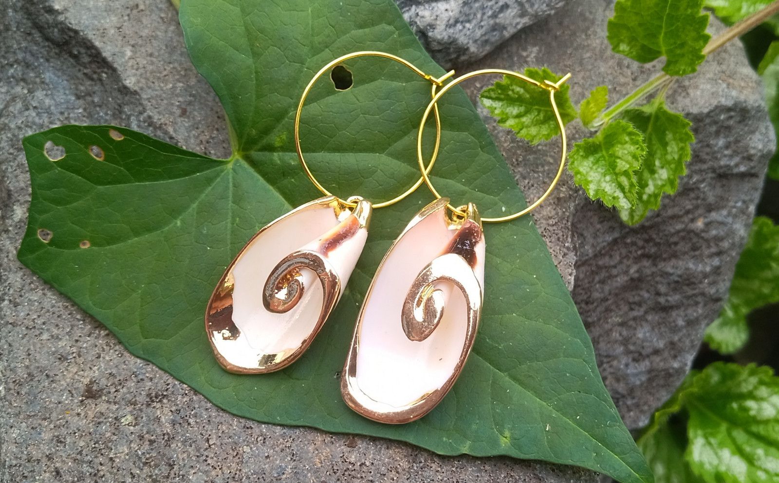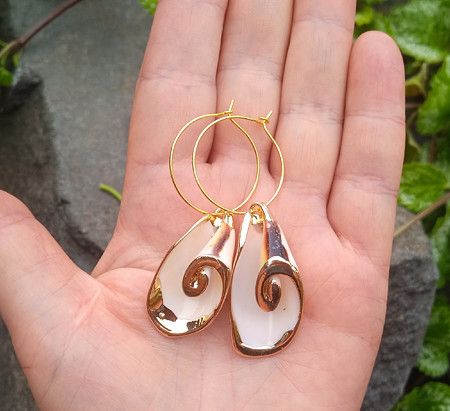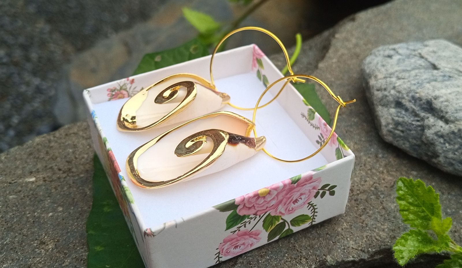 Bílé vzácné mušle - lastury pocházející z moří v okolí Filipín se zlatým zdobením zavěšené na pozlacených kruzích z chirurgické oceli - hypoalergenní, vhodné i pro alergiky.