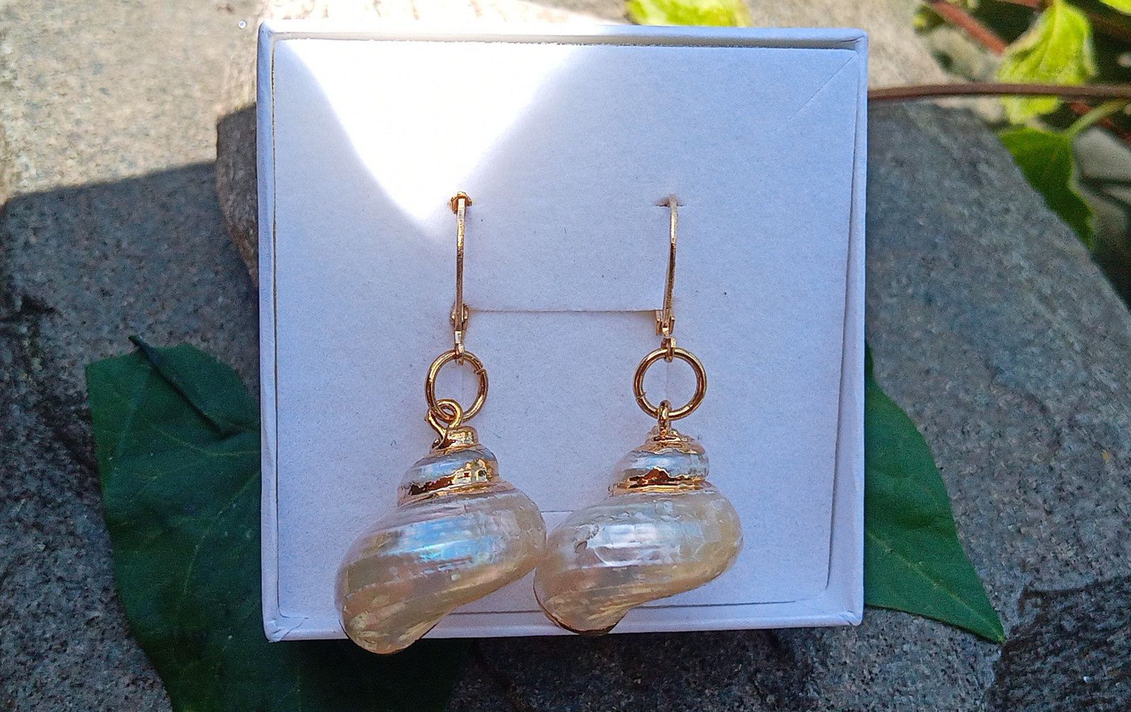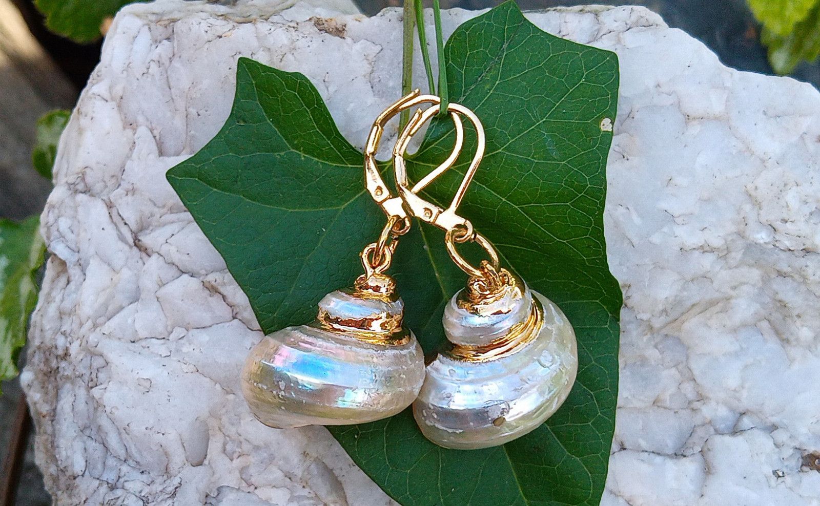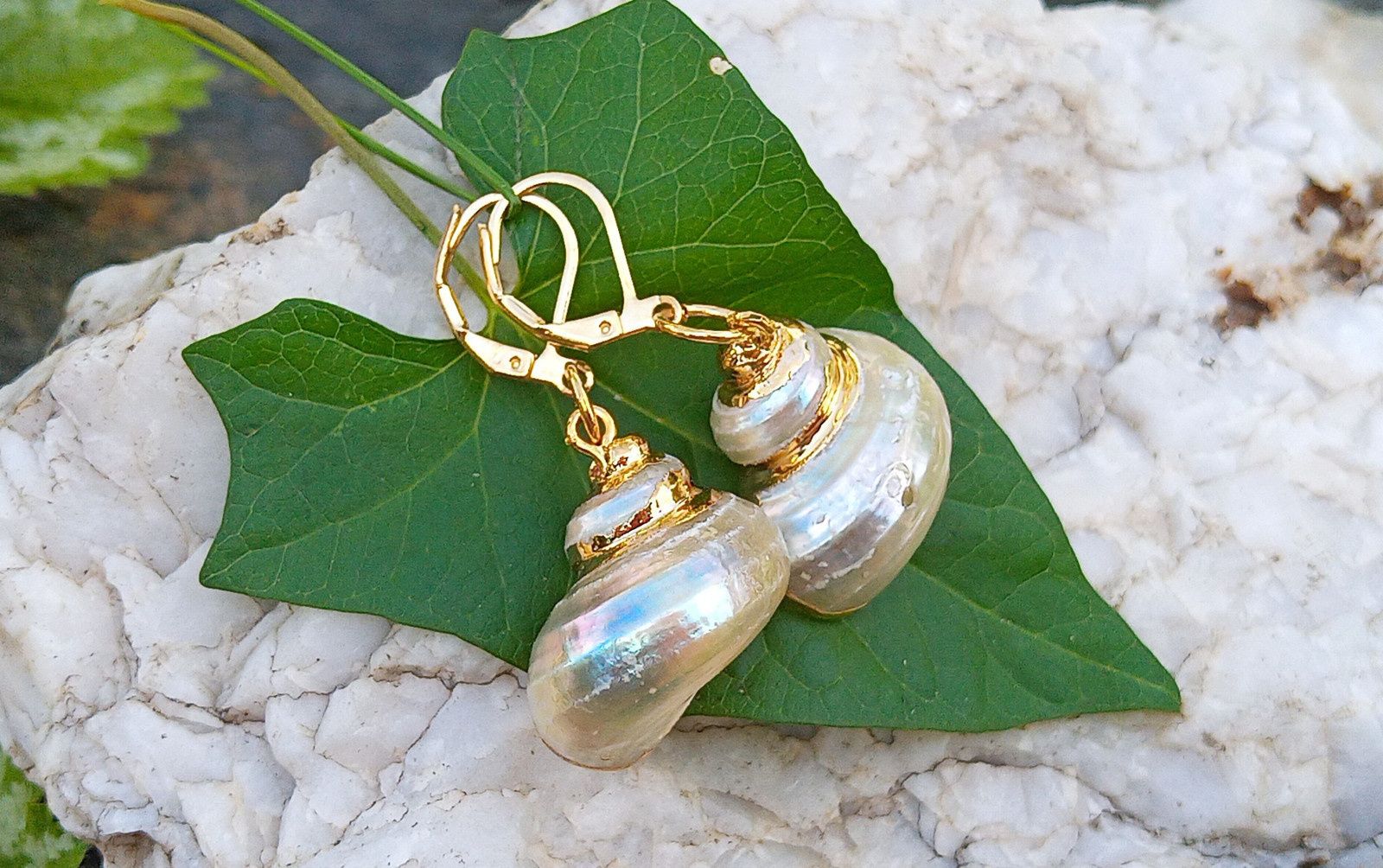 Bílo zlatavé nádherně duhově perleťové mušle z Tichého oceánu se zlatým zdobením zavěšené na zavíracích pozlacených háčcích z chirurgické oceli - hypoalergenní, vhodné i pro alergiky. Šperk, který se vyrovná perlovým šperkům a s perlami dokonale ladí.