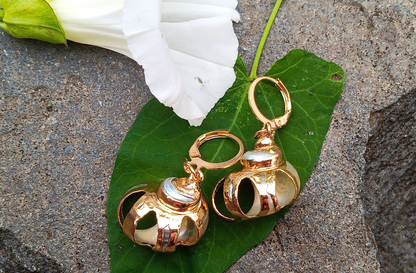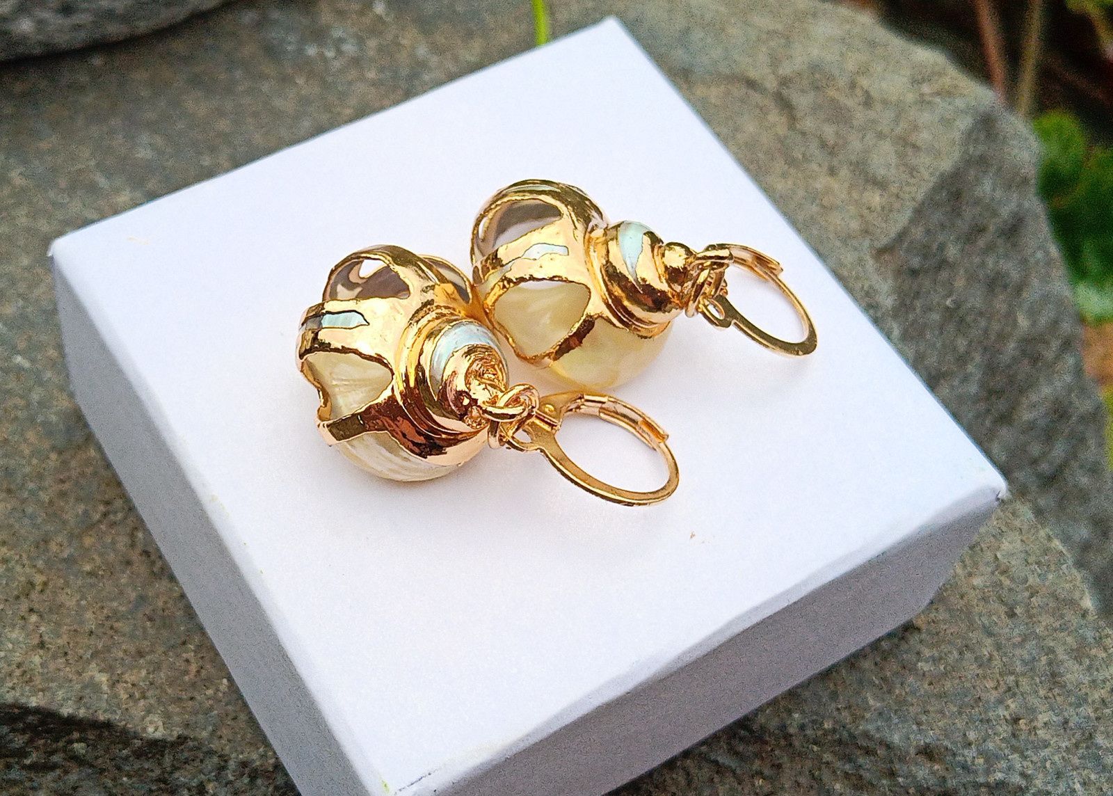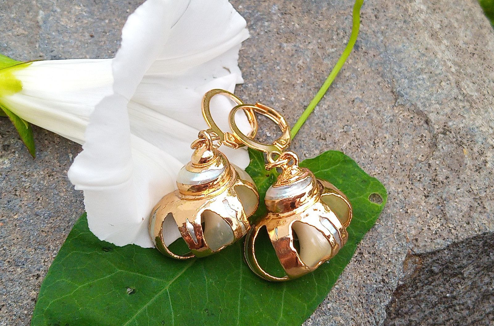 Bílé nádherně perleťové mušle z Tichého oceánu se zlatým zdobením zavěšené na zavíracích pozlacených háčcích. Velikost lastur cca 20x15 mm.