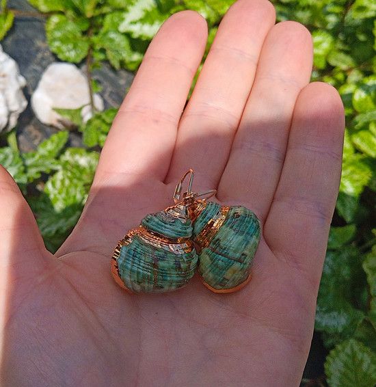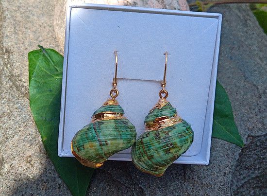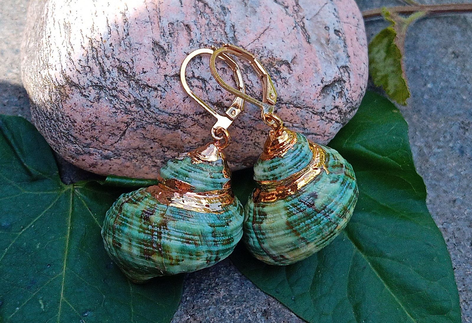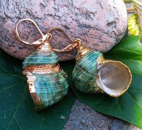 Zelené mušle z Tichého oceánu se zlatým zdobením zavěšené na zavíracích háčíchc z pozlacené chirurgické oceli - hypolaergenní, vhodné i pro alergiky. Velikost lastur cca 28x30 mm. Pokud máte zájem, můžeme předělat jiné háčky - tvar i materiál, např. na pozlacené stříbro apod.