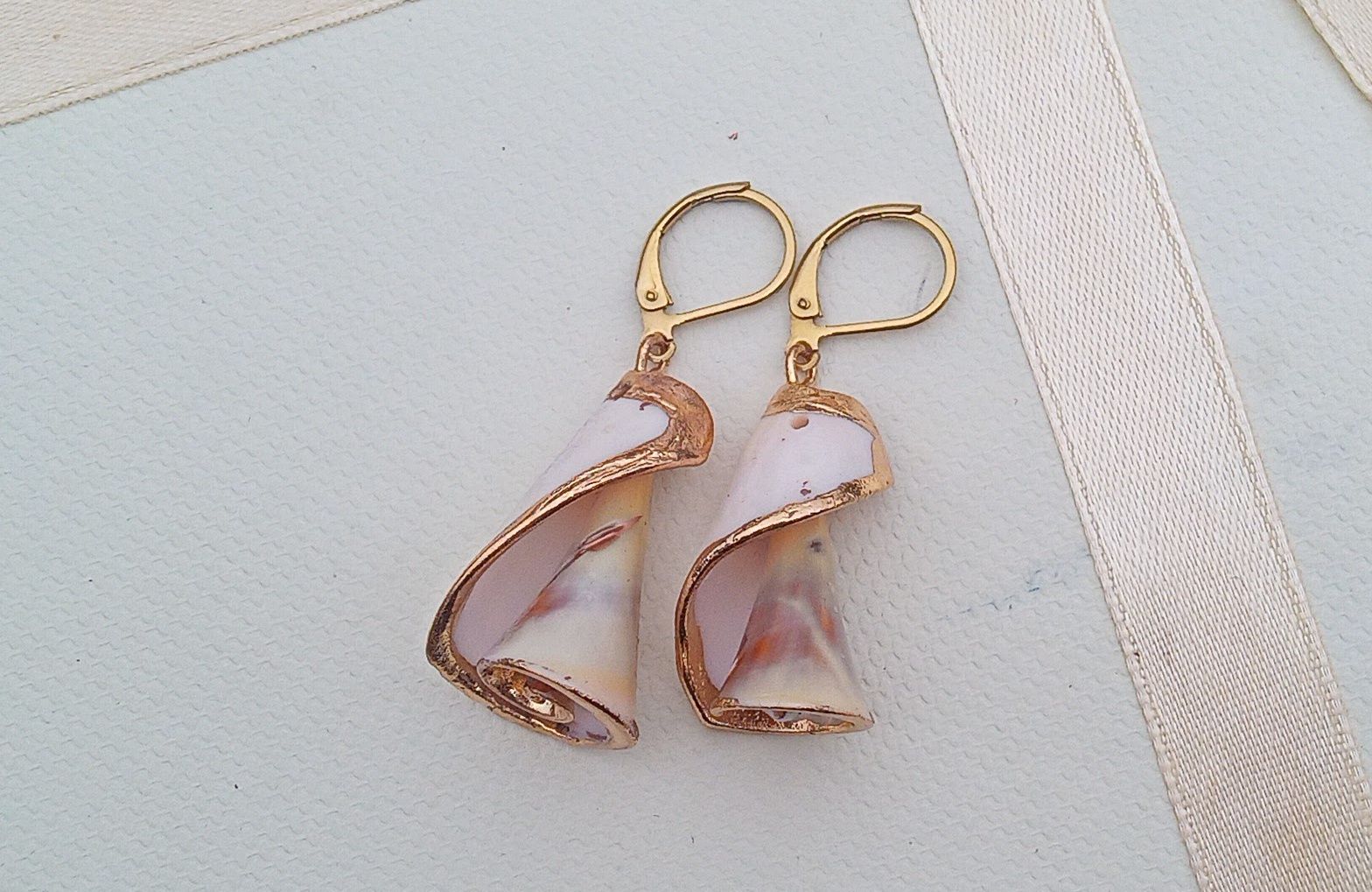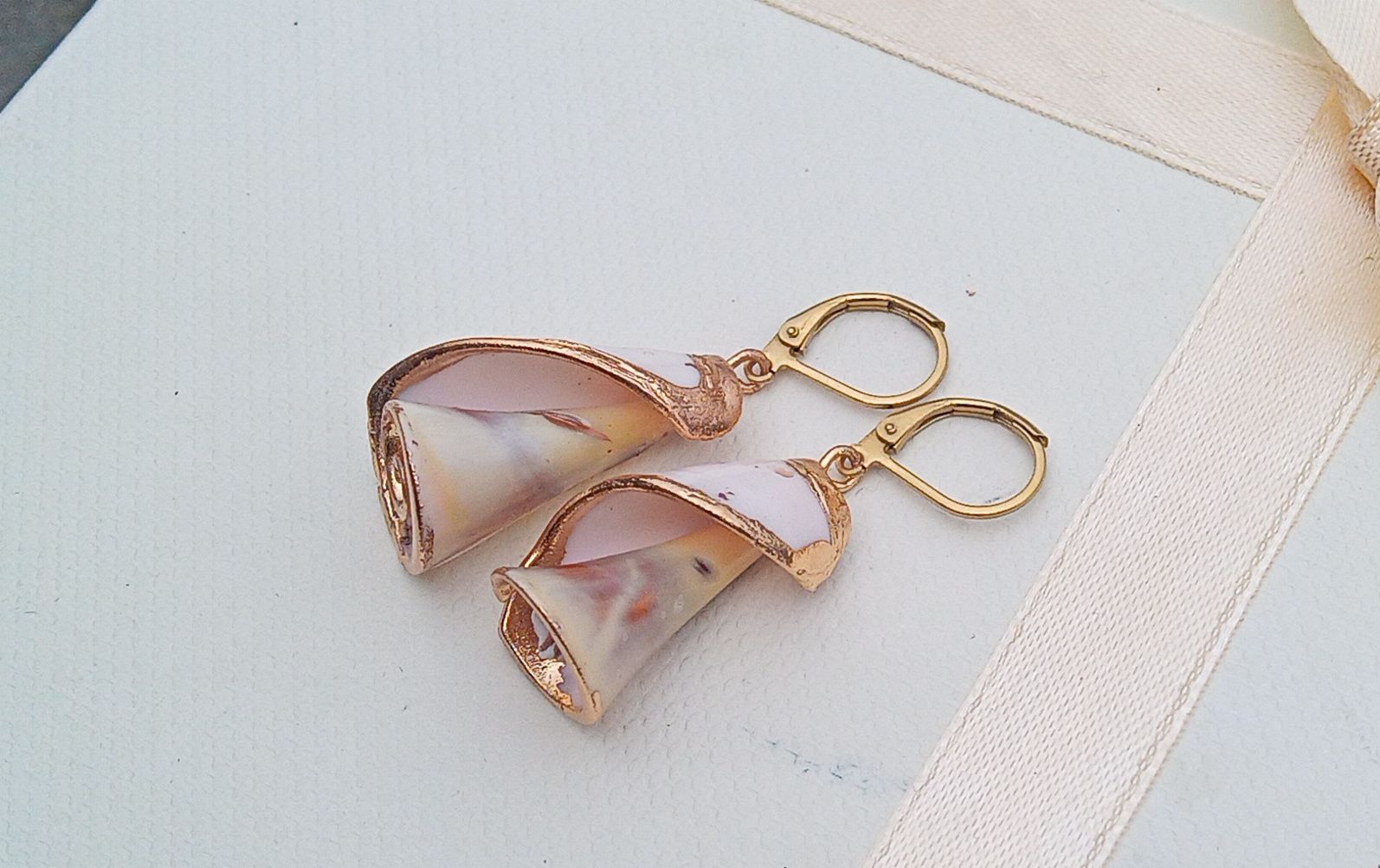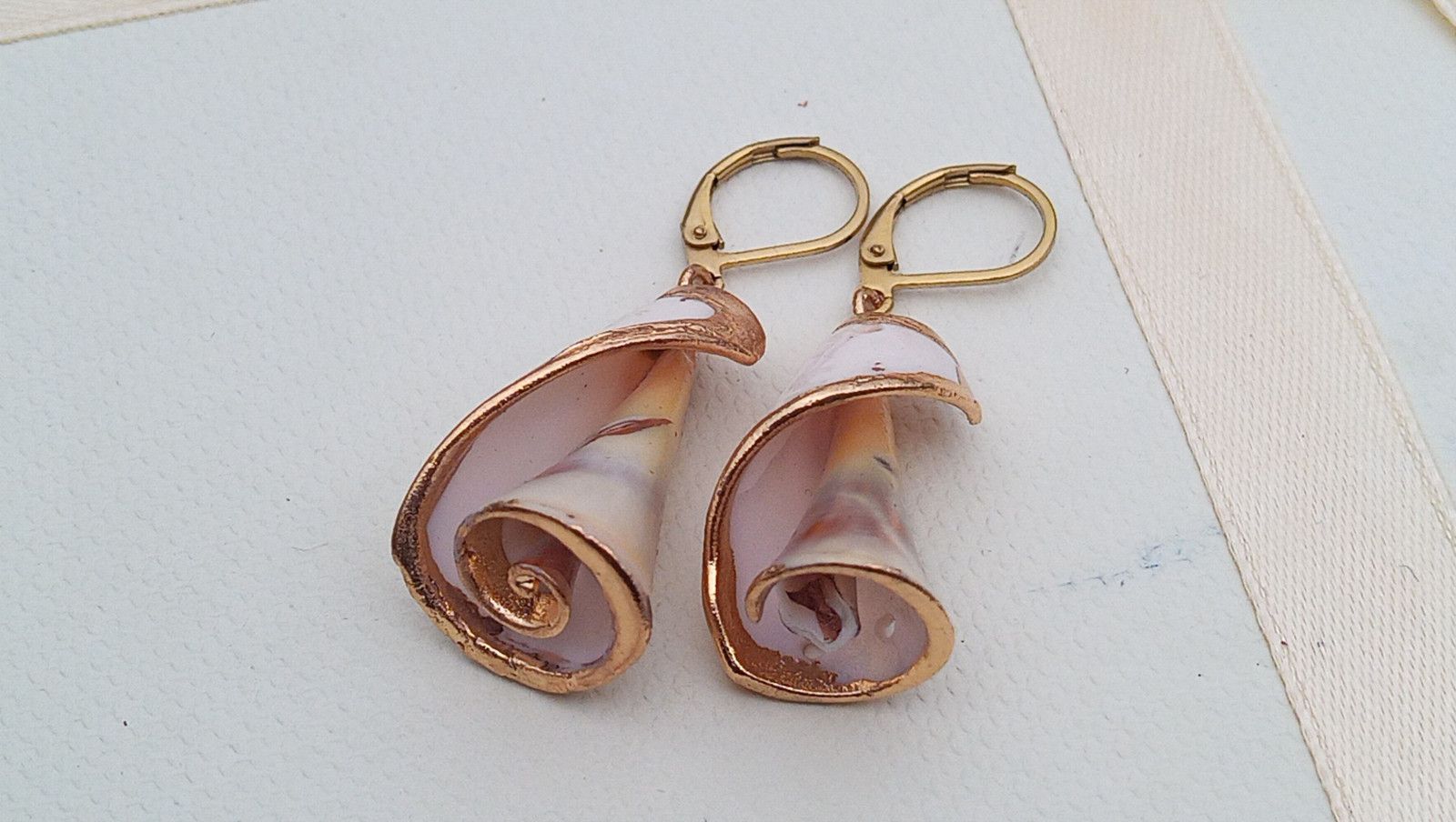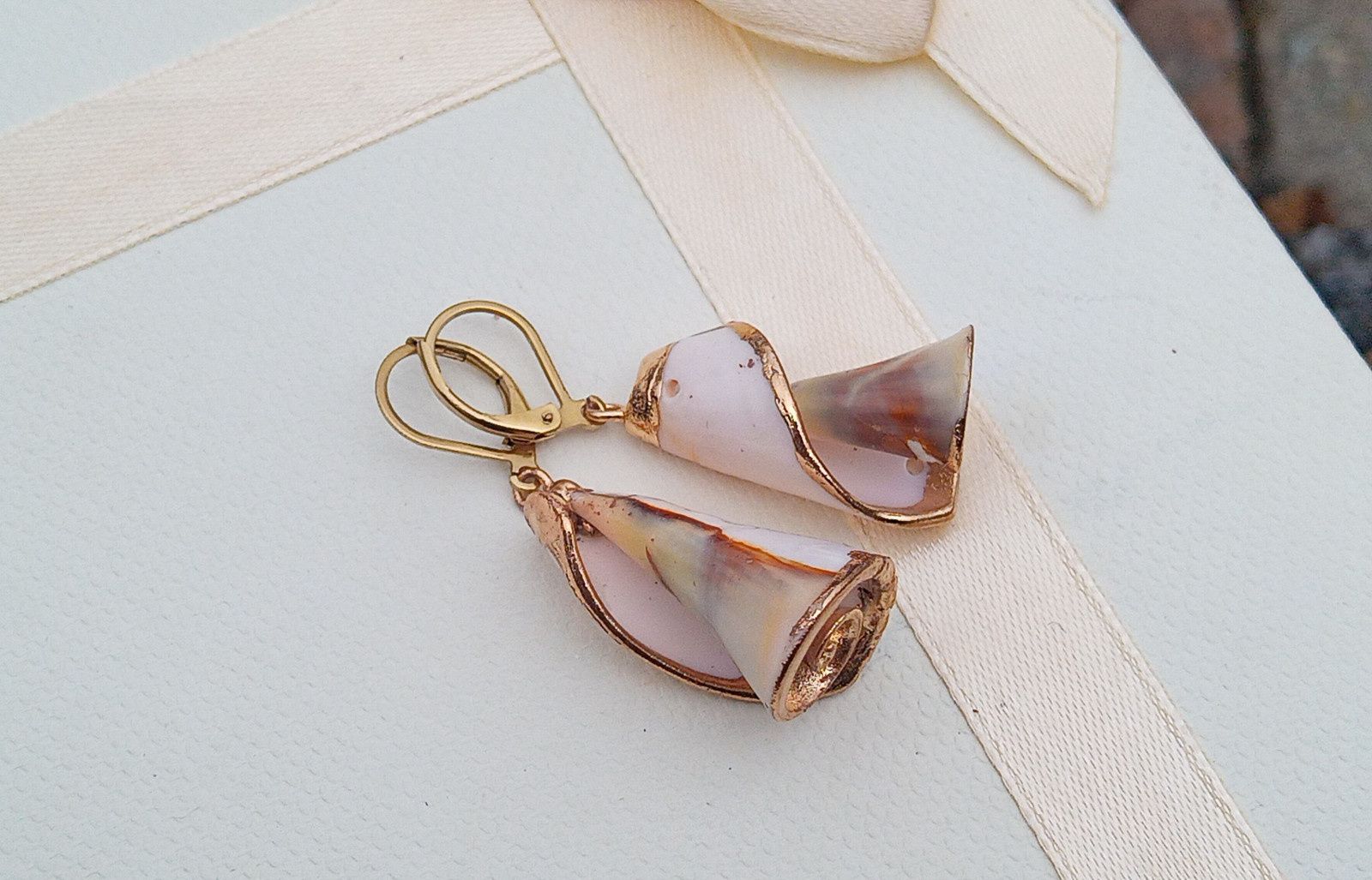 Vzácné mušle - lastury v barvě slonové kosti s duhovými hnědo růžovými odstíny pocházející z moří v okolí Filipín se zlatým zdobením zavěšené na pozlacených zavíracích háčcích z chirurgické oceli - hypoalergenní, vhodné i pro alergiky.