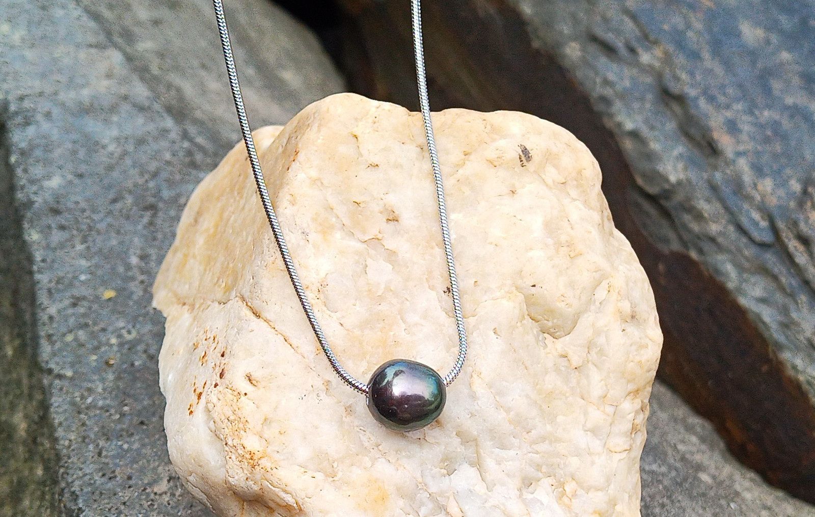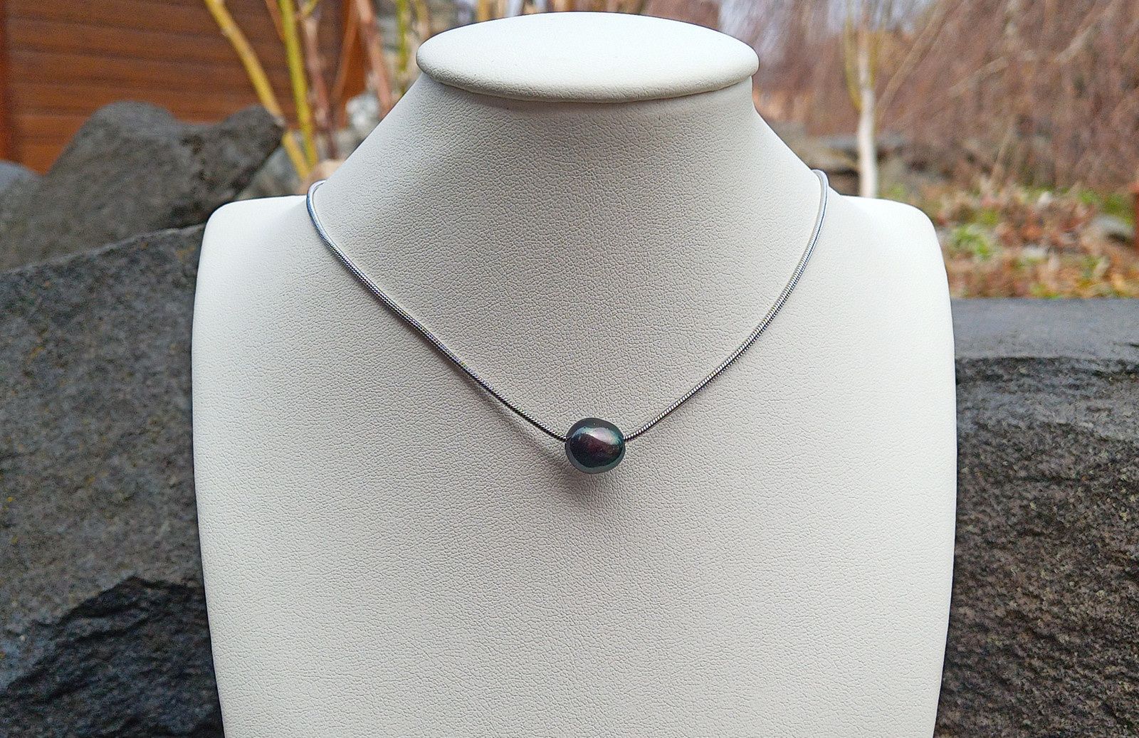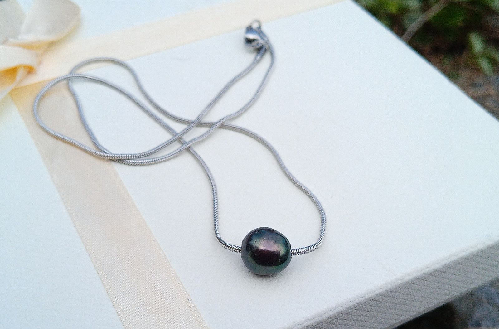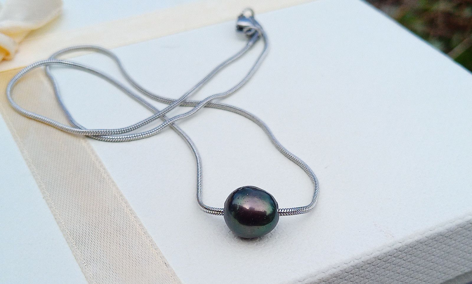 Tmavá dokonale lesklá jihomořská perla o velikosti 10 mm v AAA kvalitě zasazená do jemného řetízku z chirurgické oceli o délce 45 cm. V případě zájmu mohu přidělat prodlužovací řetízek. Perla vyniká nádhernými duhovými perleťovými odlesky do tmavě zelené.