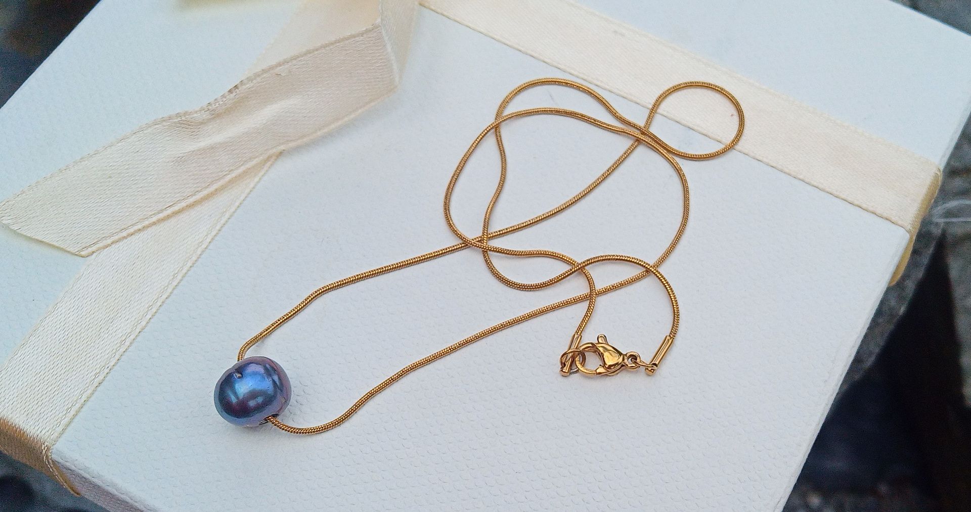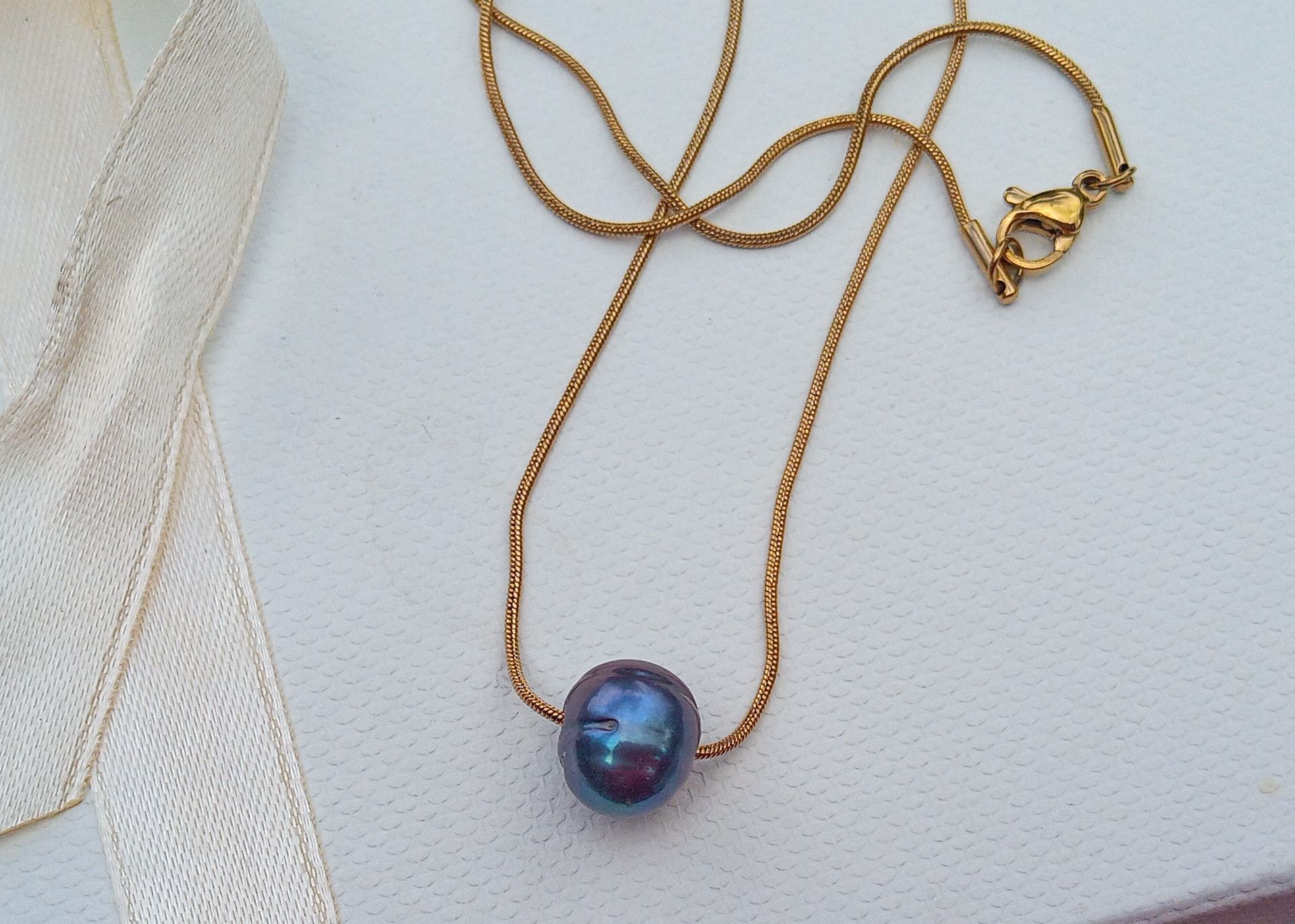 Tmavá dokonale lesklá jihomořská perla o velikosti 10 mm zasazená do jemného hadovitého pozlaceného řetízku z chirurgické oceli - hypoalergenní, vhodný i pro alergiky! Perla vyniká nádhernými duhovými perleťovými odlesky.