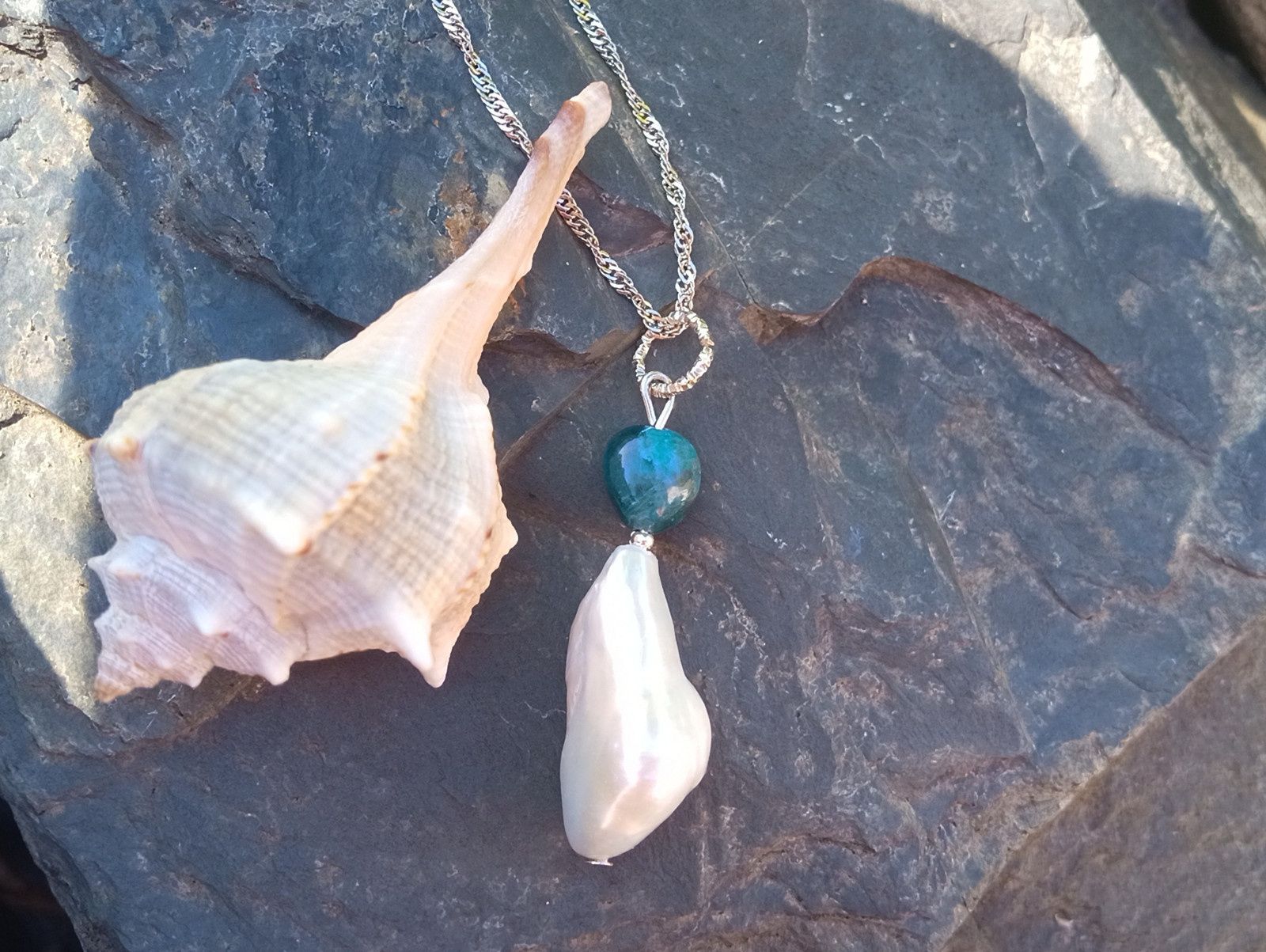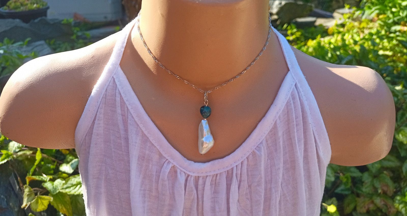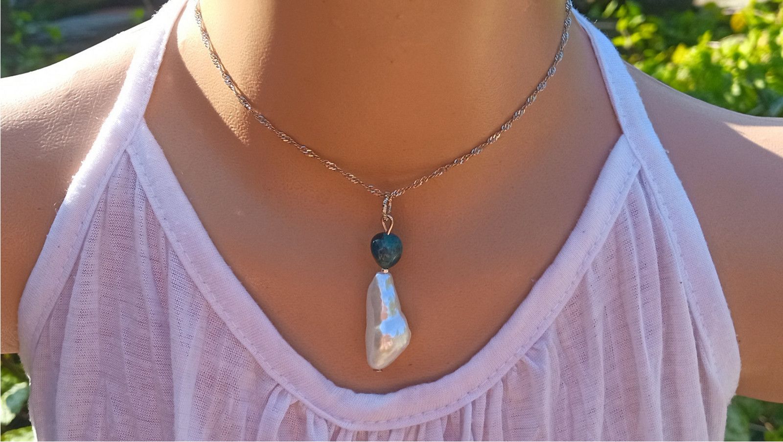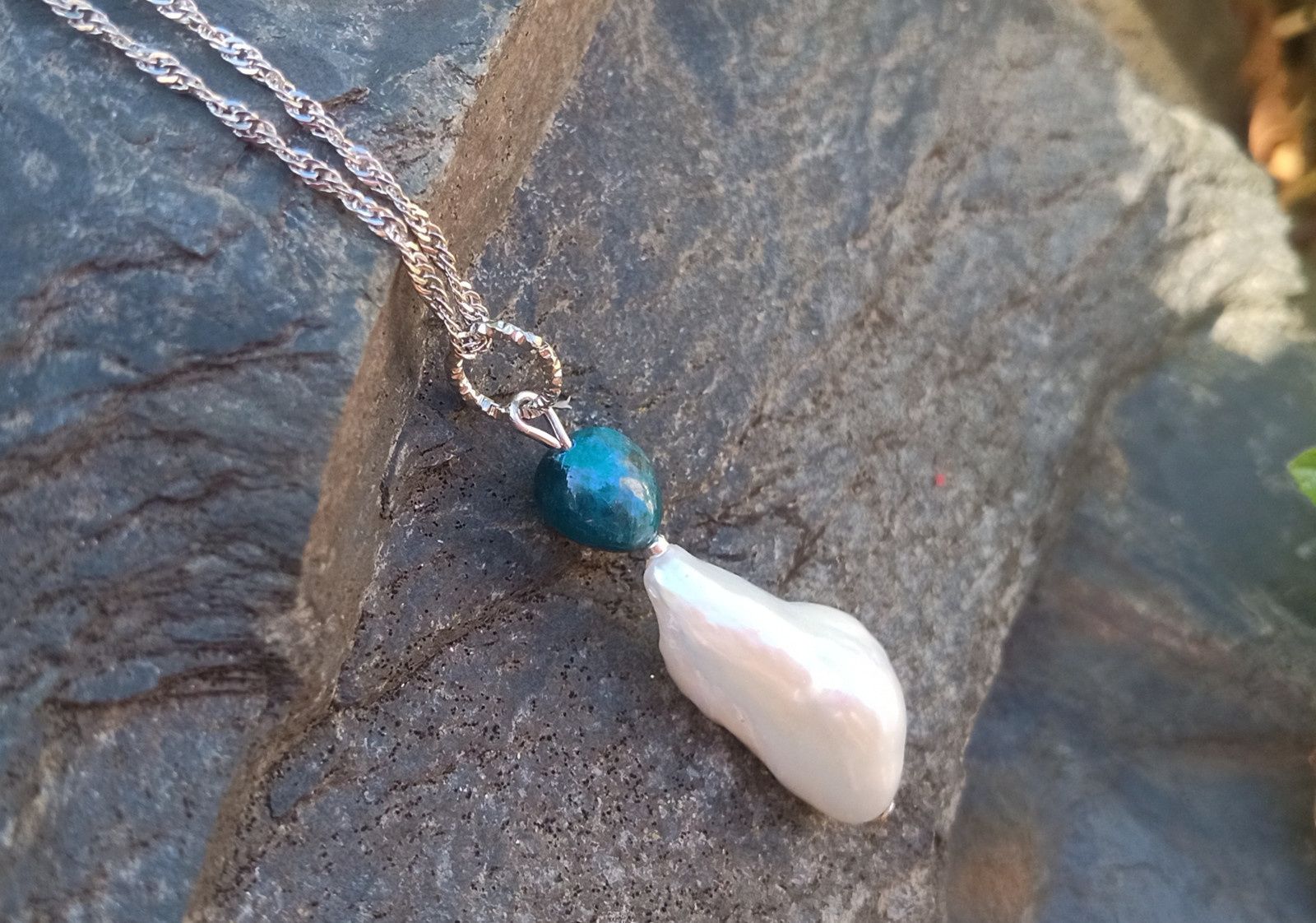 Velká dokonale lesklá biwa perla pod valounkem apatitu - přívěsek zavěšený na spirálově točeném ocelovém řetízku.
