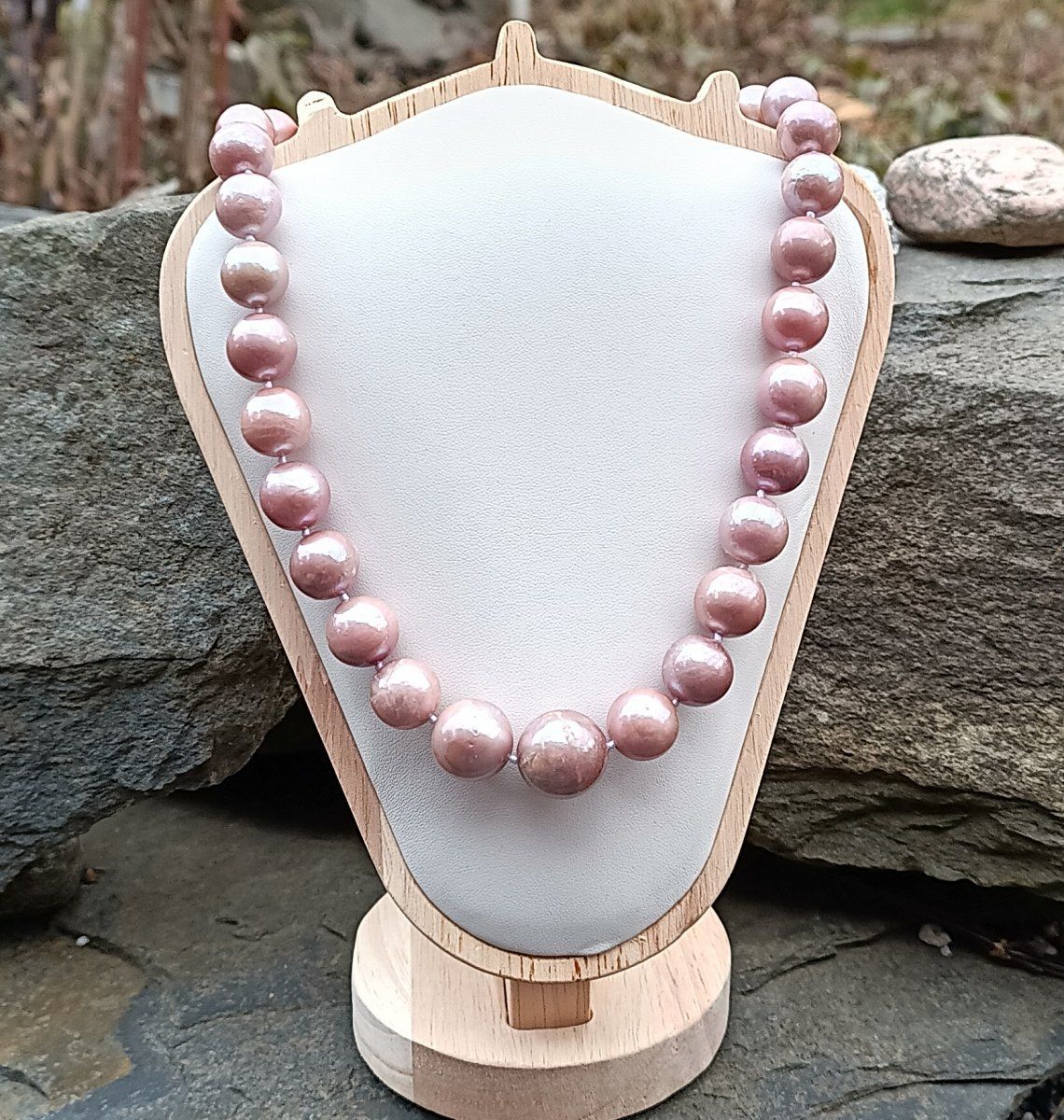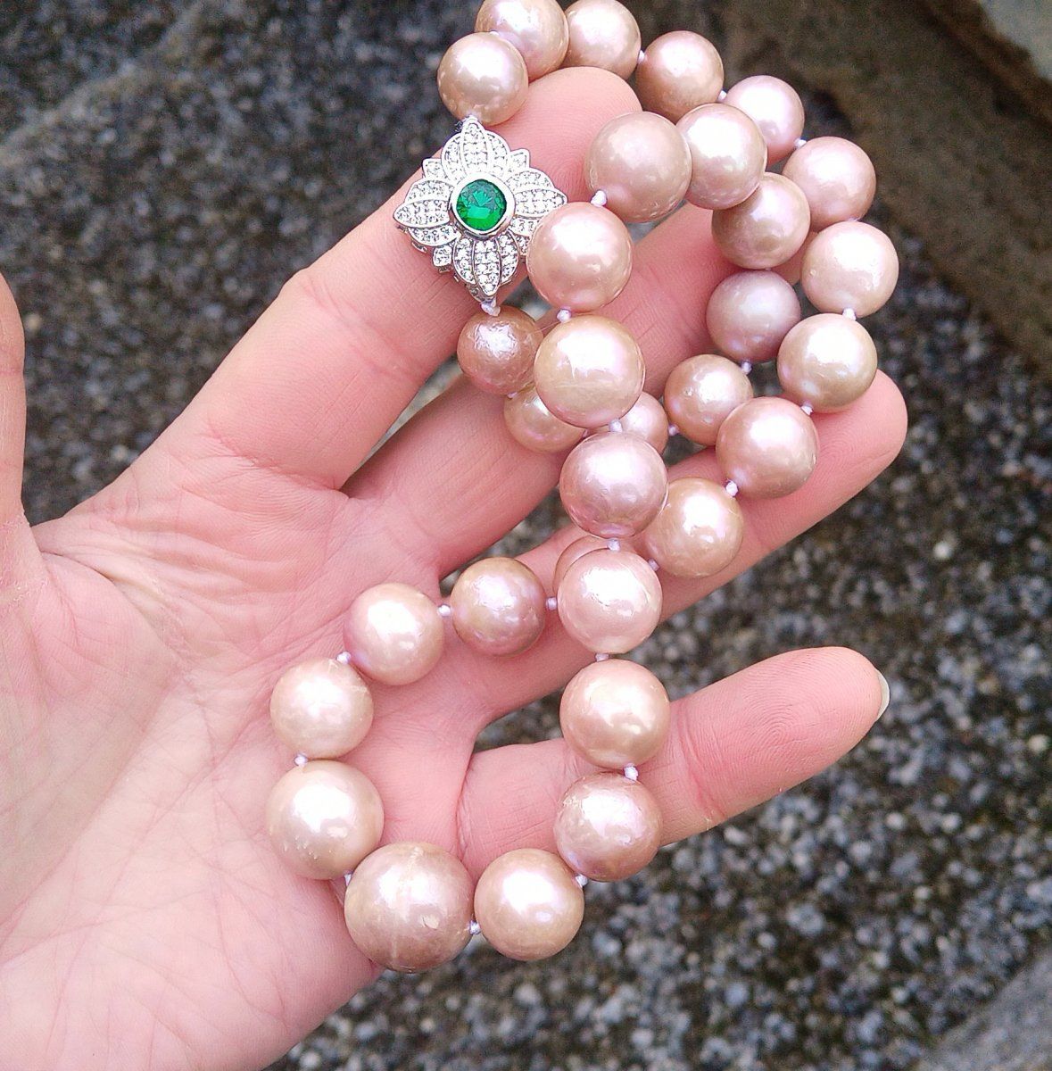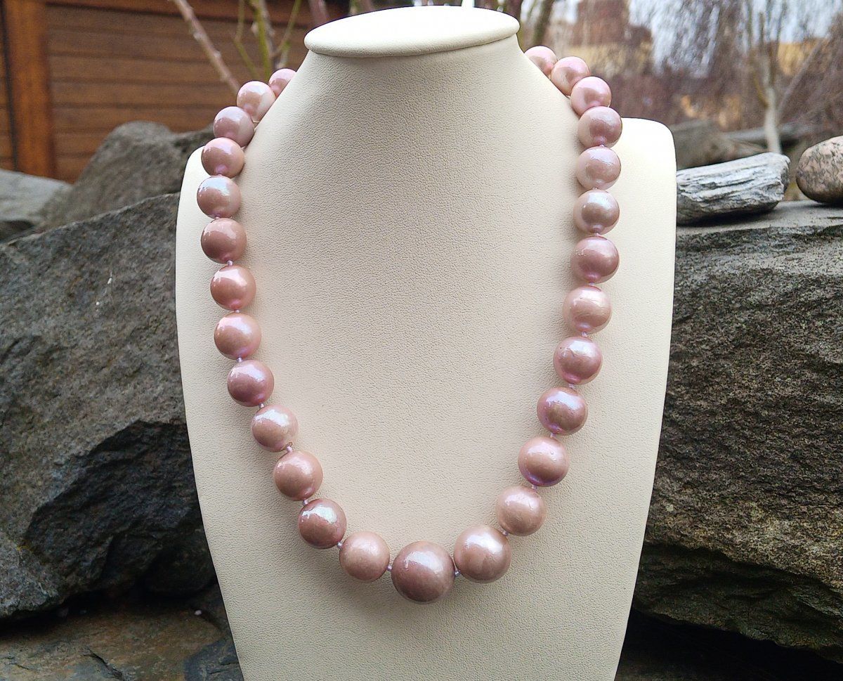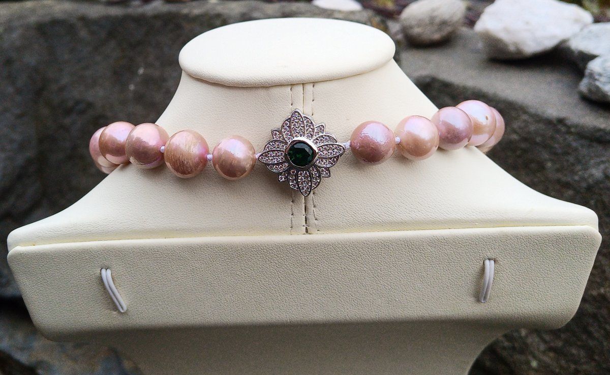 Náhrdelník vyrobený z obrovských levandulových nejvzácnějších mořských perel z Tichomoří poskládaných od největší po nejmenší o průměru 11-18 mm s ozdobným stříbrným zapínáním zdobeným broušeným smaragdem a spoustou drobných zirkonů. Jednotlivé perly jsou od sebe oddělené uzlíky proti vzájemnému odírání. Náhrdelník je luxusní, elegantní a nepřehlédnutelný. Perly vynikají nádherným leskem s duhovými perleťovými odlesky a jsou téměř dokonale kulaté v nejvyšší kvalitě.