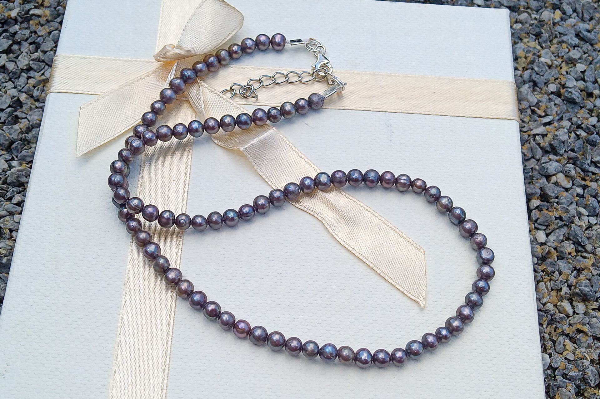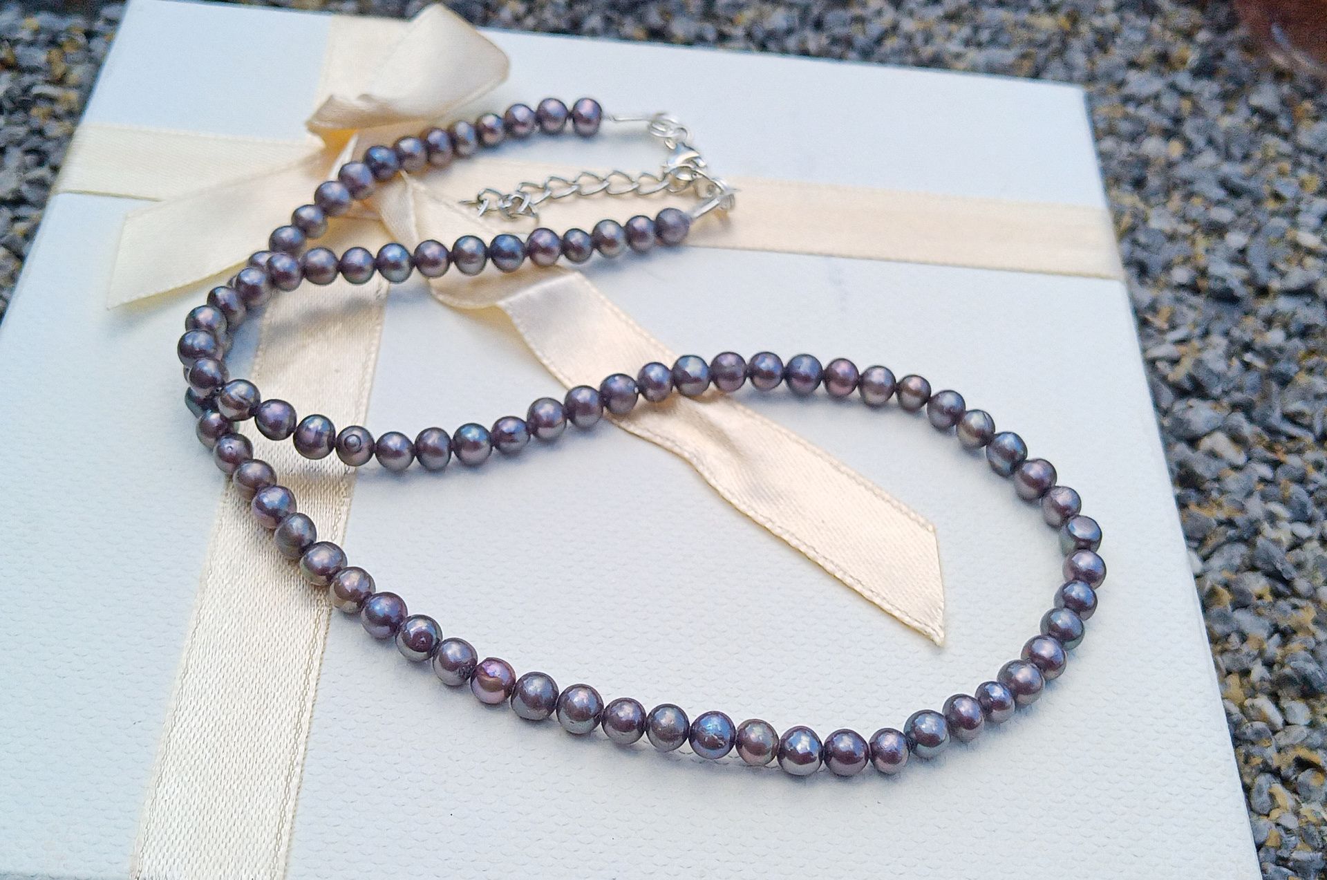 Šedé až antracitové south sea mořské perly o průměru cca 5 mm v náhrdelníku se zapínáním na karabinku z chirurgické oceli - hypoalergenní, vhodné i pro alergiky, doplněné o prodlužovací řetízek.