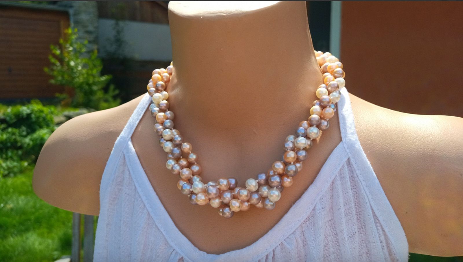 Fialkové, světle růžové a bílé téměř dokonale kulaté, nádherně lesklé south sea perly v AAA kvalitě v zamotaném třířadém náhrdelníku s pozlaceným zapínáním. Zapínání je na velmi pevný magnet, který výborně drží (osobně vyzkoušeno). Výhodou je pohodlné nandávání náhrdelníku.