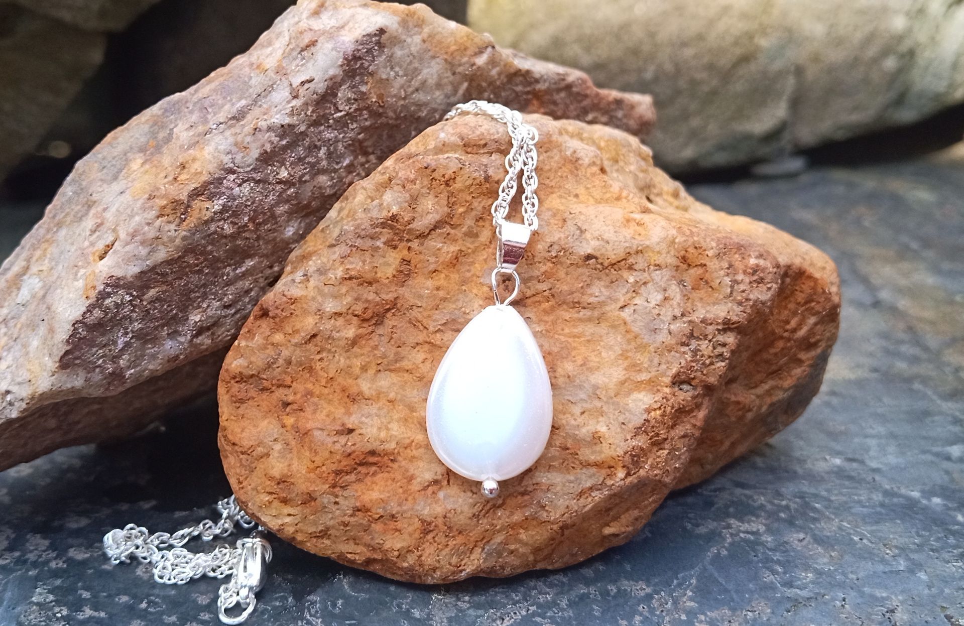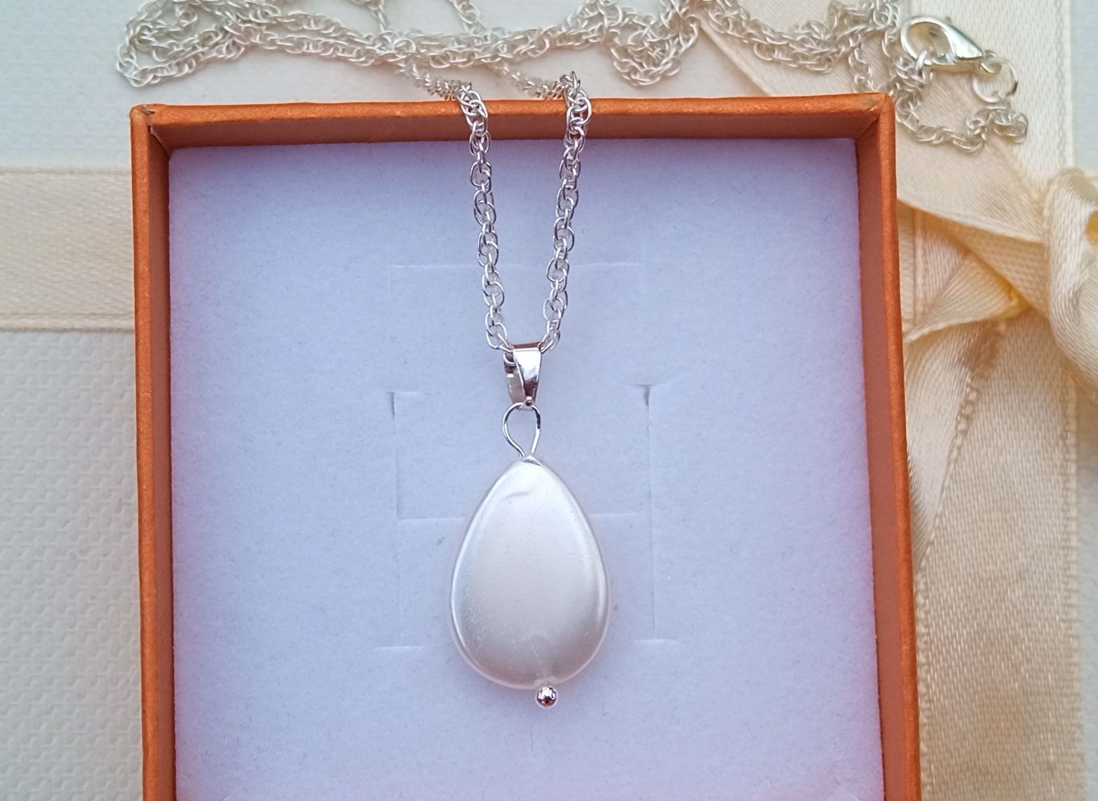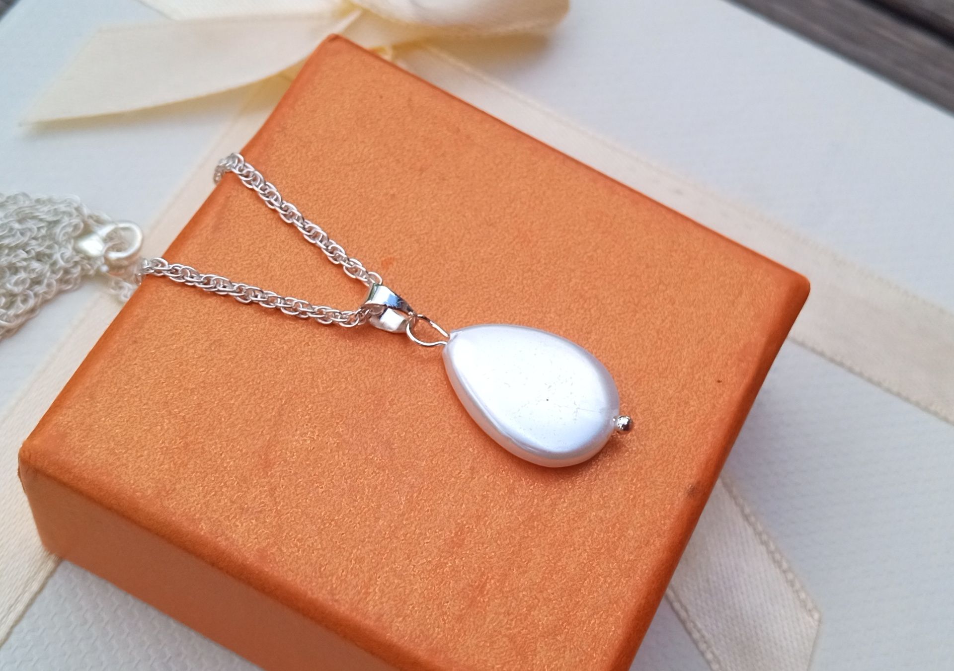 Přívěsek ve tvaru kapky o velikosti 14x12 mm vyrobený z bílé přírodní perletě na spirálově točeném jemném řetízku o délce 46 cm. V případě zájmu lze přidělat prodlužovací řetízek.