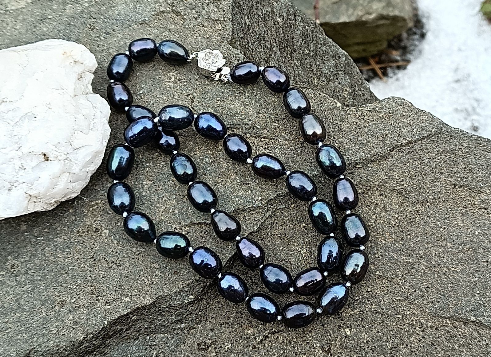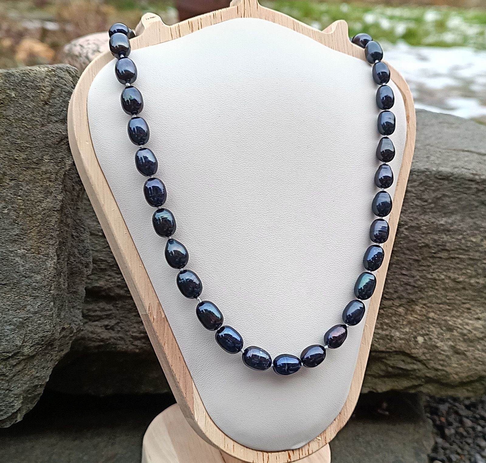 Temně modré říční dokonale lesklé perly o velikosti cca 10 mm v nejvyšší kvalitě v náhrdelníku s ozdobným bezpečnostním zapínáním ve tvaru růžičky. Perly vynikají nádhernými perleťovými duhovými odlesky!