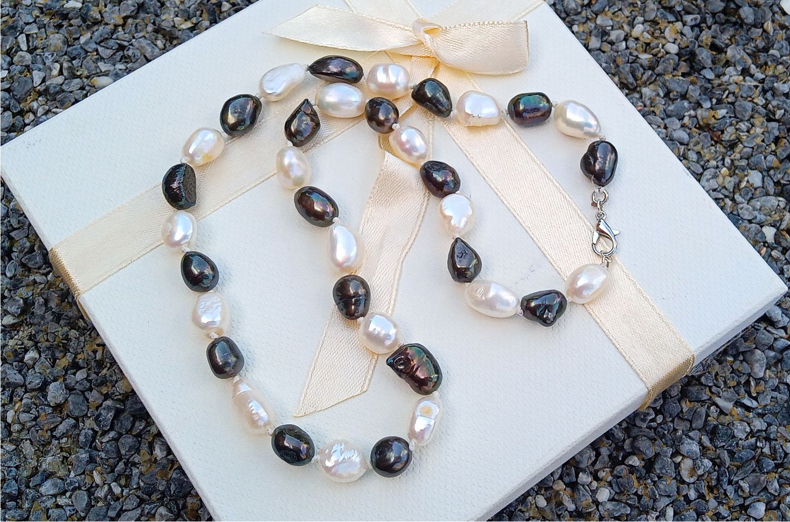 Velké říční perly uzlíkovaný perlový náhrdelník černobílý