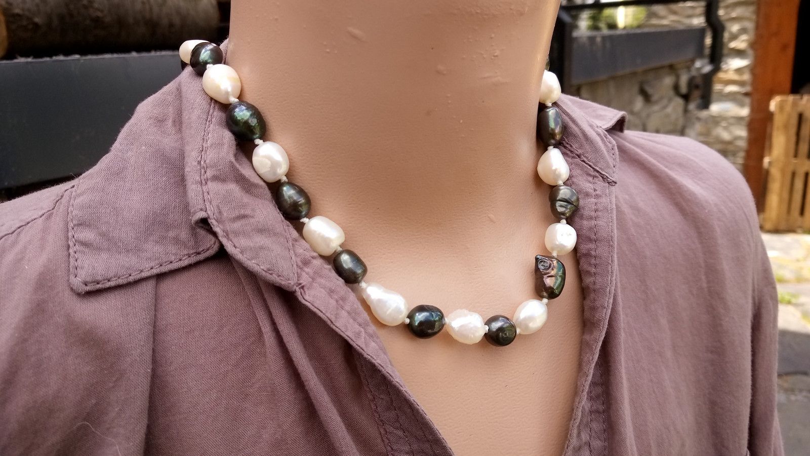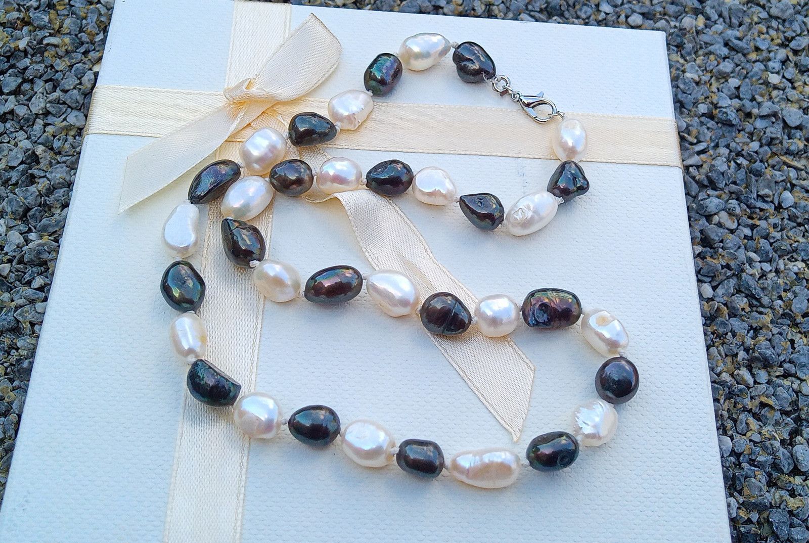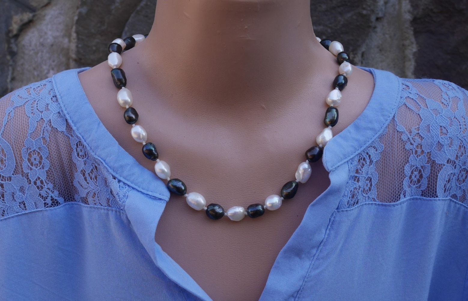 Vyvazovaný náhrdelník z bílých a černých barokních dokonale lesklých říčních perel o velikosti cca 11-14 mm s nádhernými duhovými perleťovými odlesky se zapínáním na ocelovou krabinku.