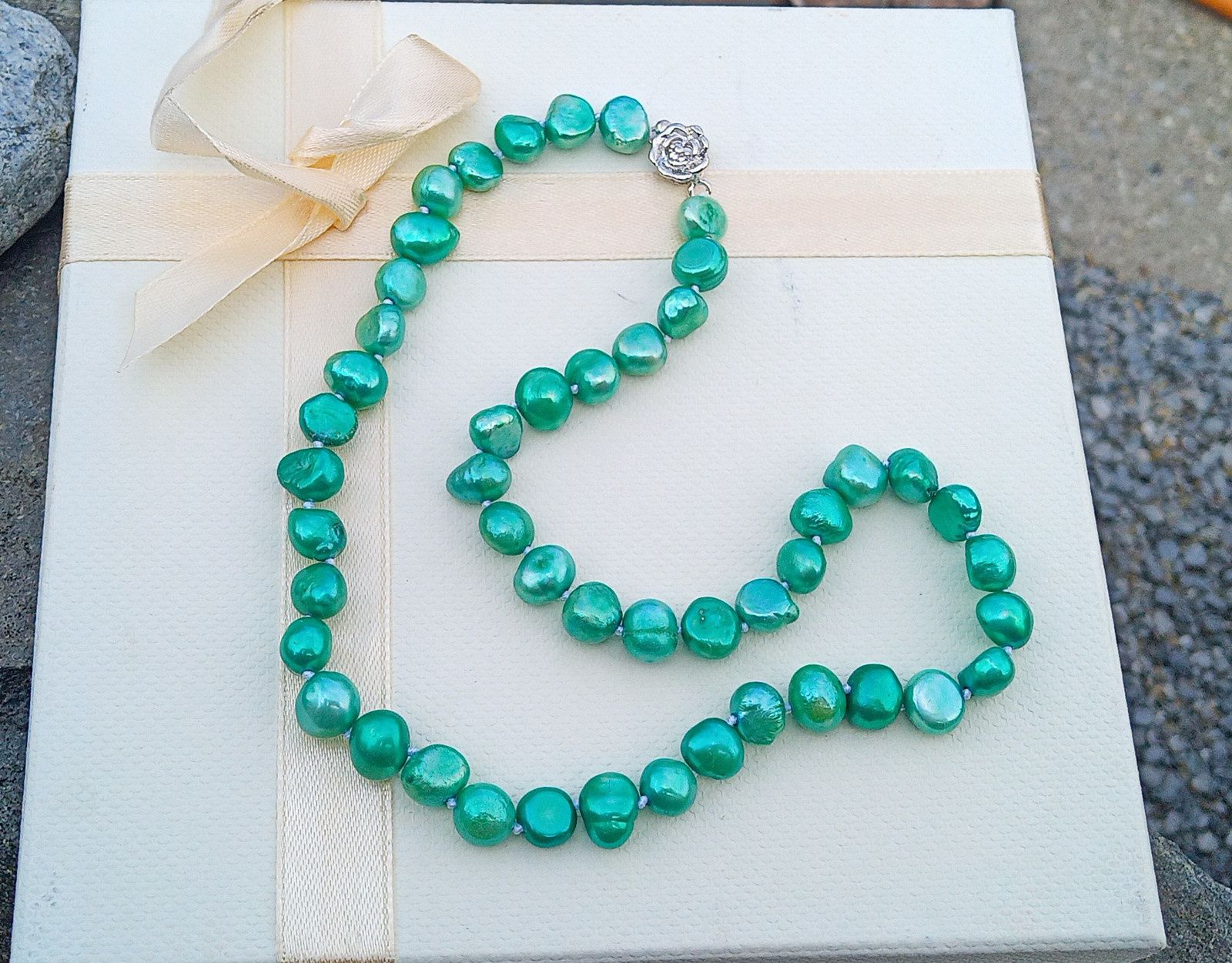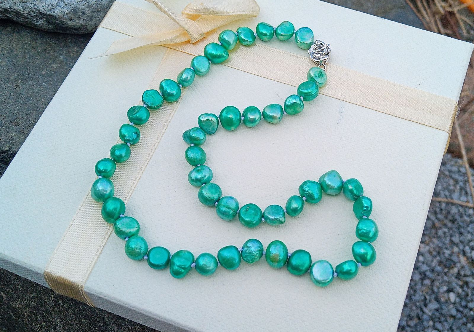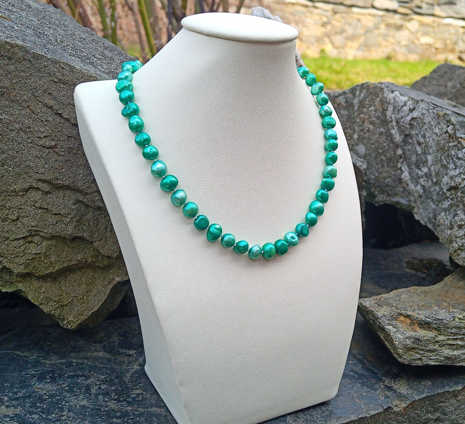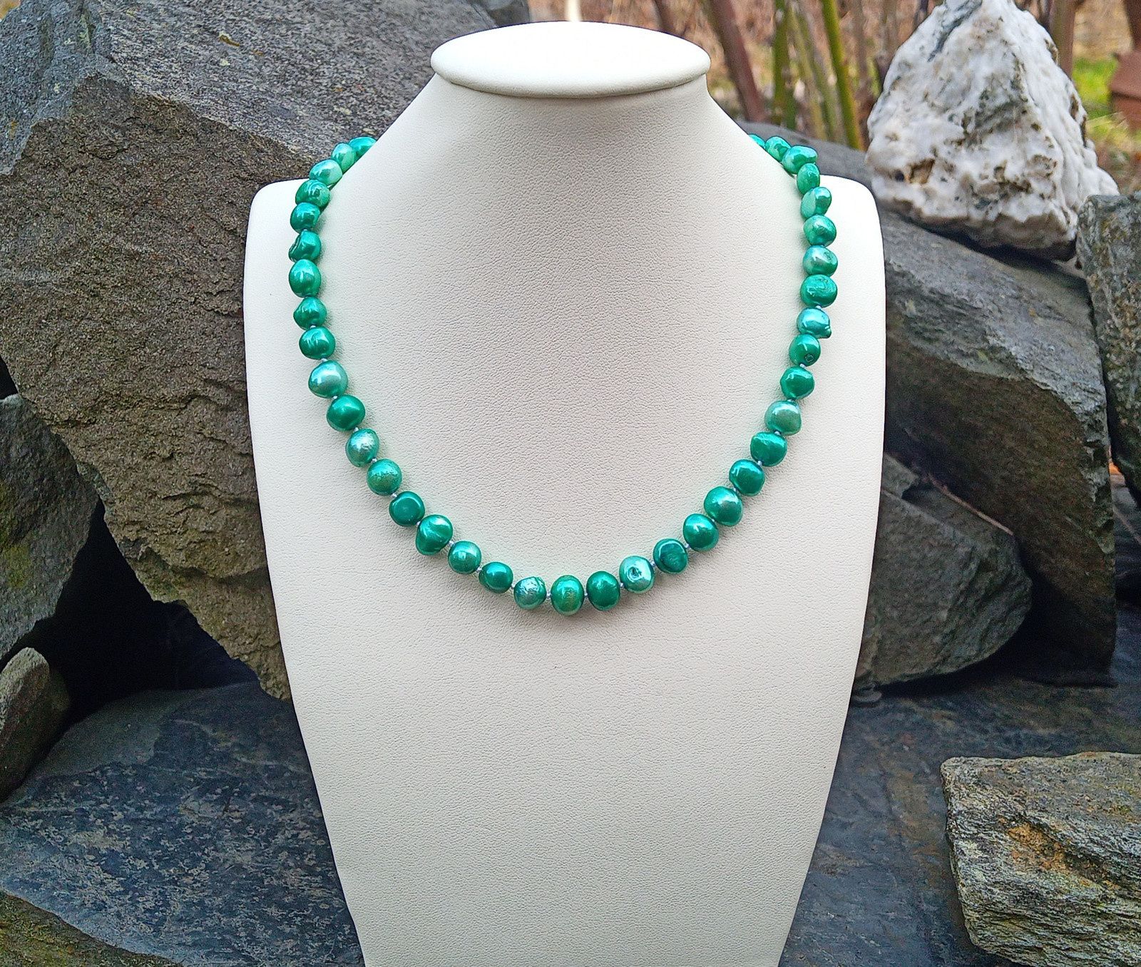 Dokonale lesklé říční perly v zelené barvě o průměru cca 8 mm v elegantním náhrdelníku s okrasným zapínáním ve tvarů růžičky. Jednotlivé perličky jsou od sebe oddělené uzlíky proti vzájemnému odírání.