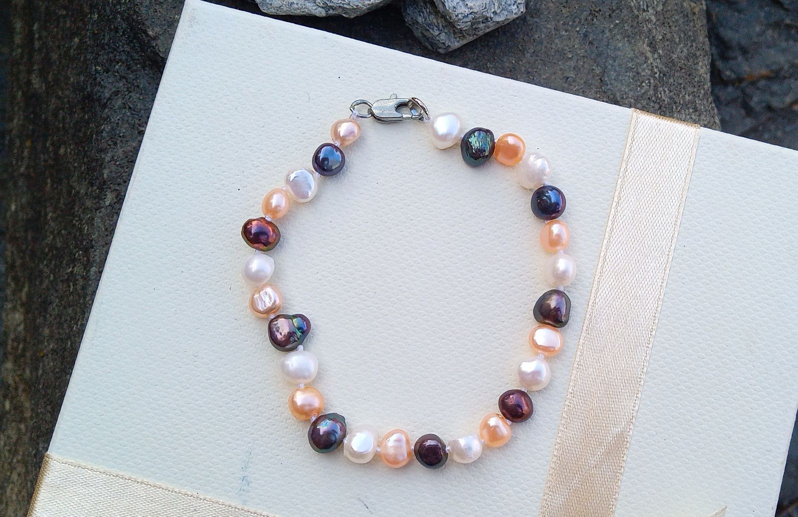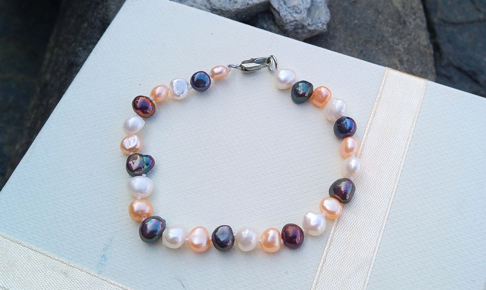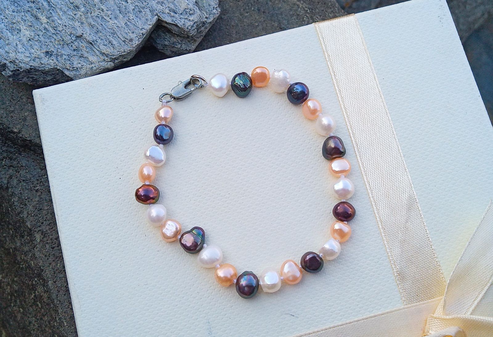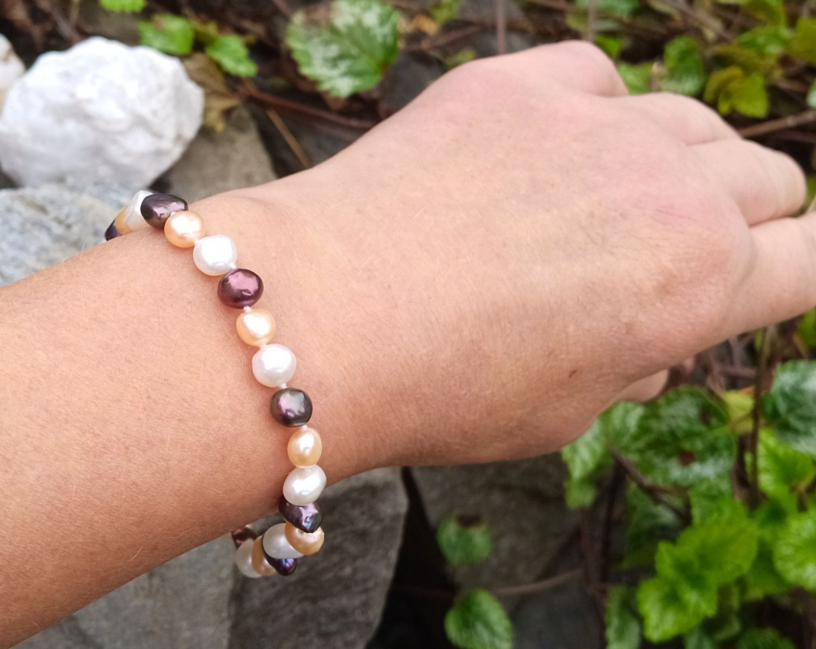 Říční dokonale lesklé perličky o velikosti cca 6-7 mm v bílé, růžové a antracitové barvě s duhovými perleťovými odlesky v náramku se zapínáním na úzkou karabinku z chirurgické oceli - hypoalergenní, vhodná i pro alergiky.
