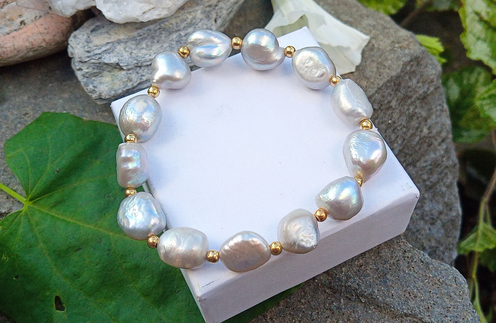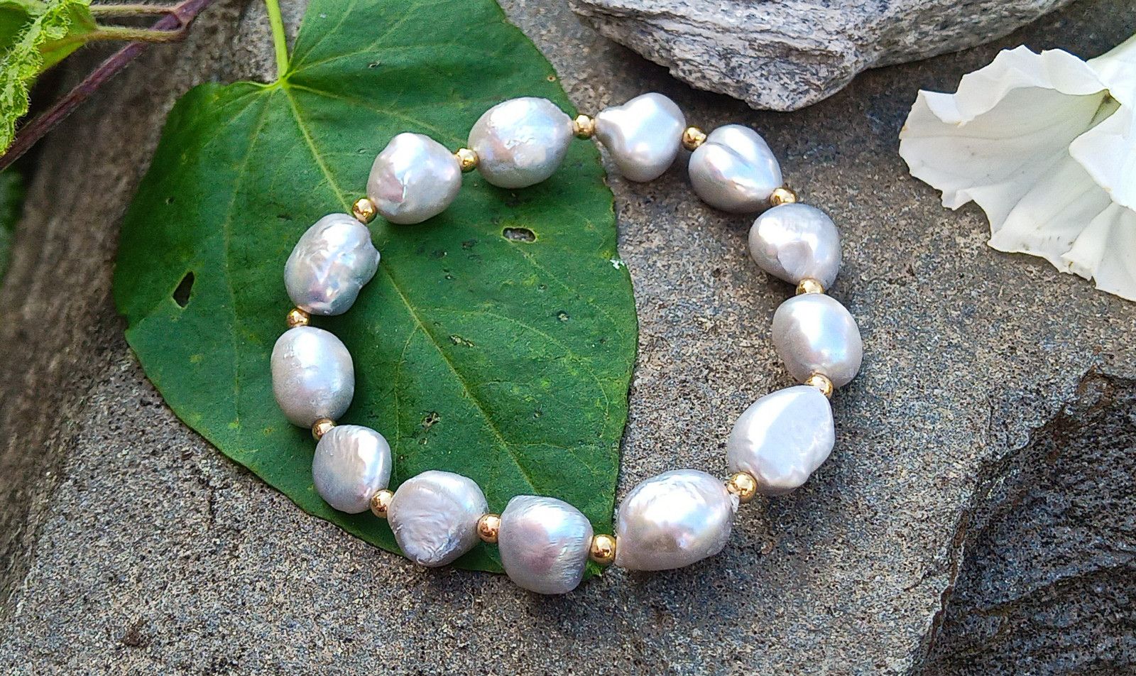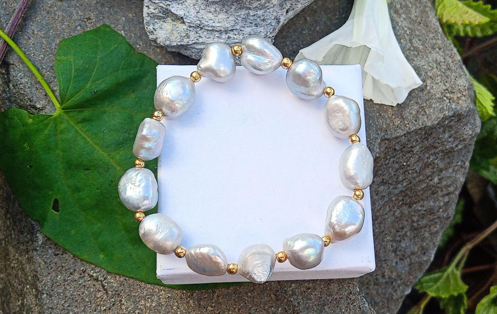 Dokonale lesklé velké říční perly ve světle šedé až šedostříbrné barvě s nádhernými perleťovými odlesky zdobené drobnými pozlacenými korálky na kvalitním pružném návleku.