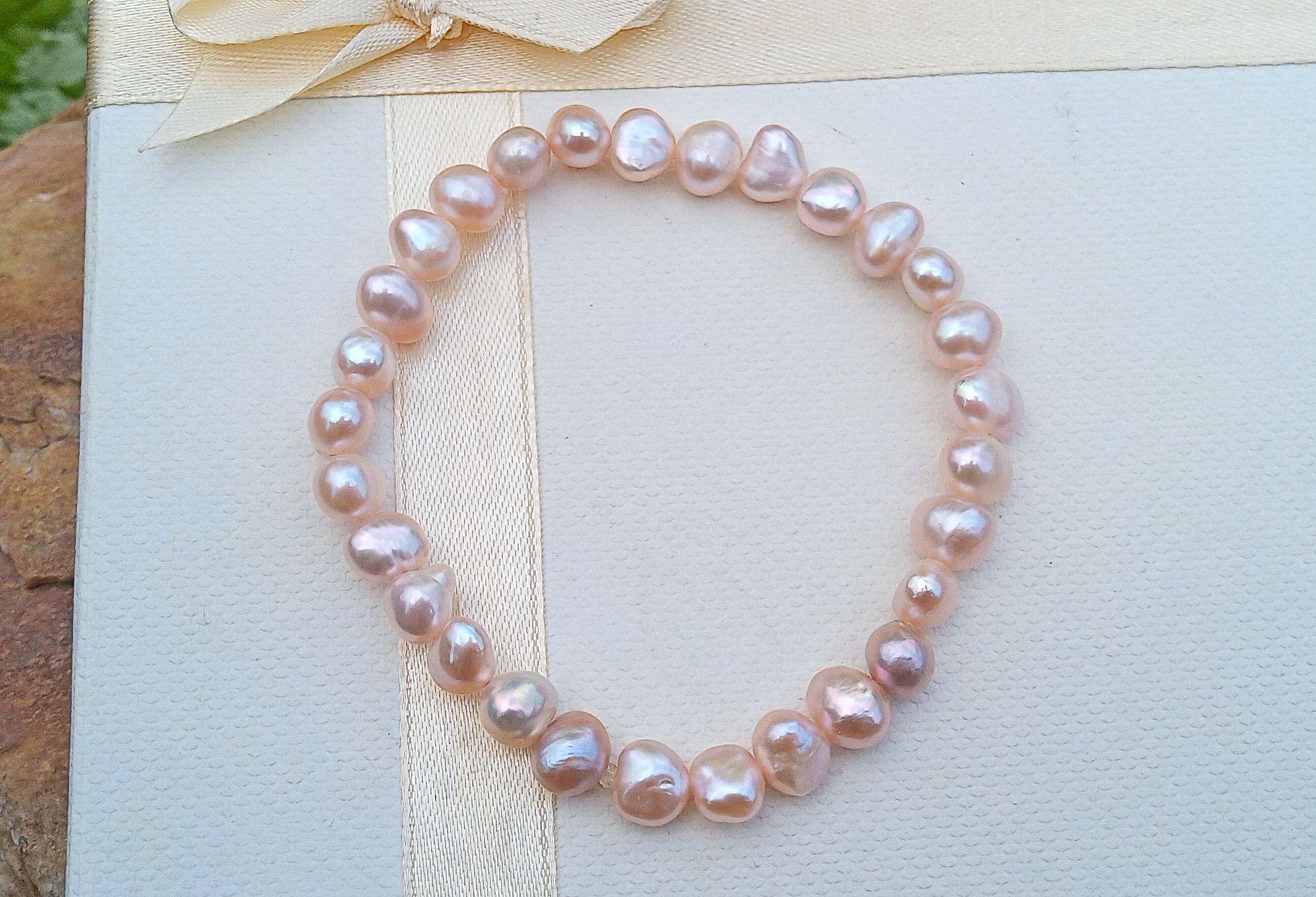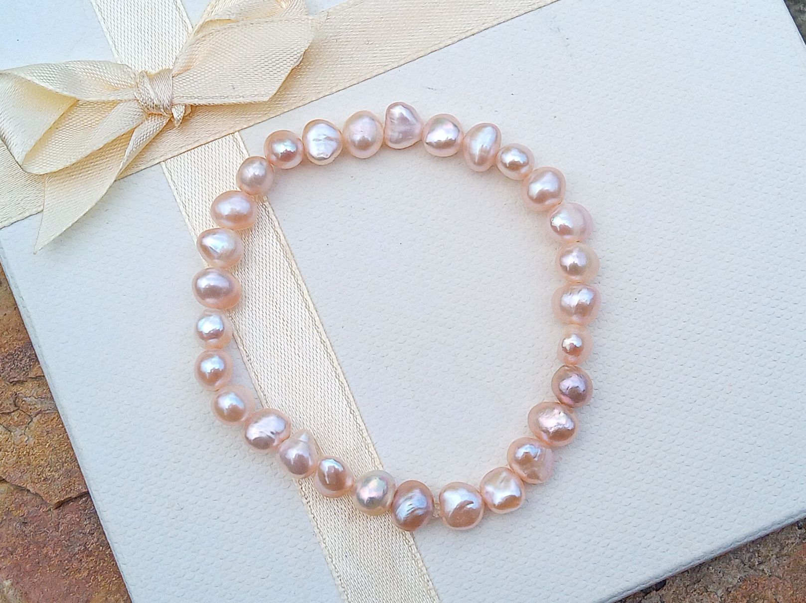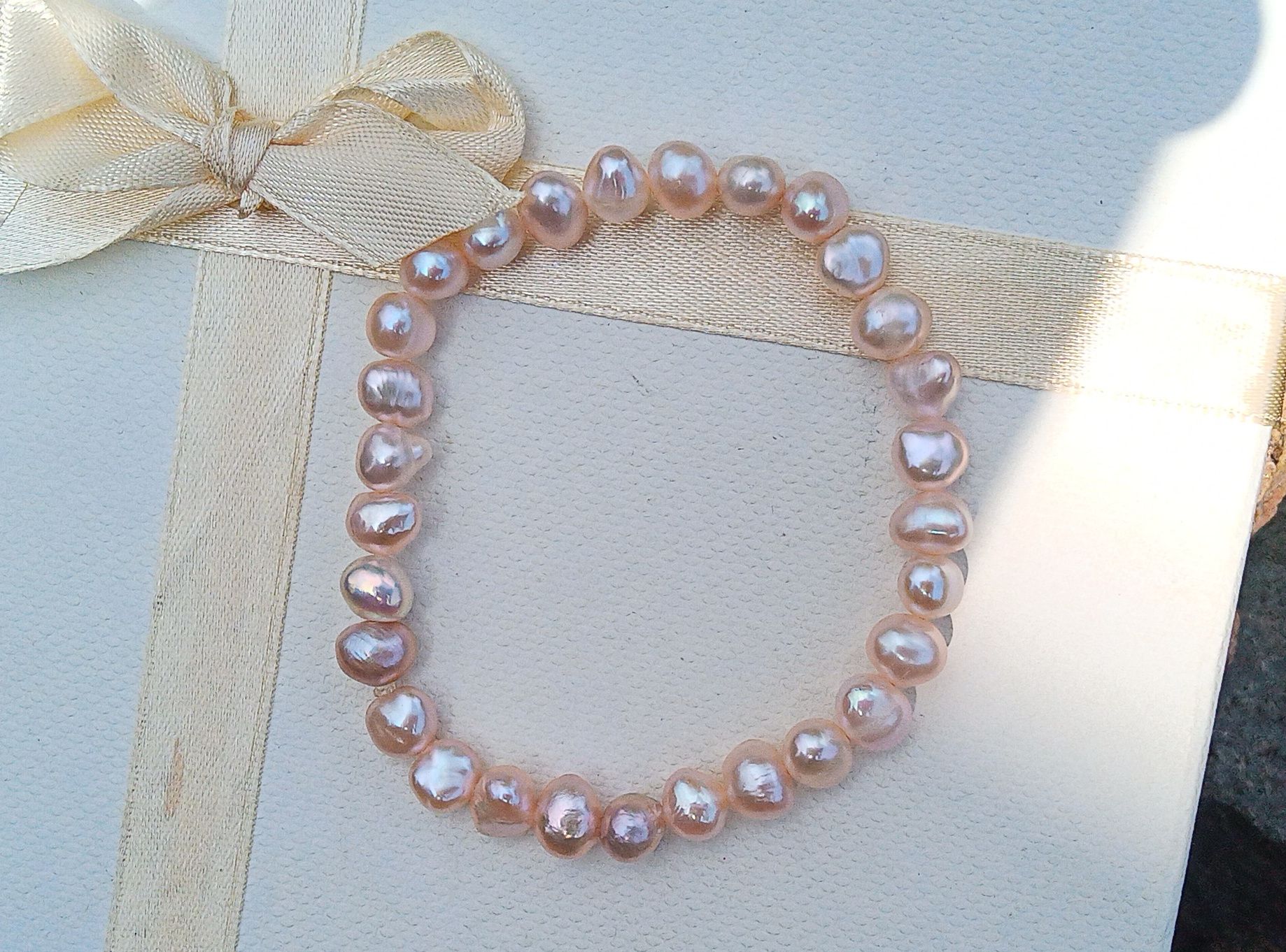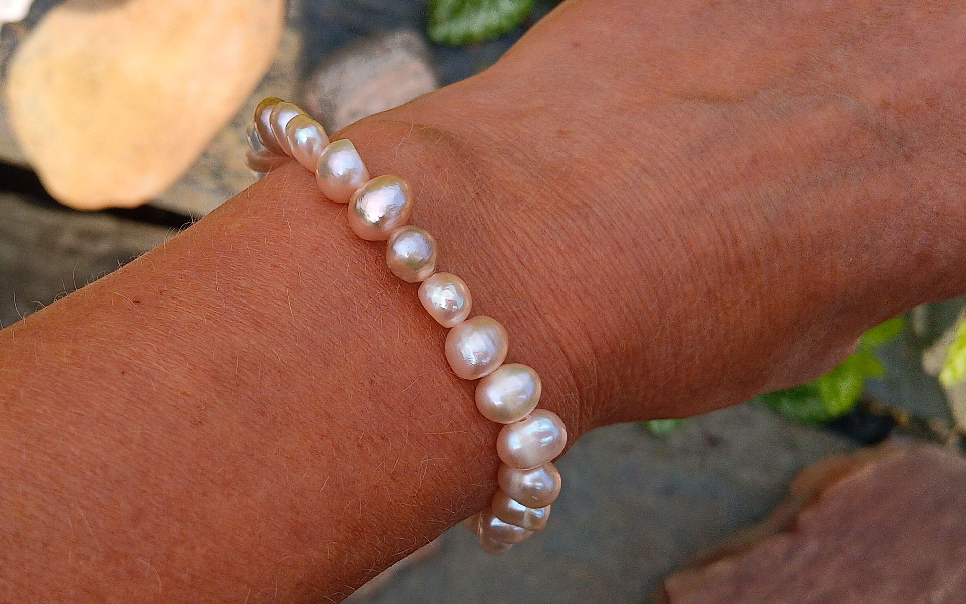 Říční dokonale lesklé perličky o velikosti cca 7-8 mm ve světle růžové barvě s nádhernými duhovými perleťovými odlesky v pružném elegantním náramku.