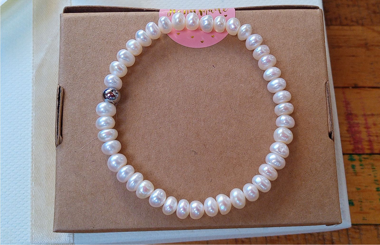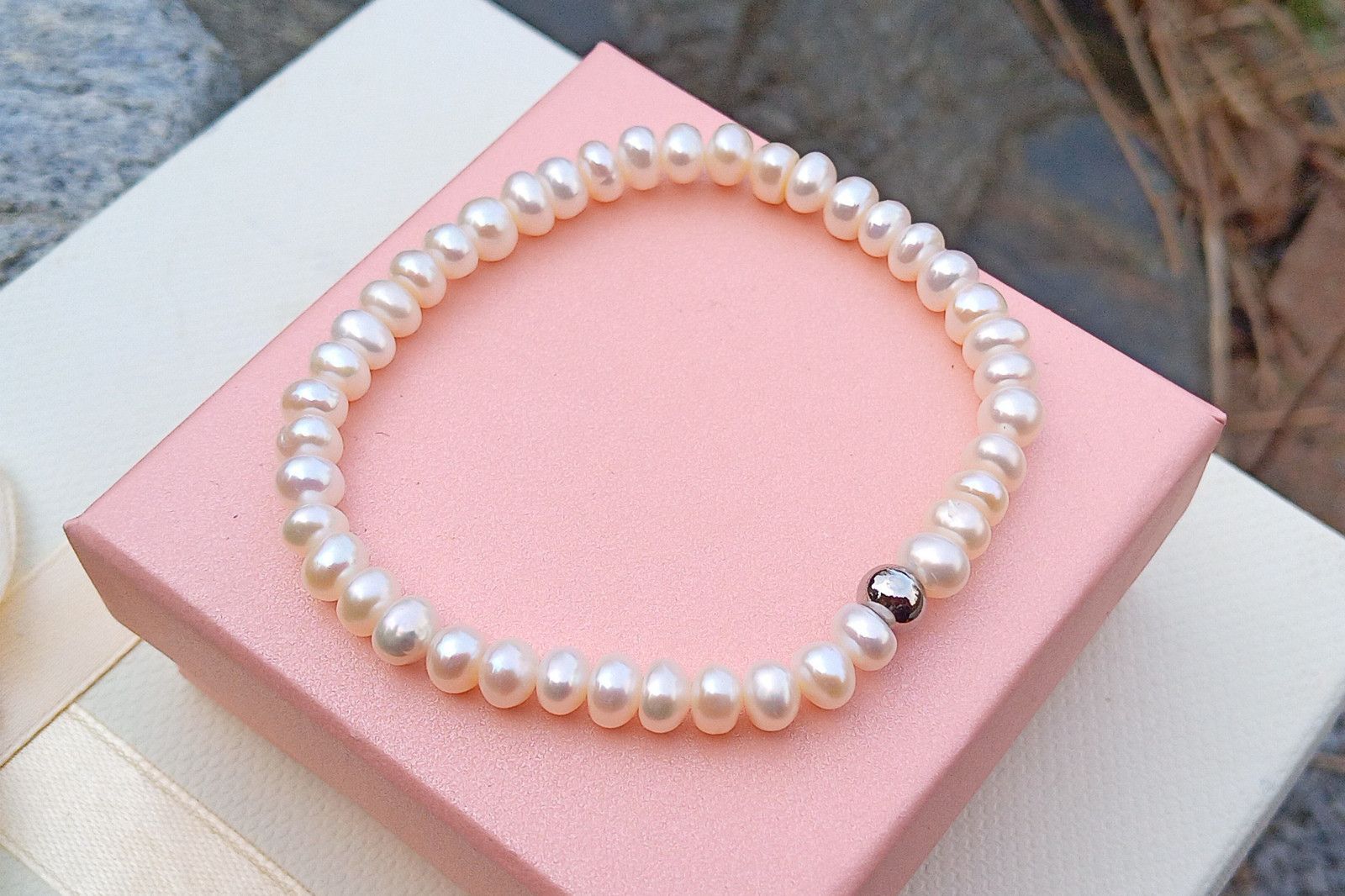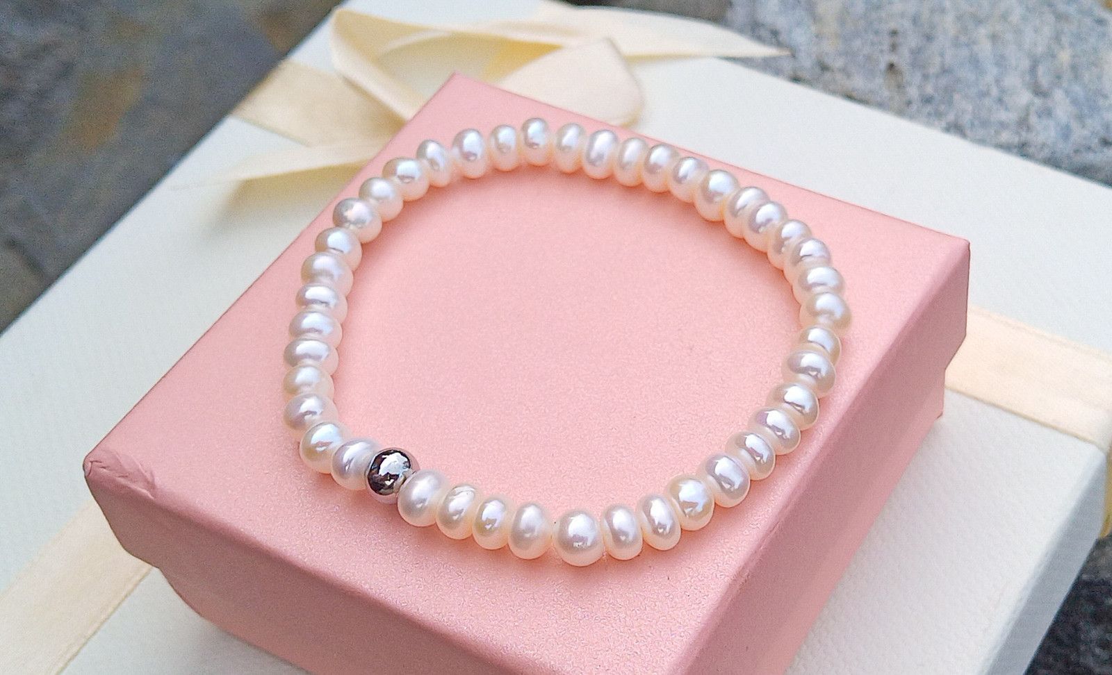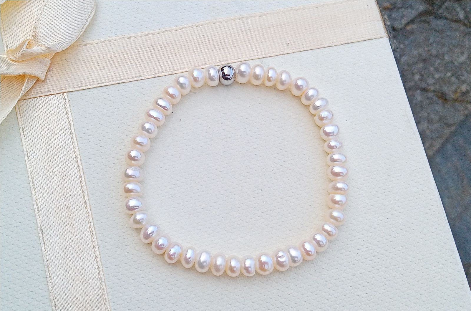 Náramek z prvotřídních dokonale lesklých bílých říčních perliček o velikosti 6 mm na kvalitním pružném silikonovém návleku zdobený korálkem z chirurgické oceli. Perly jsem do náramku vybrala v nejvyšší kvalitě. Typ perel button.