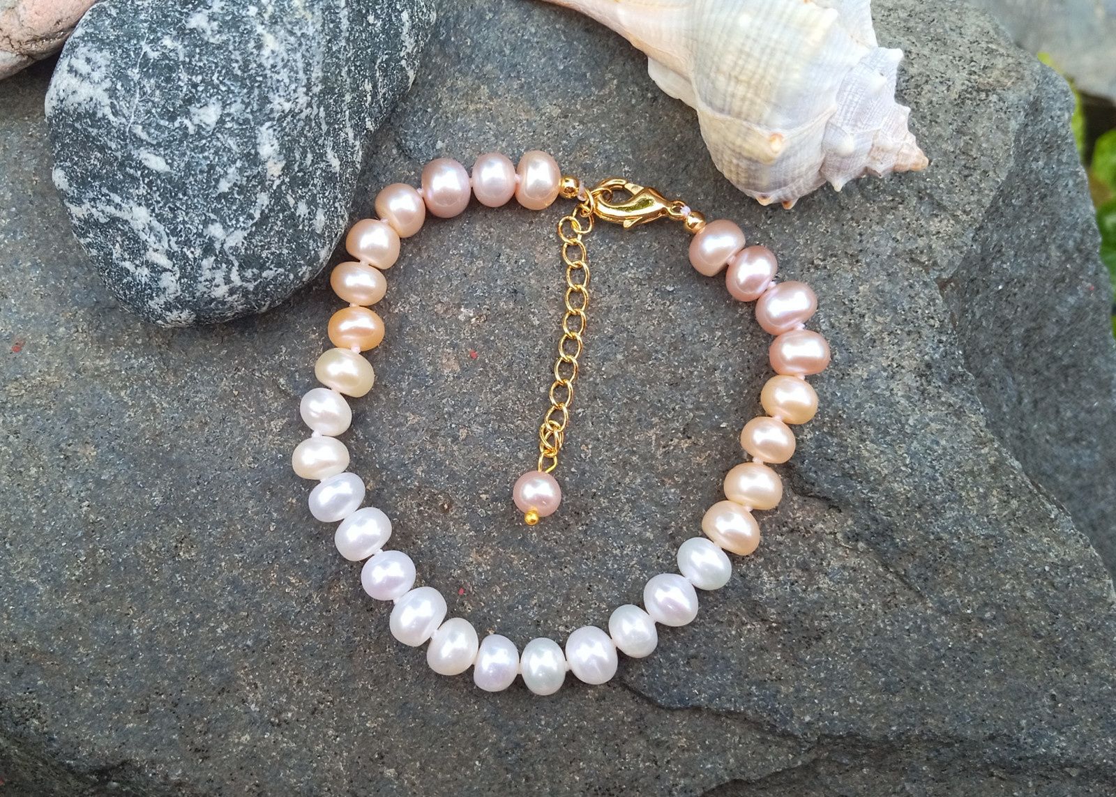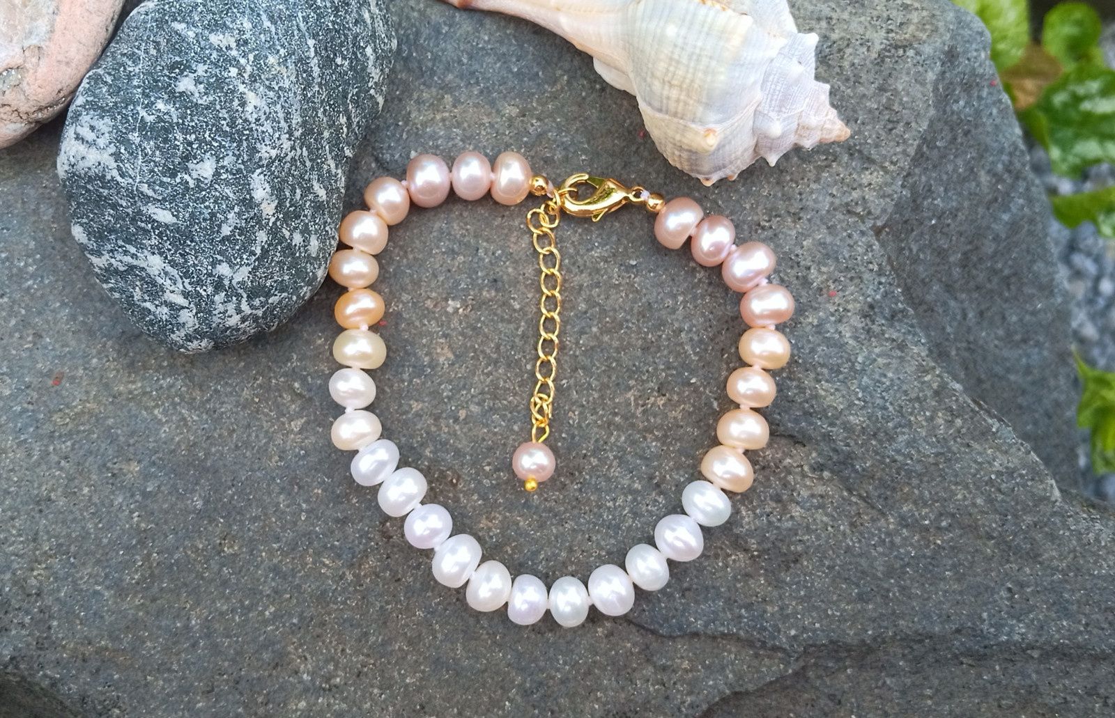 Náramek z prvotřídních dokonale lesklých tříbarevných říčních perliček o velikosti 6 mm poskládaných jako duha od fialové přes růžovou uprostřed s bílými perlami a zase růžová a světle fialková. Náramek je zapínací na pozlacenou karabinku s prodlužovacím řetízkem ukončeným fialkovou perličkou.