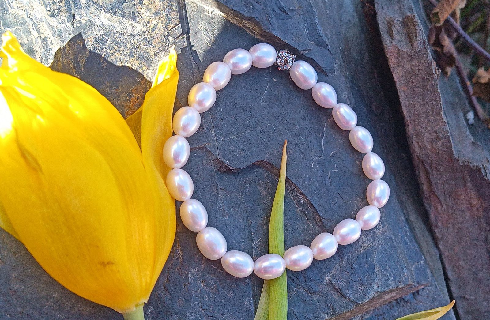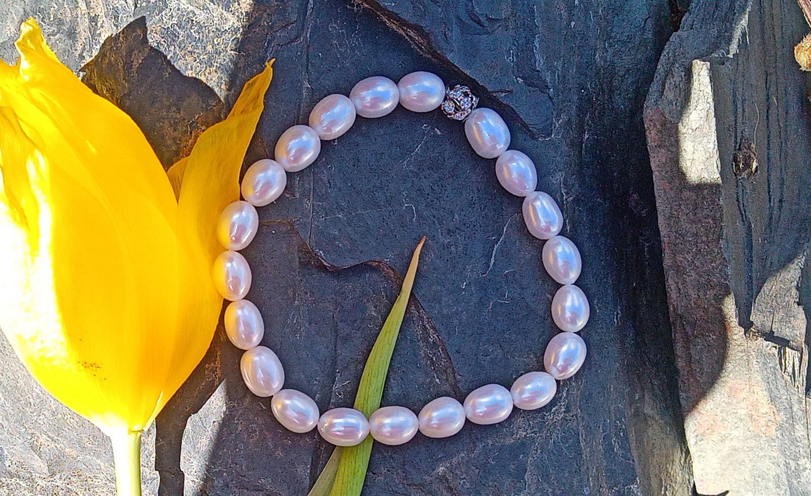 Náramek z prvotřídních dokonale lesklých říčních perliček o velikosti cca 9 mm na kvalitním pružném silikonovém návleku. Perly jsem do náramku vybrala v nejvyšší kvalitě, bez rýh a jiných nedokonalostí, jsou téměř stejného tvaru i velikosti.