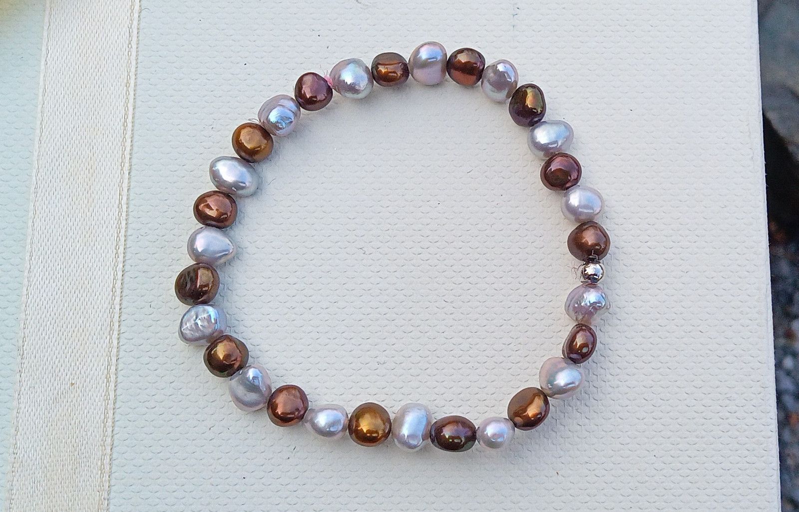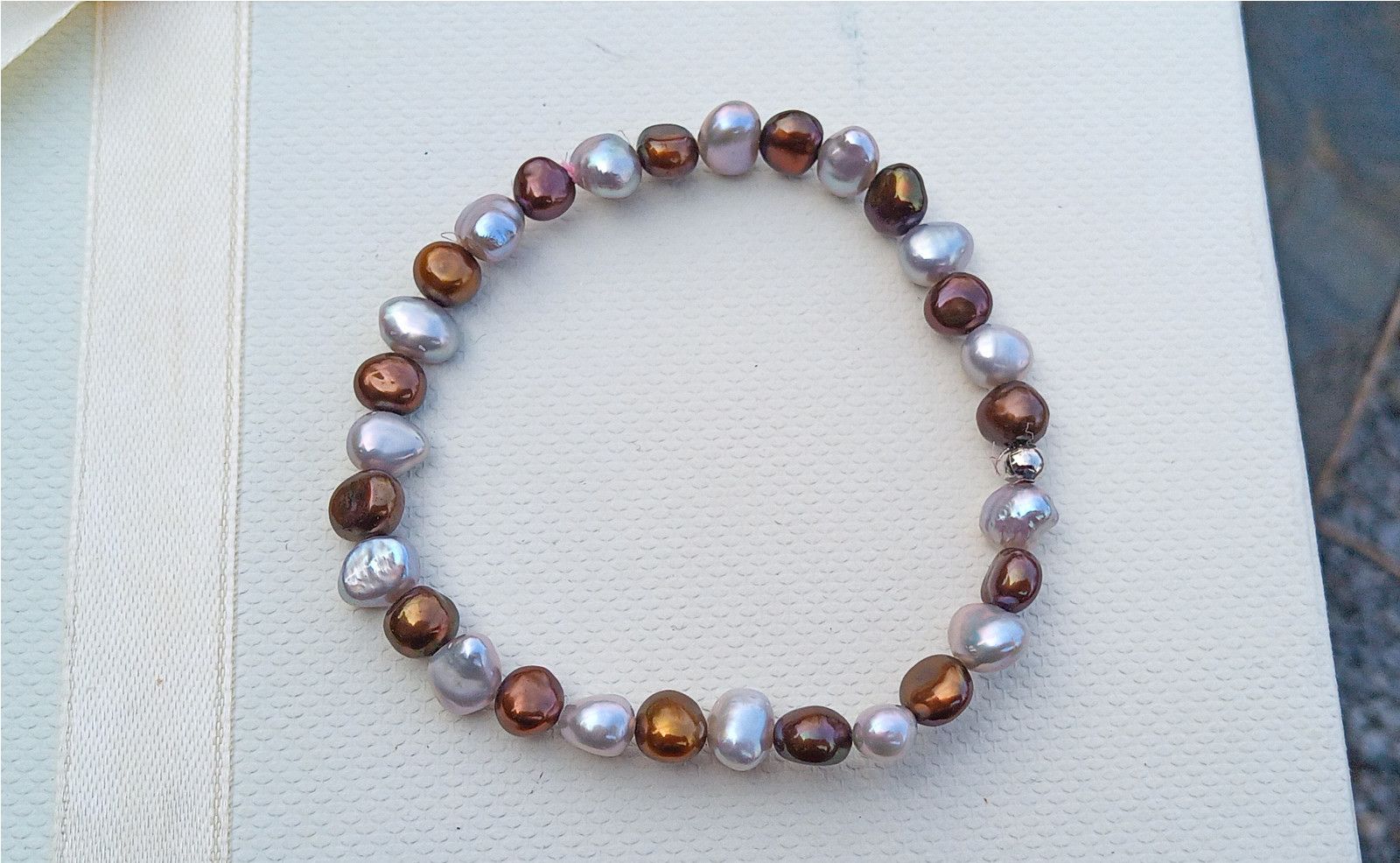 Říční dokonale lesklé perličky o velikosti cca 6 mm ve světle šedé a hnědé barvě v elegantním pružném náramku.