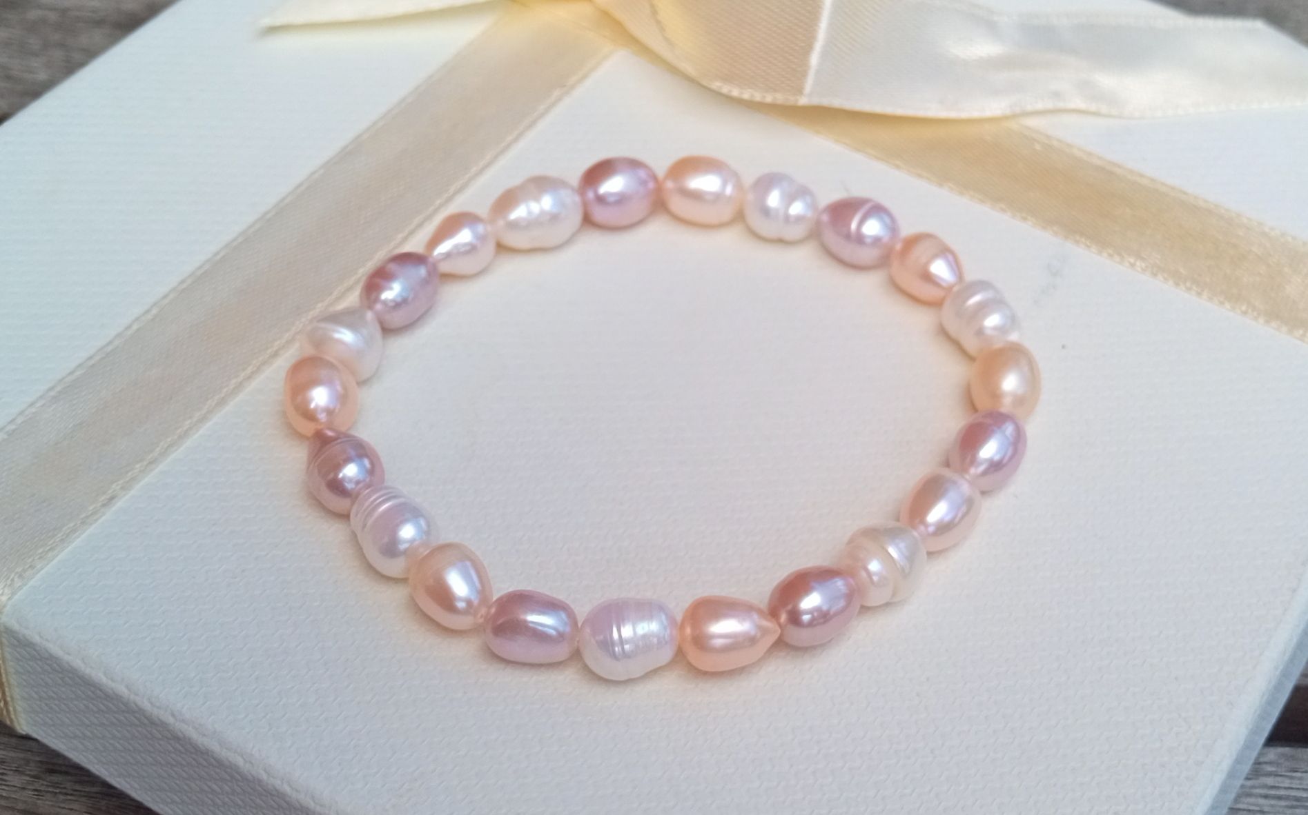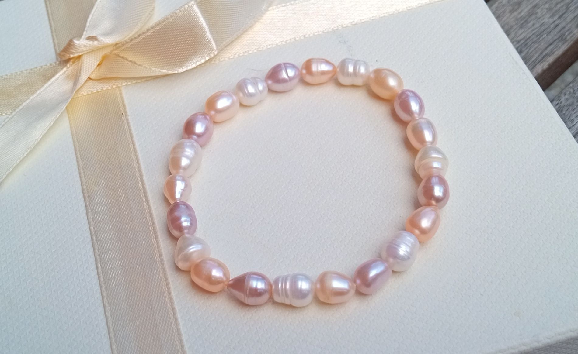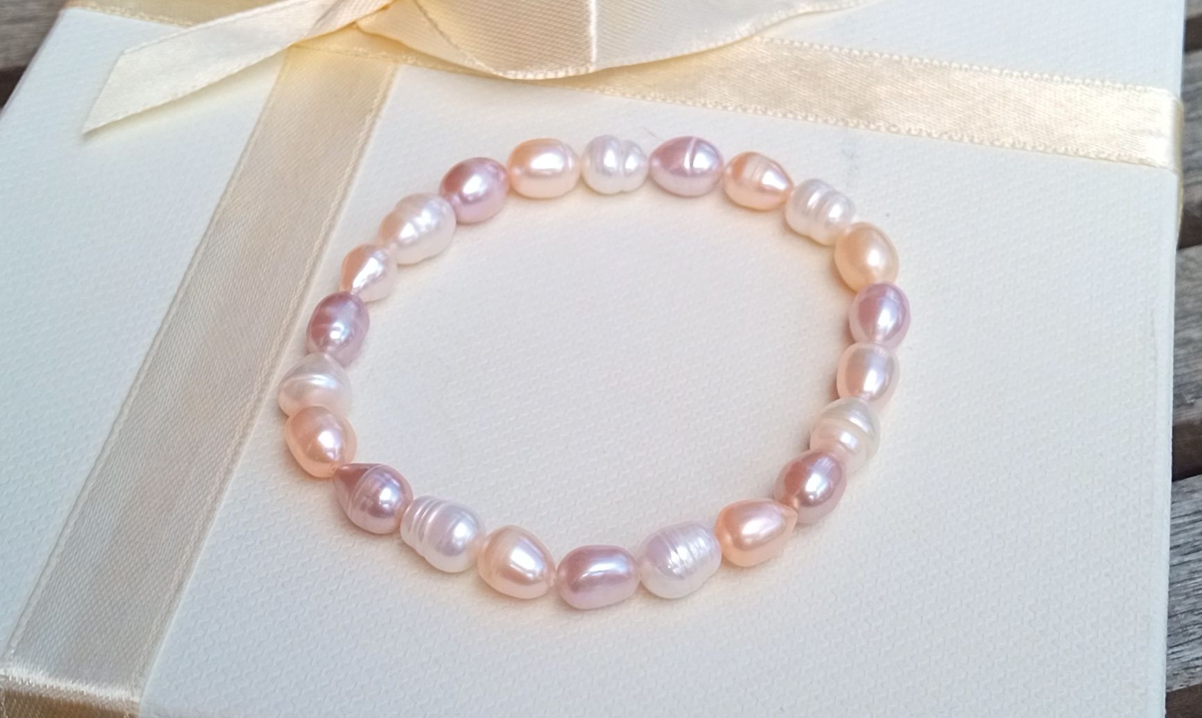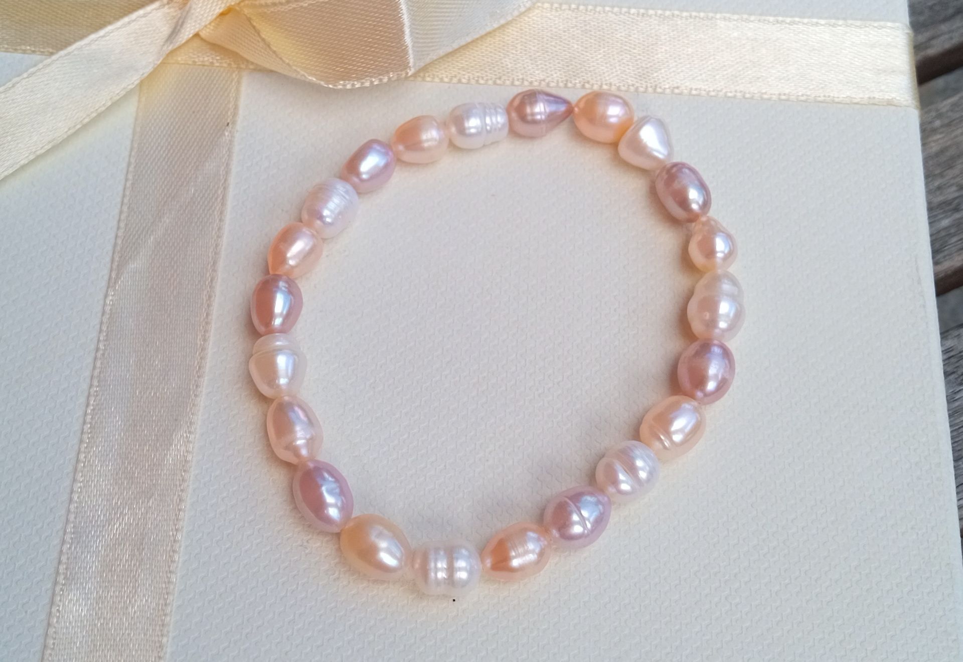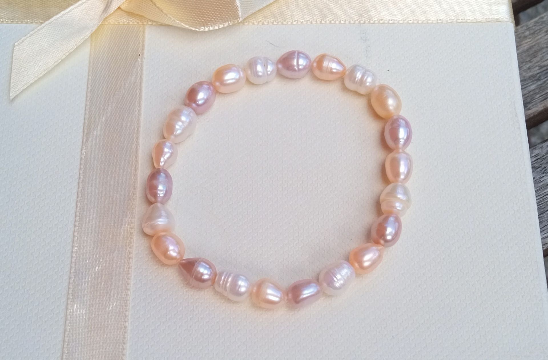 Náramek z dokonale lesklých říčních perel o velikosti cca 8-9 mm v bílé, světle růžové a světle fialkové barvě na kvalitním pružném návleku.