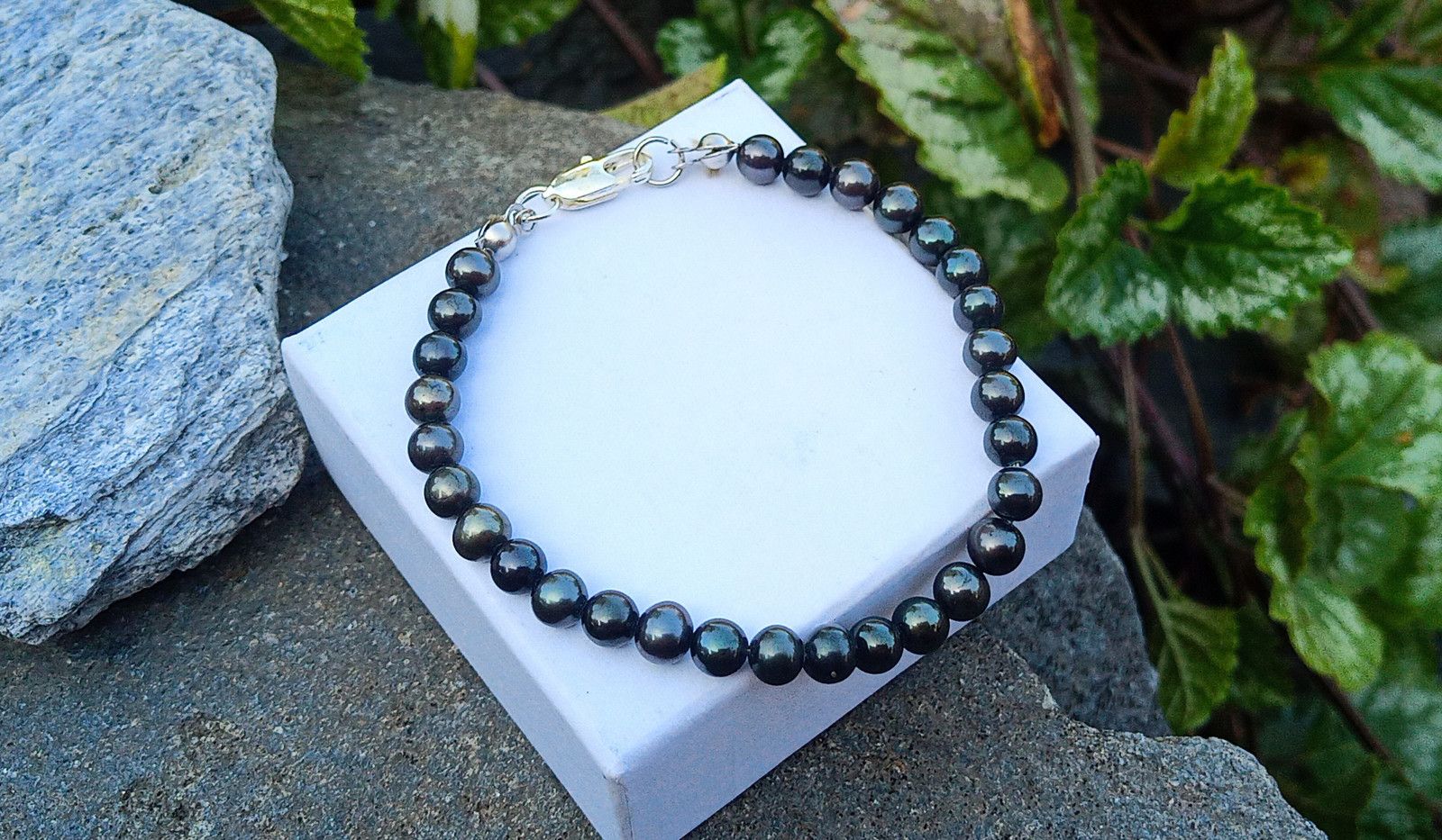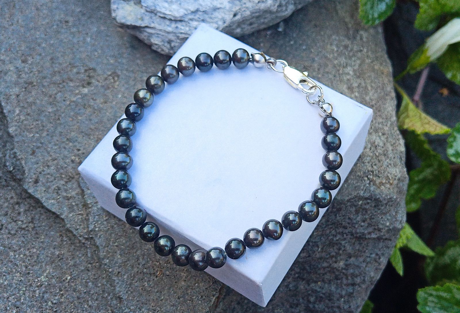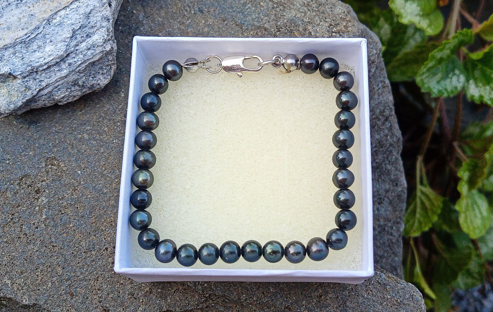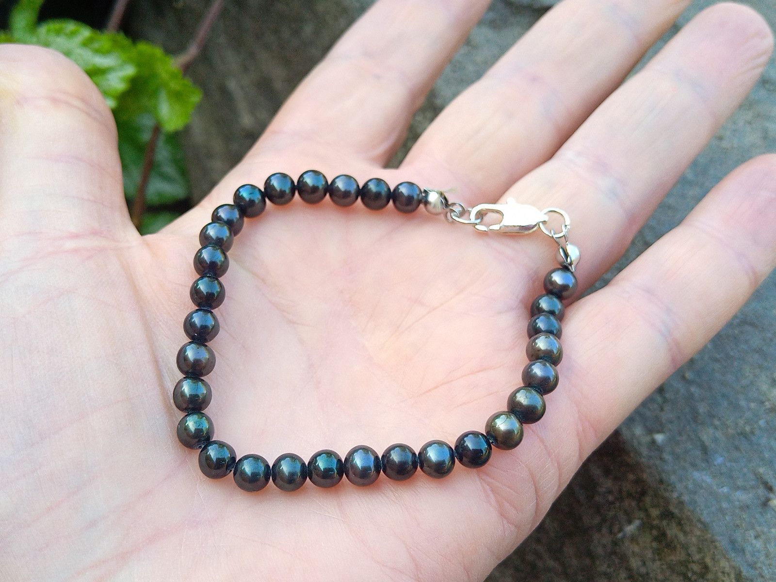 Tmavé téměř dokonale kulaté mořské perly o průměru cca 5 mm v náramku se zapínáním na úzkou stříbrnou karabinku.