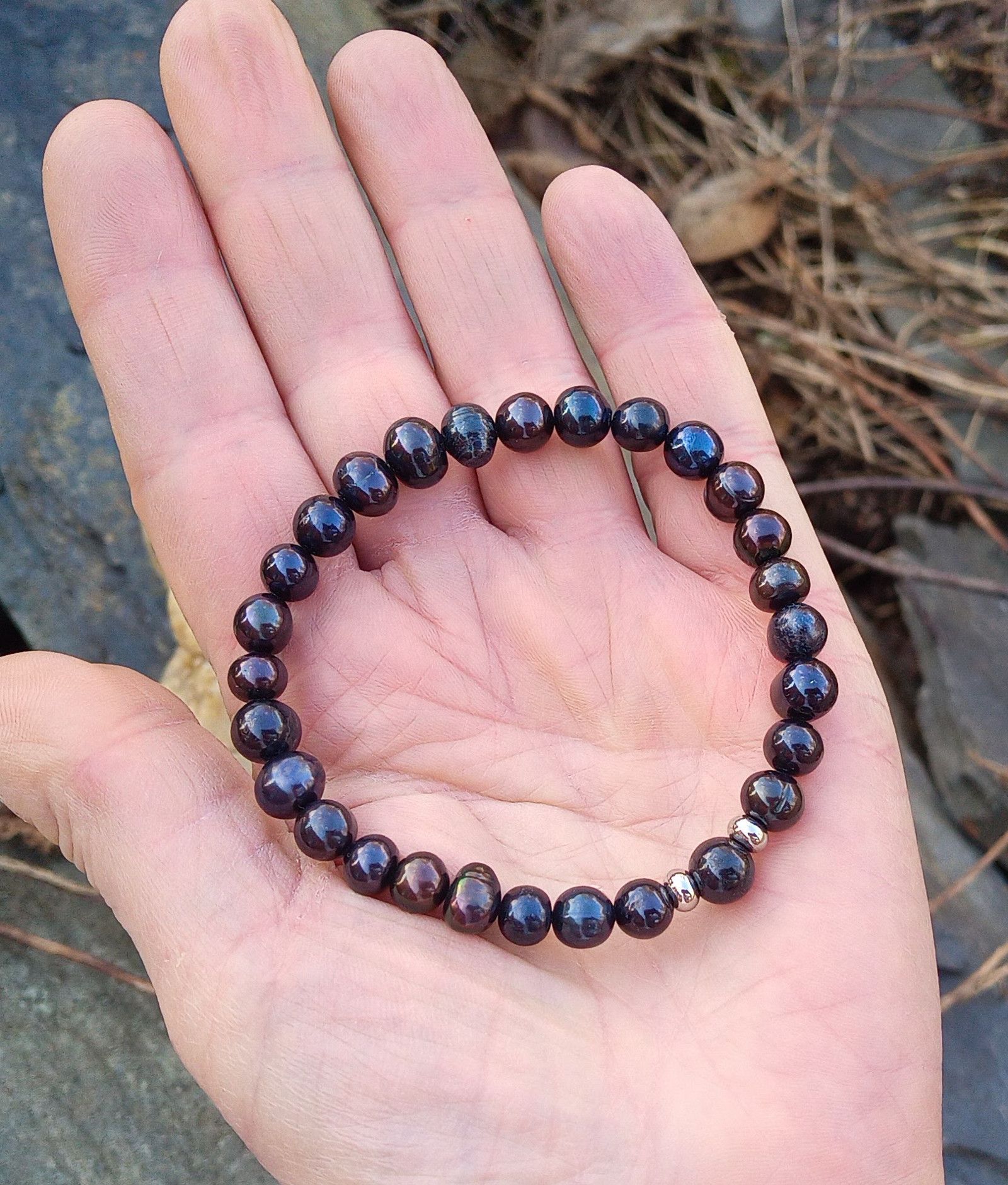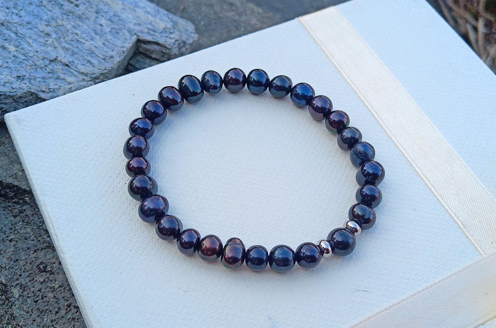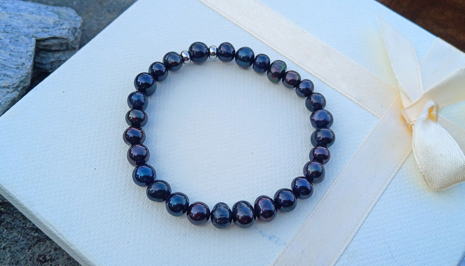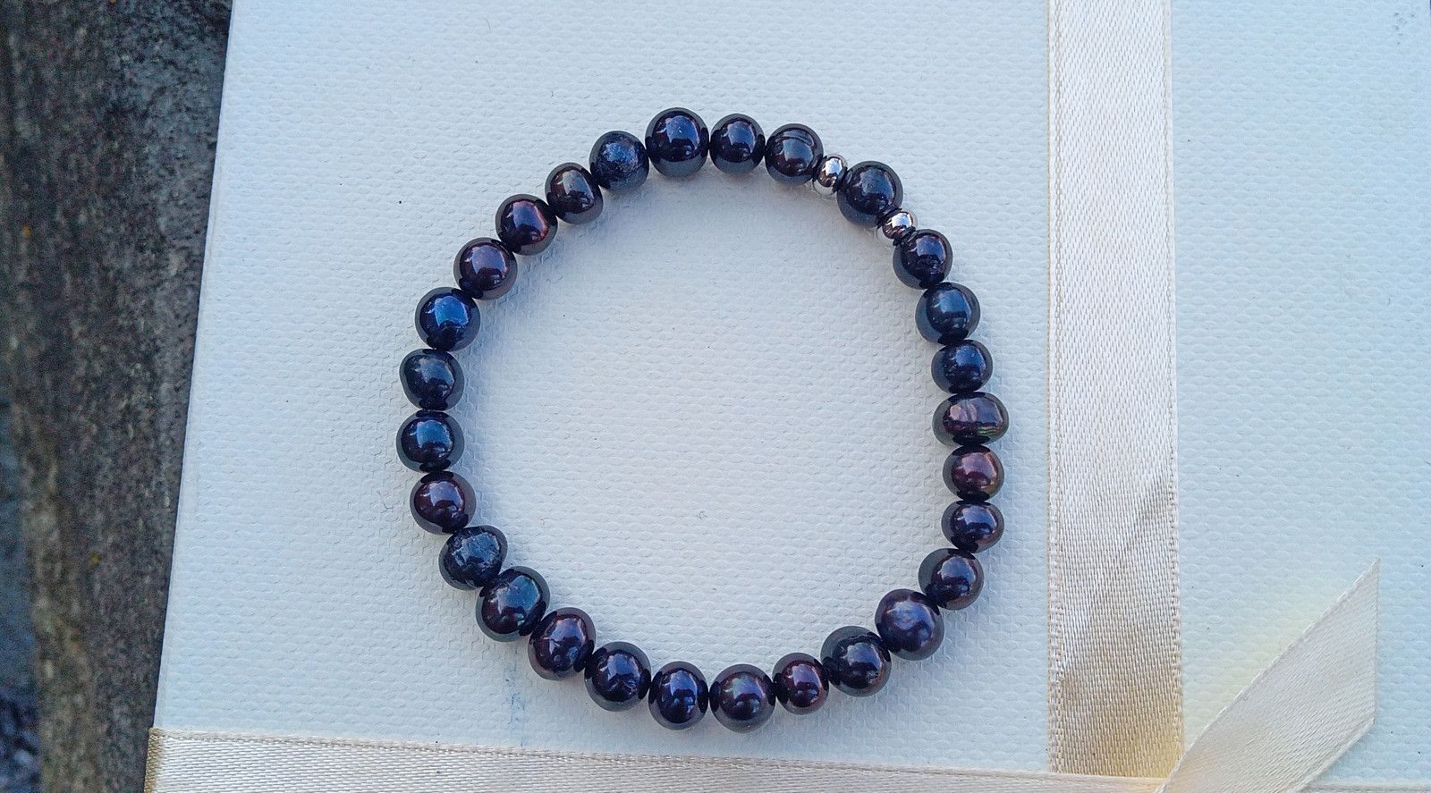 Náramek z dokonale lesklých jihomořských perel o průměru cca 7-8 mm s nádhernými perleťovými duhovými odlesky doplněné o 2 korálky z chirurgické oceli - hypoalergenní, vhodné i pro alergiky na pružném návleku.