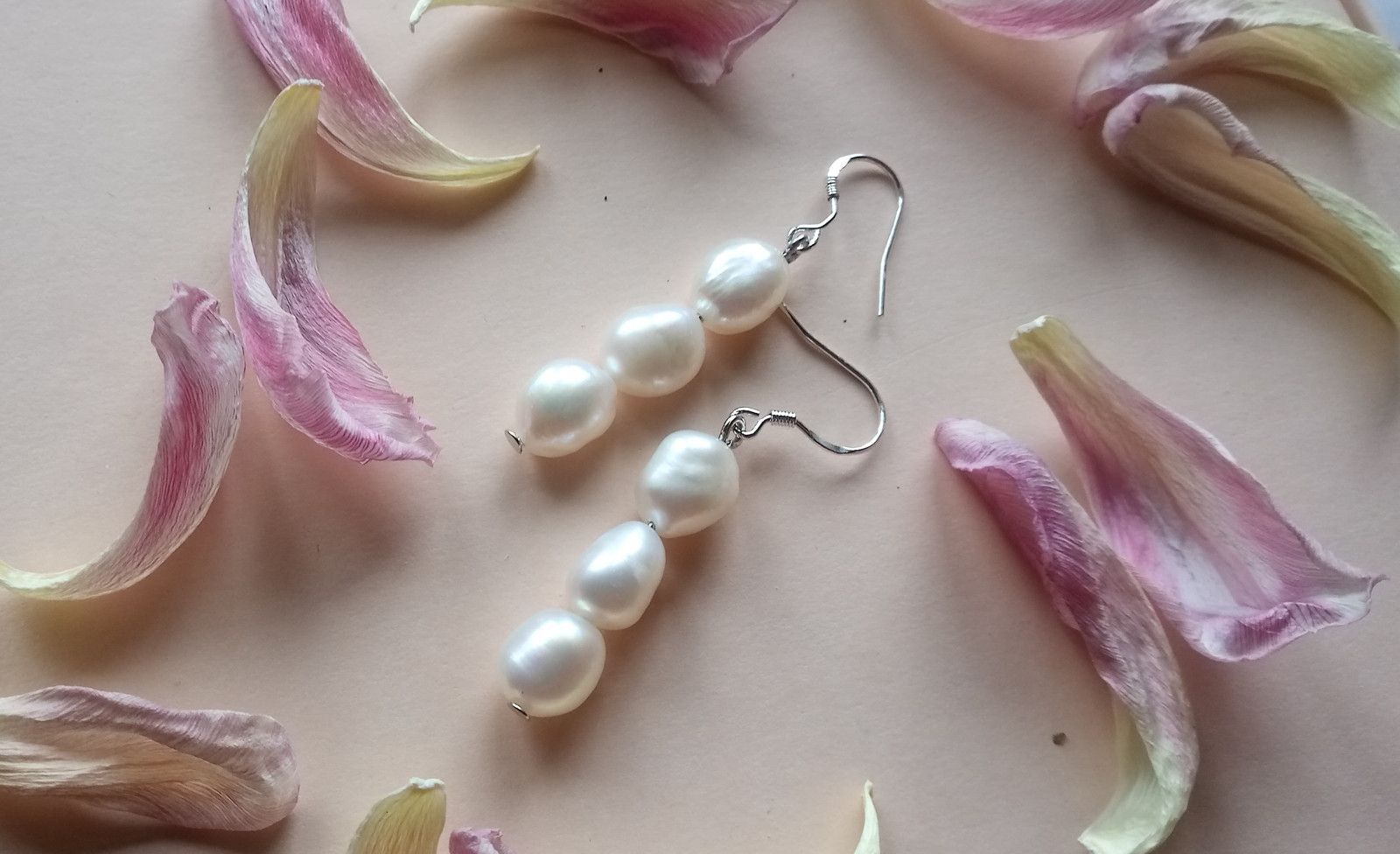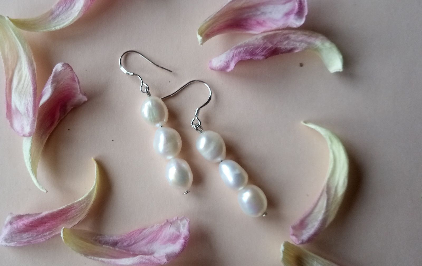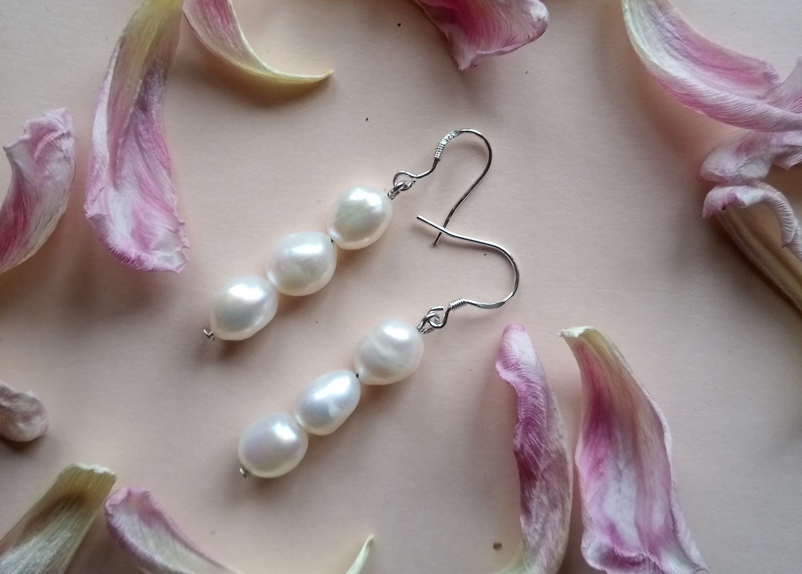 Bílé něžné náušnice z říčních perliček v na postříbřených háčcích.