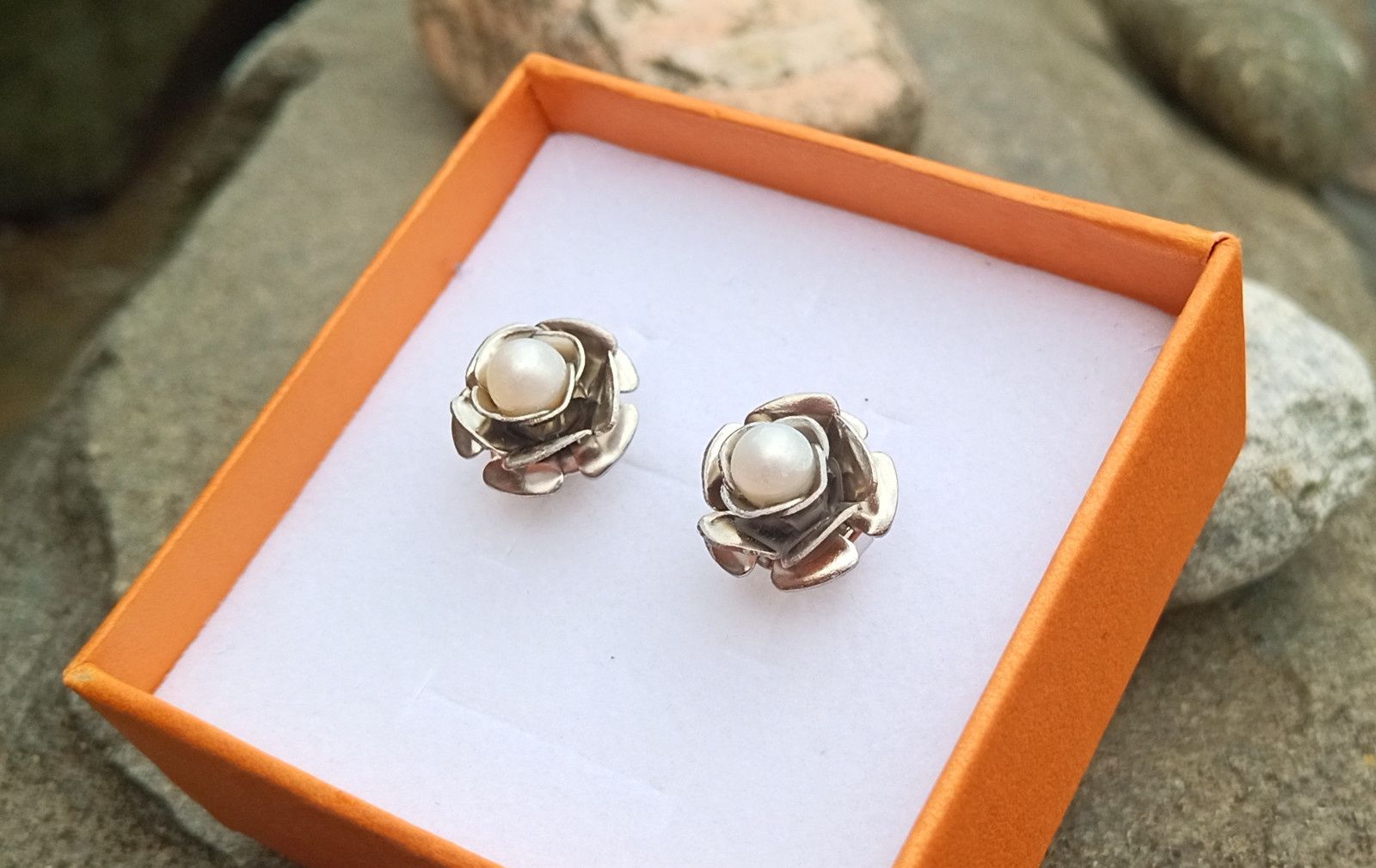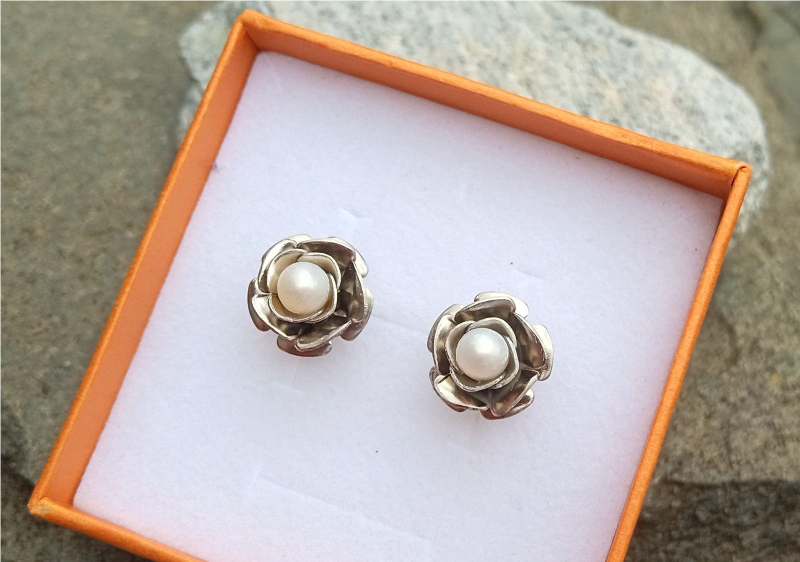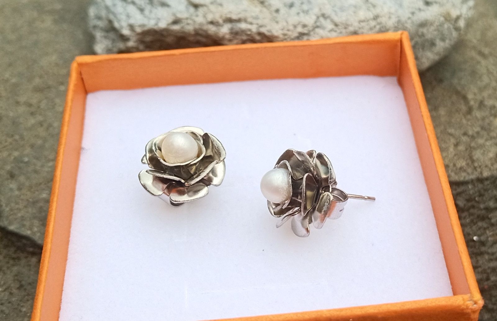 Něžné romantické náušnice puzety ve tvaru růžiček uprostřed zdobených bílými dokonale lesklými říčními perlami o průměru cca 5 mm. Květinky - růžičky jsou vyrobené z chirurgické oceli - hypoalergenní, vhodné i pro alergiky.