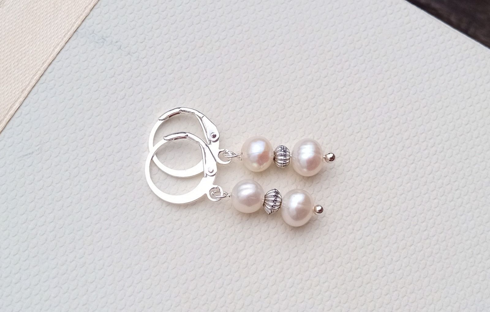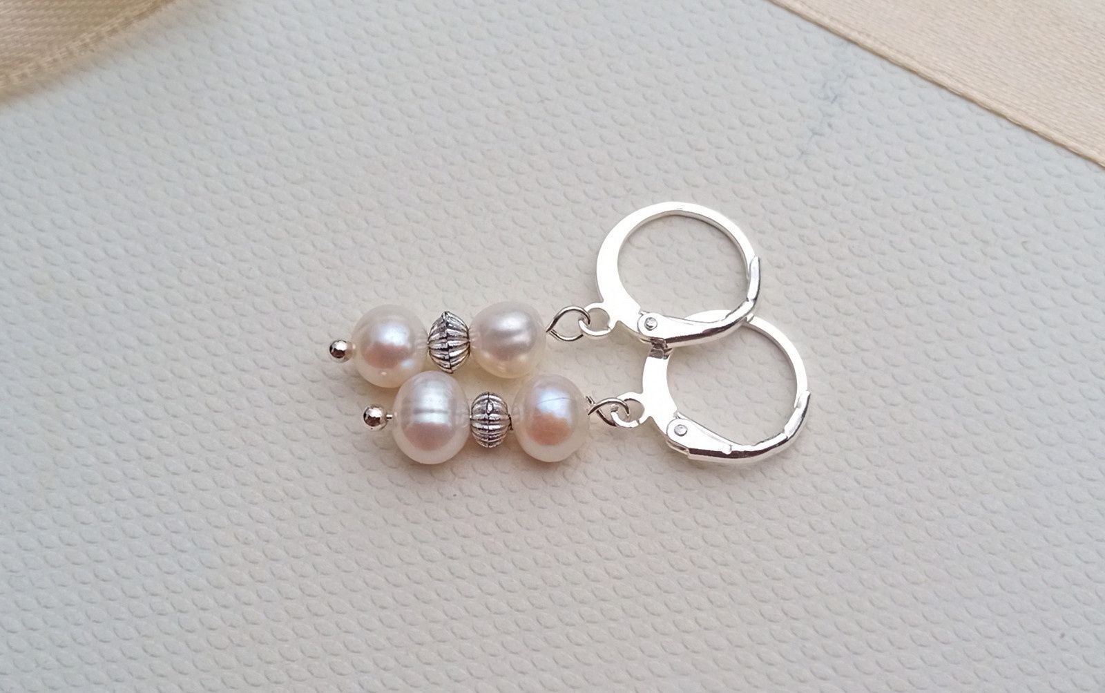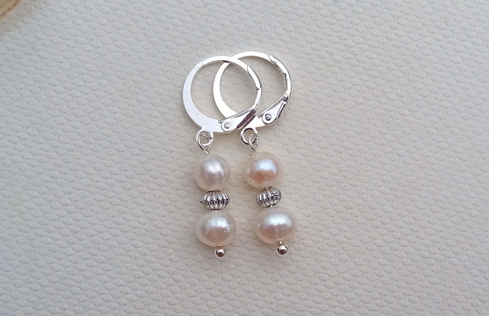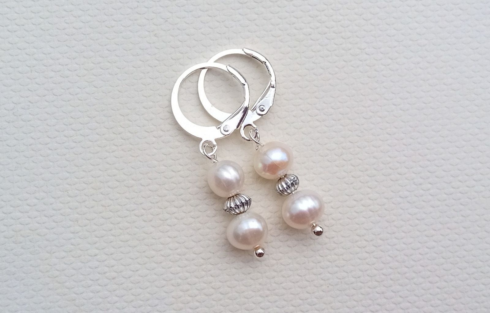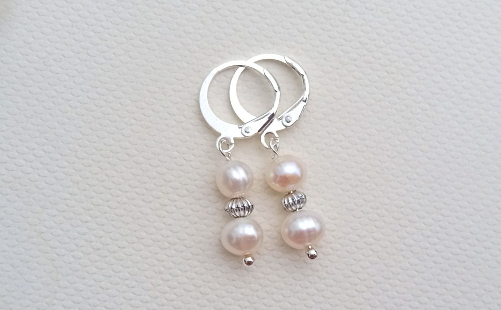 Dokonale lesklé říční perly o průměru cca 6-7 mm v bílé barvě oddělené od sebe drobným stříbrným rýhovaným korálkem v elegantních něžných náušnicích o délce 3 cm na zavíracích háčcích z chirurgické oceli - hypoalergenní, vhodné i pro alergiky.