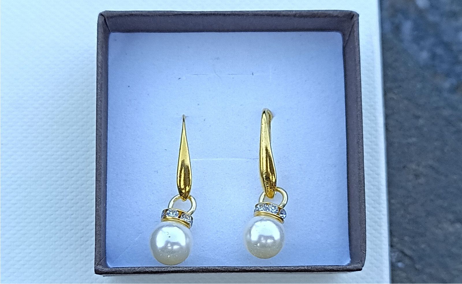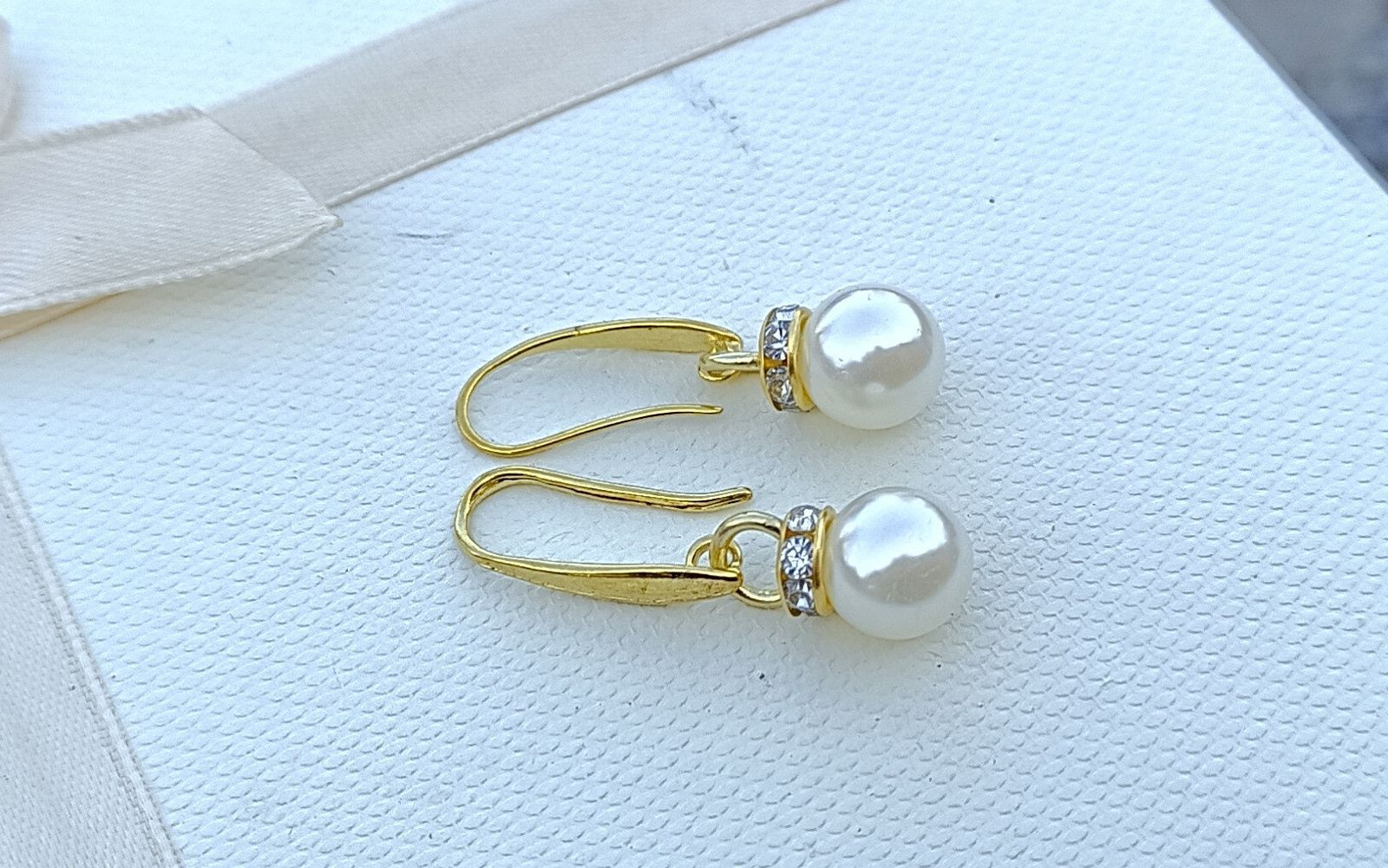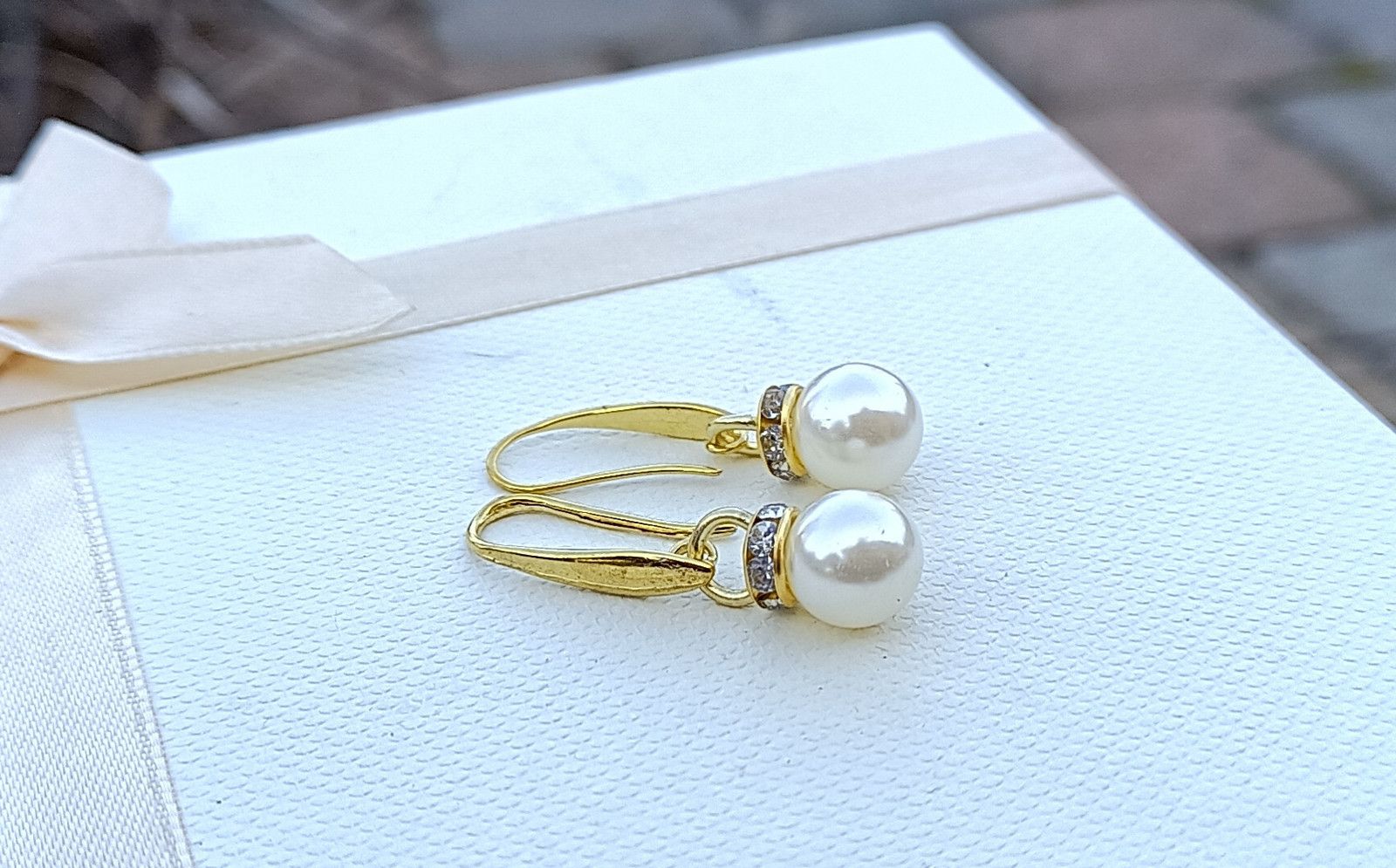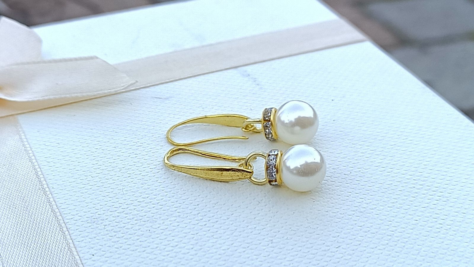 Bílé dokonale kulaté shell perly o průměru 10 mm pod drobnými broušenými kubickými zirkony na prodloužených zesílených elegantních pozlacených háčcích.