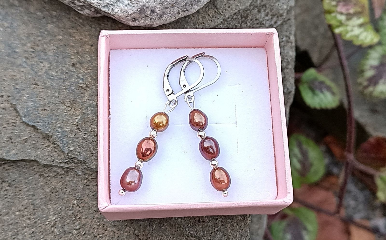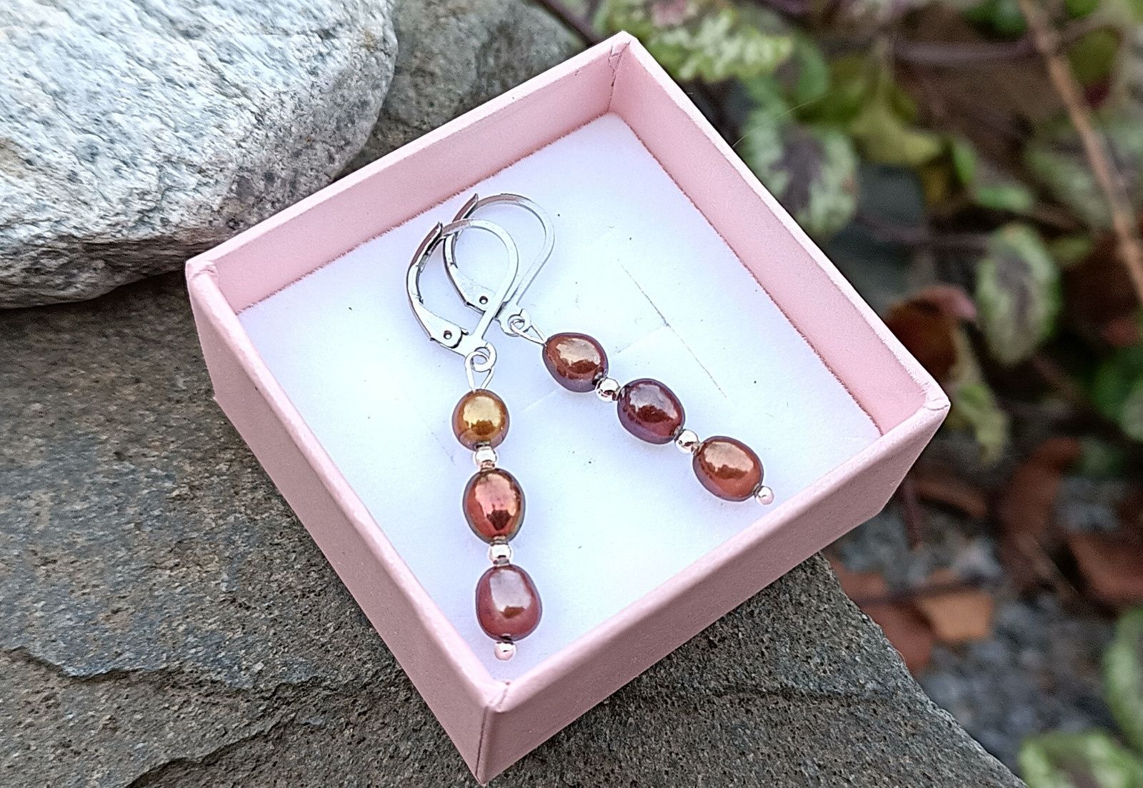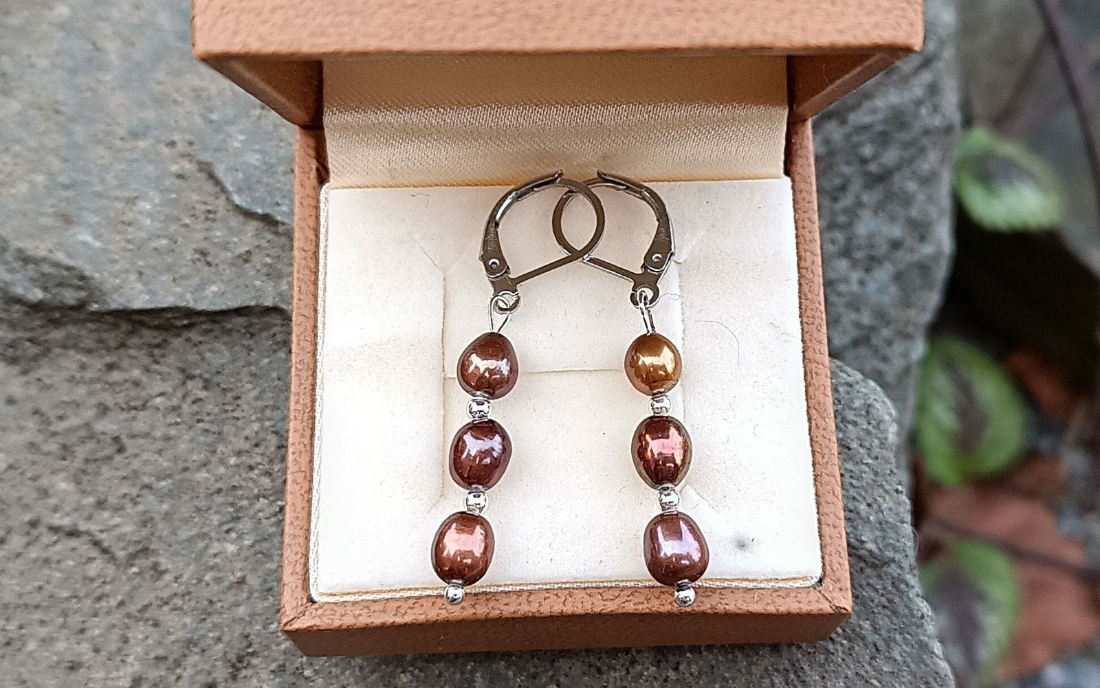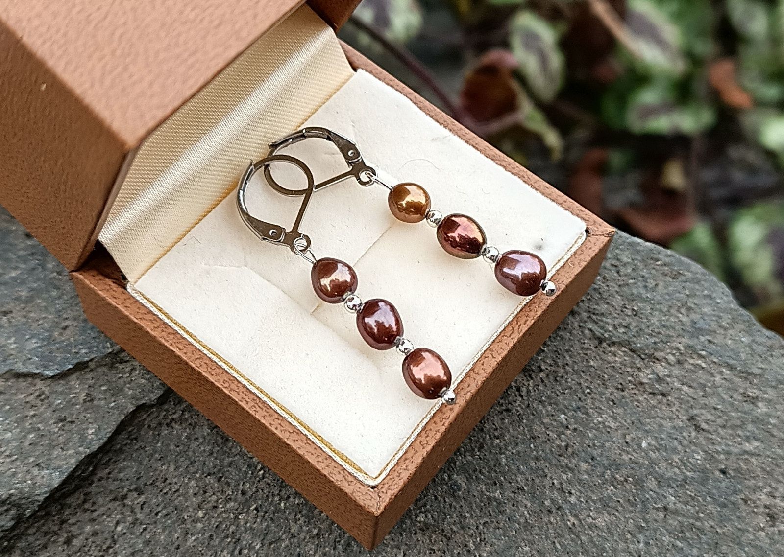 Náušnice vyrobené z dokonale lesklých hnědých říčních perliček v top kvalitě o velikosti cca 6 mm vzájemně oddělených stříbrnými drobnými korálky na zavíracích háčcích z chirurgické oceli - hypoalergenní, vhodné i pro alergiky. Barva perel je přírodní bez dobarvení! Perličky vynikají krásnými perleťovými duhovými odlesky, jsou v top kvalitě bez rýh a jiných inkluzí.