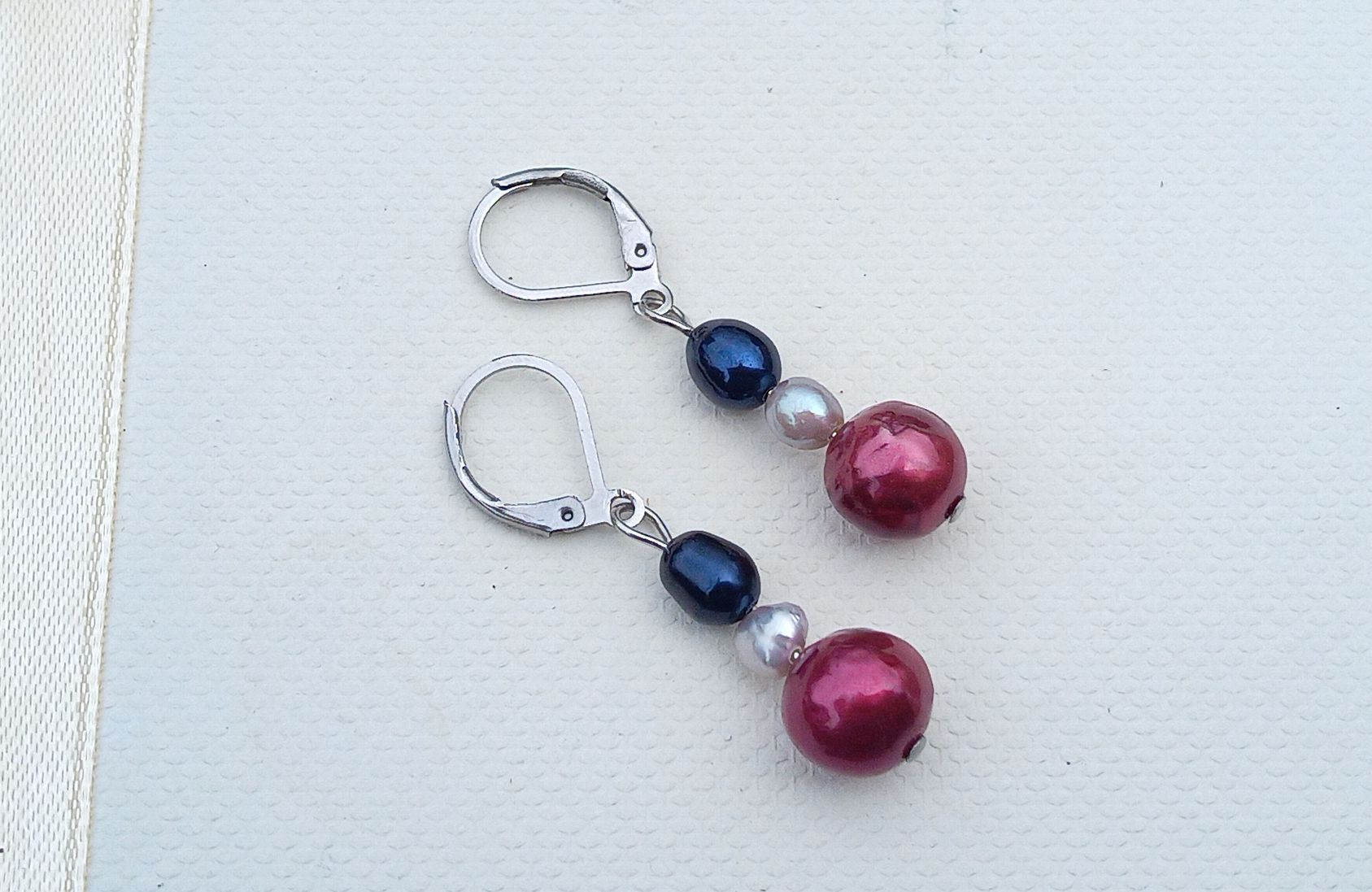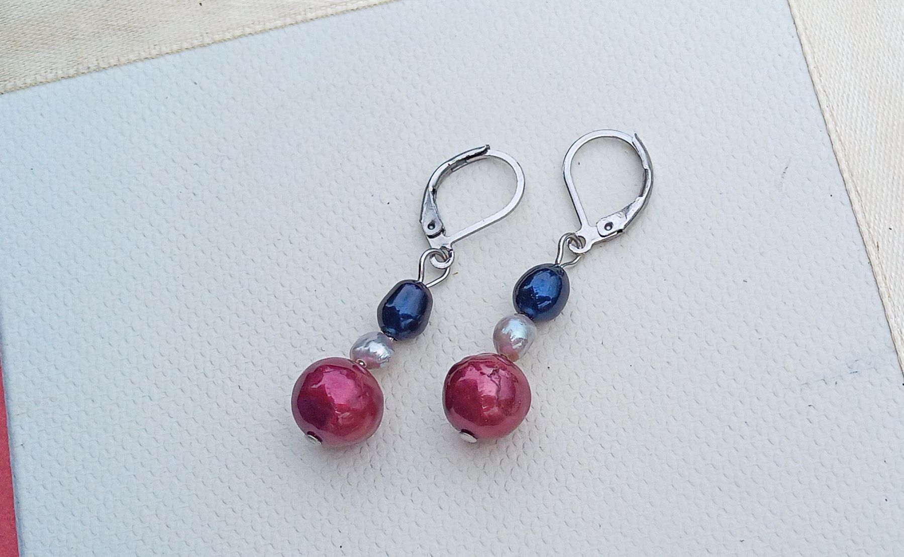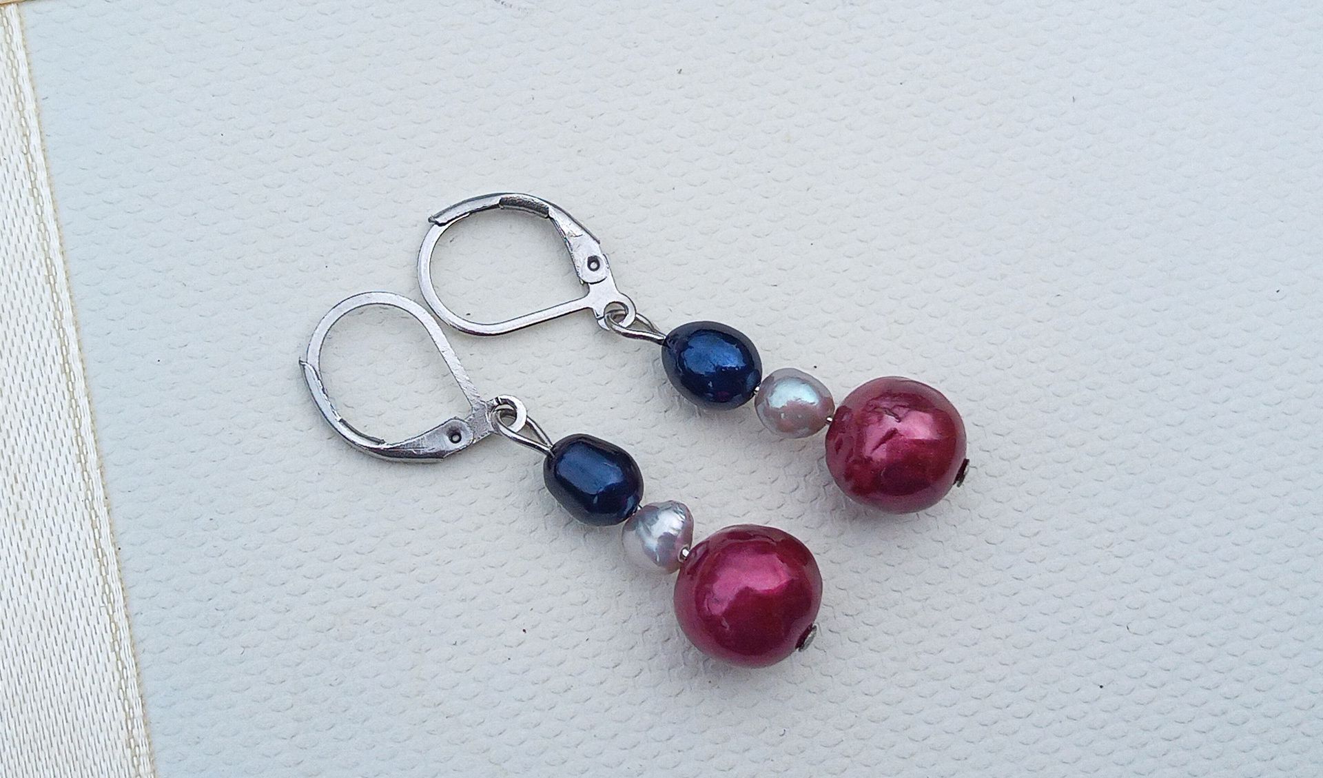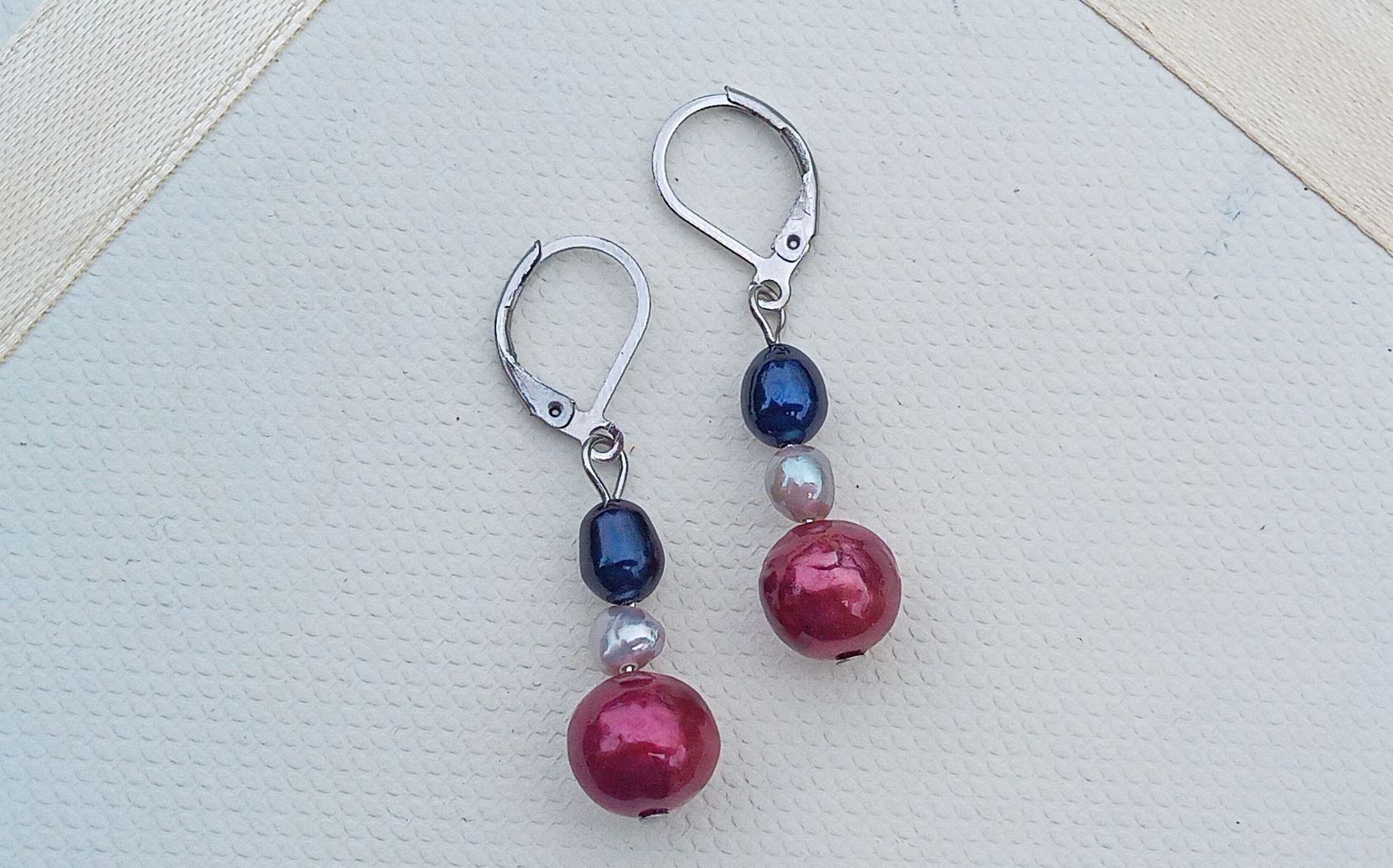 Náušnice z dokonale lesklých kulatých jihomořských sytě růžových perel o průměru 10 mm pod menšími šedými a tmavě modrými říčními perličkami zavěšené na zavíracích háčcích z chirurgické oceli - hypoalergenní, vhodné i pro alergiky.