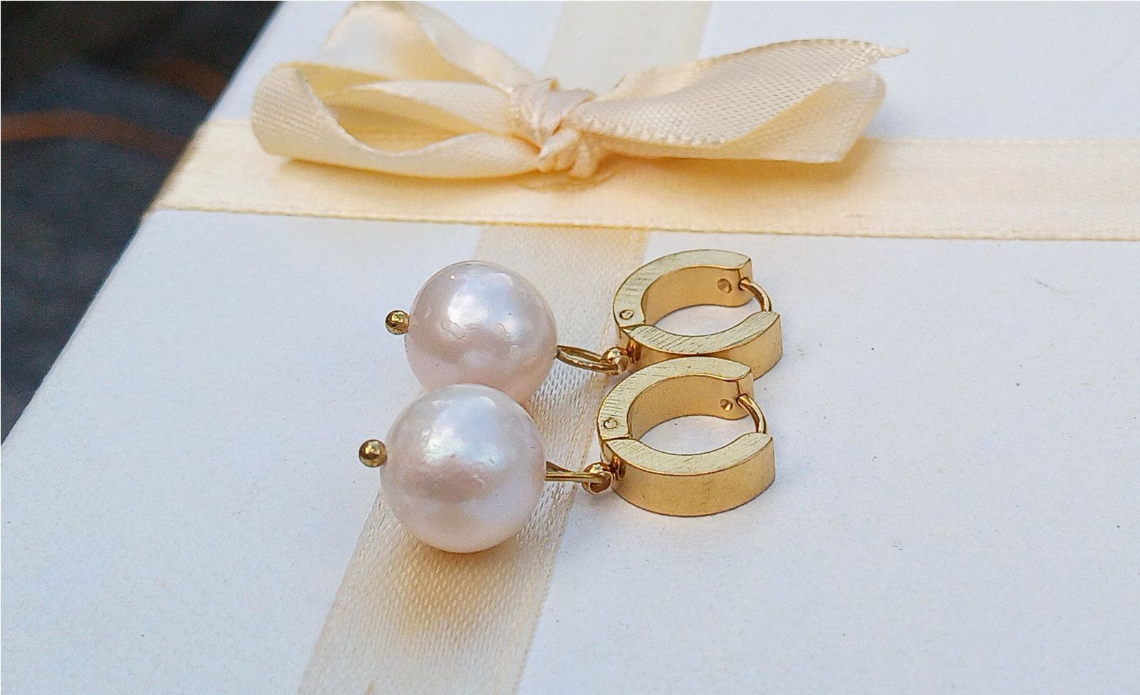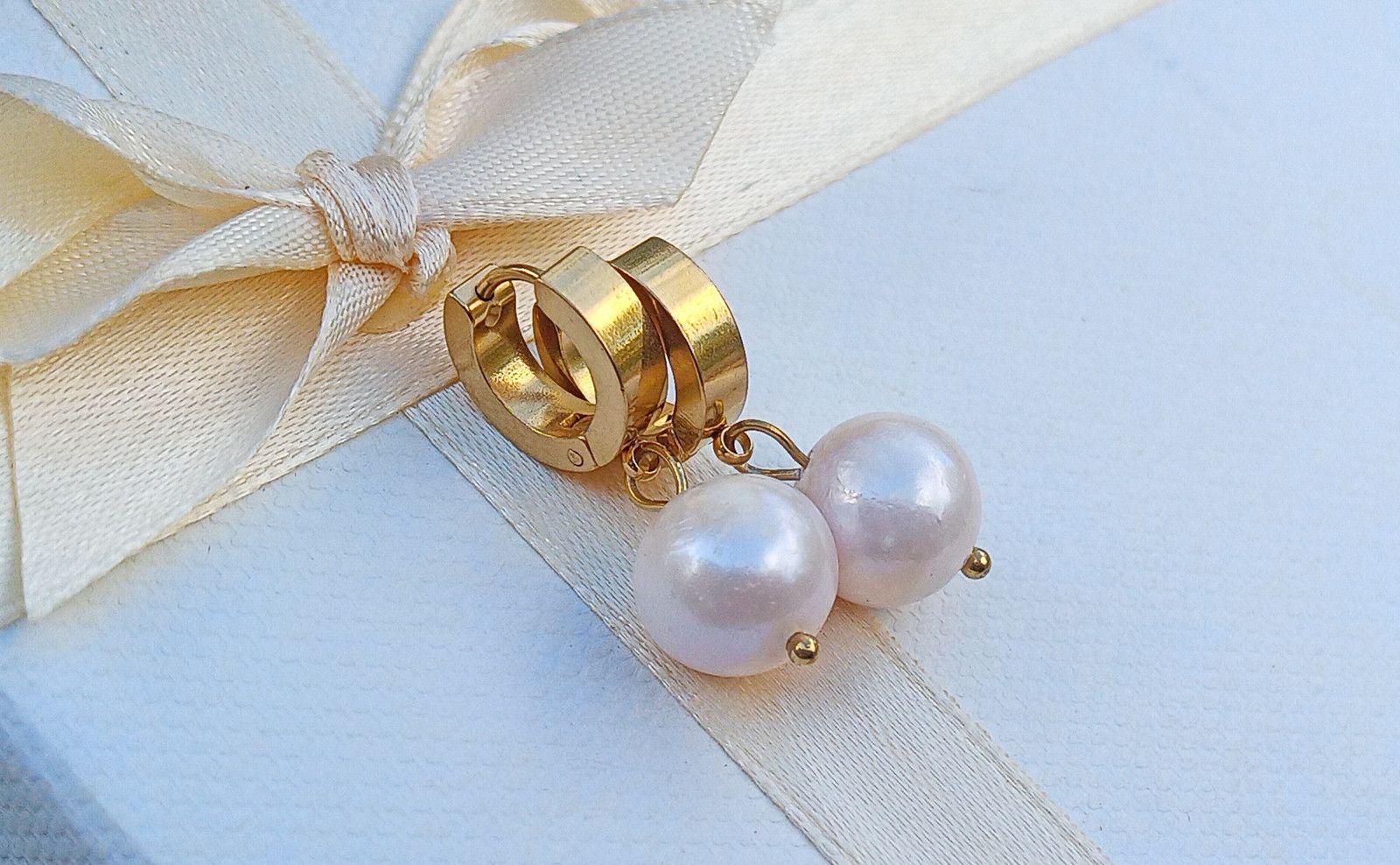 Dokonale lesklé velké kulaté perly pocházející z jižního Pacifiku o průměru cca 11 mm v sametově bílé barvě zavěšené na zavíracích pozlacených háčcích z chirurgické oceli, která je hypoalergenní a vhodná tedy i pro alergiky.