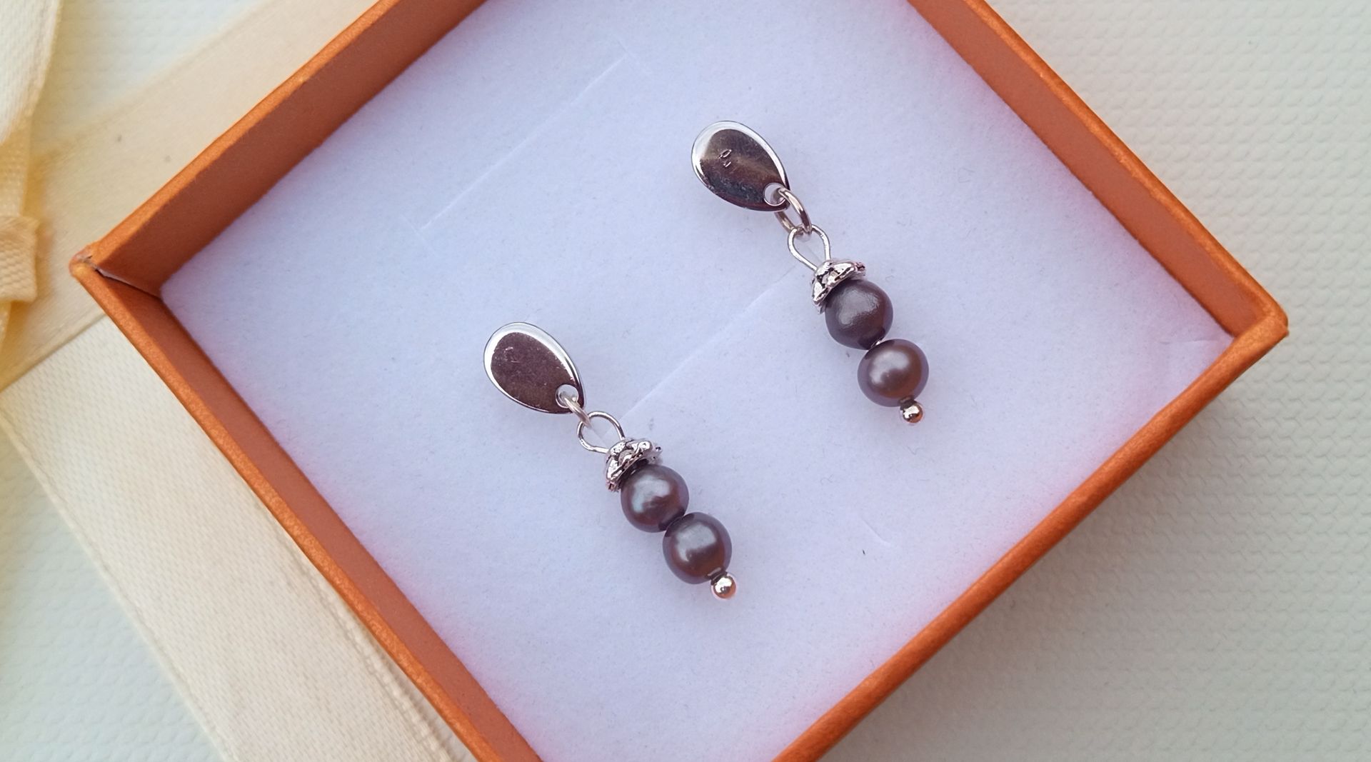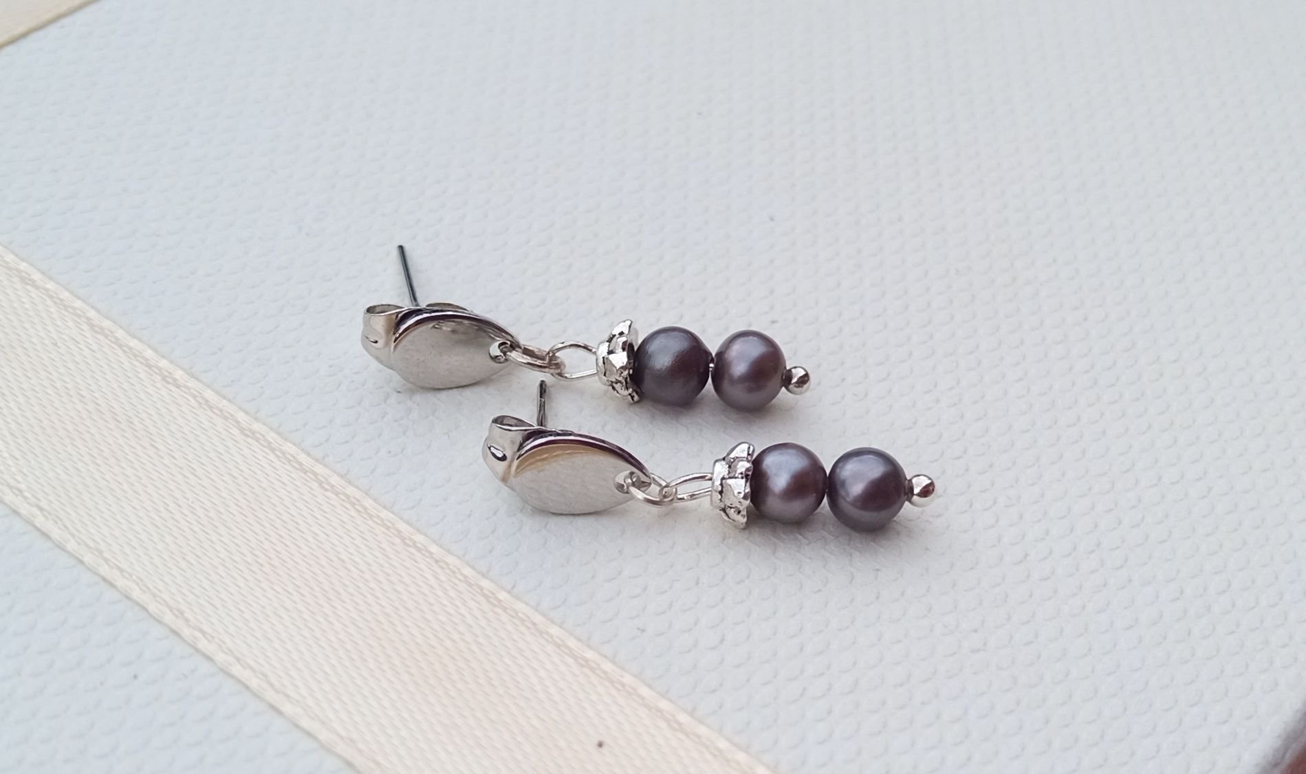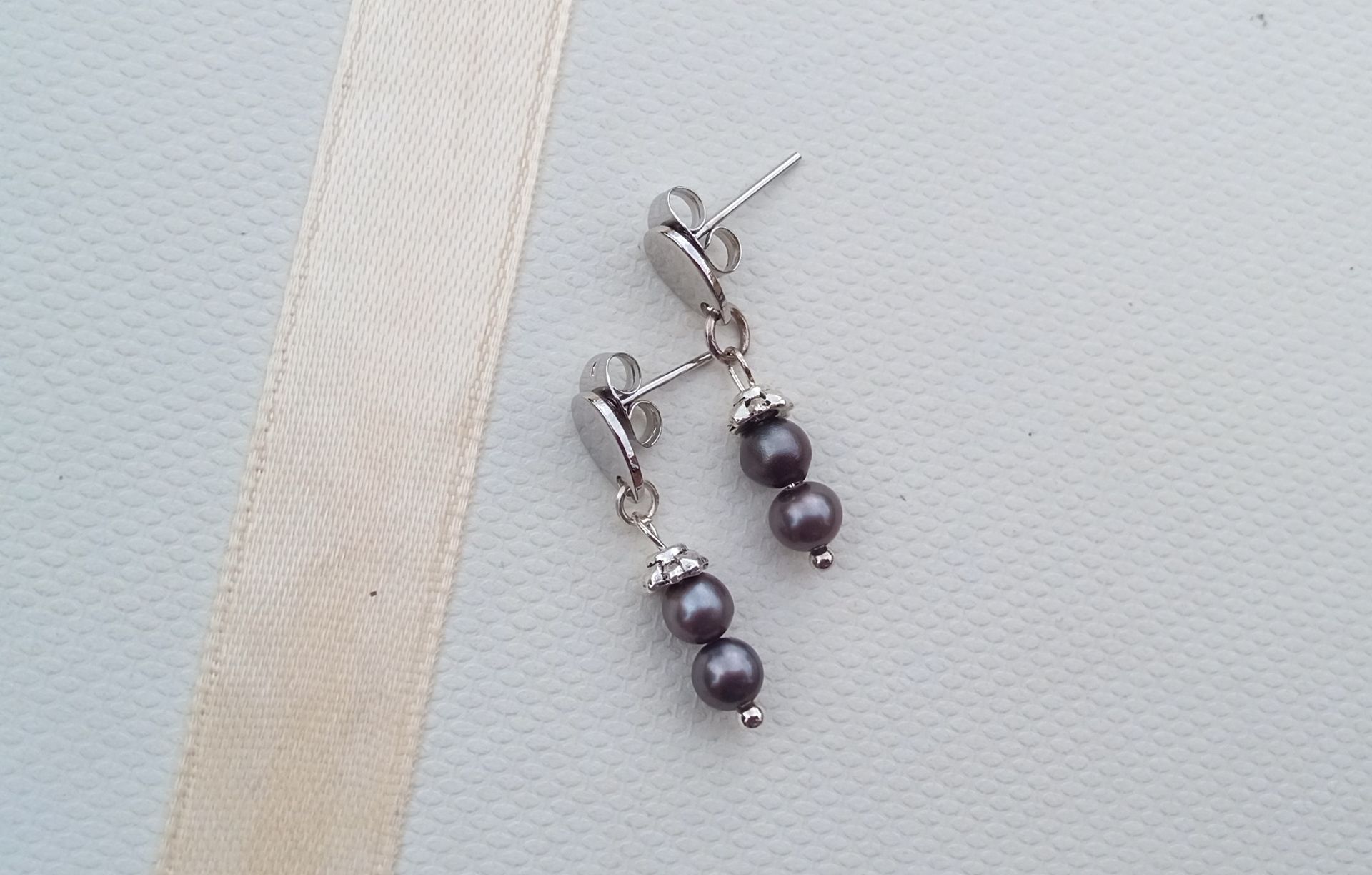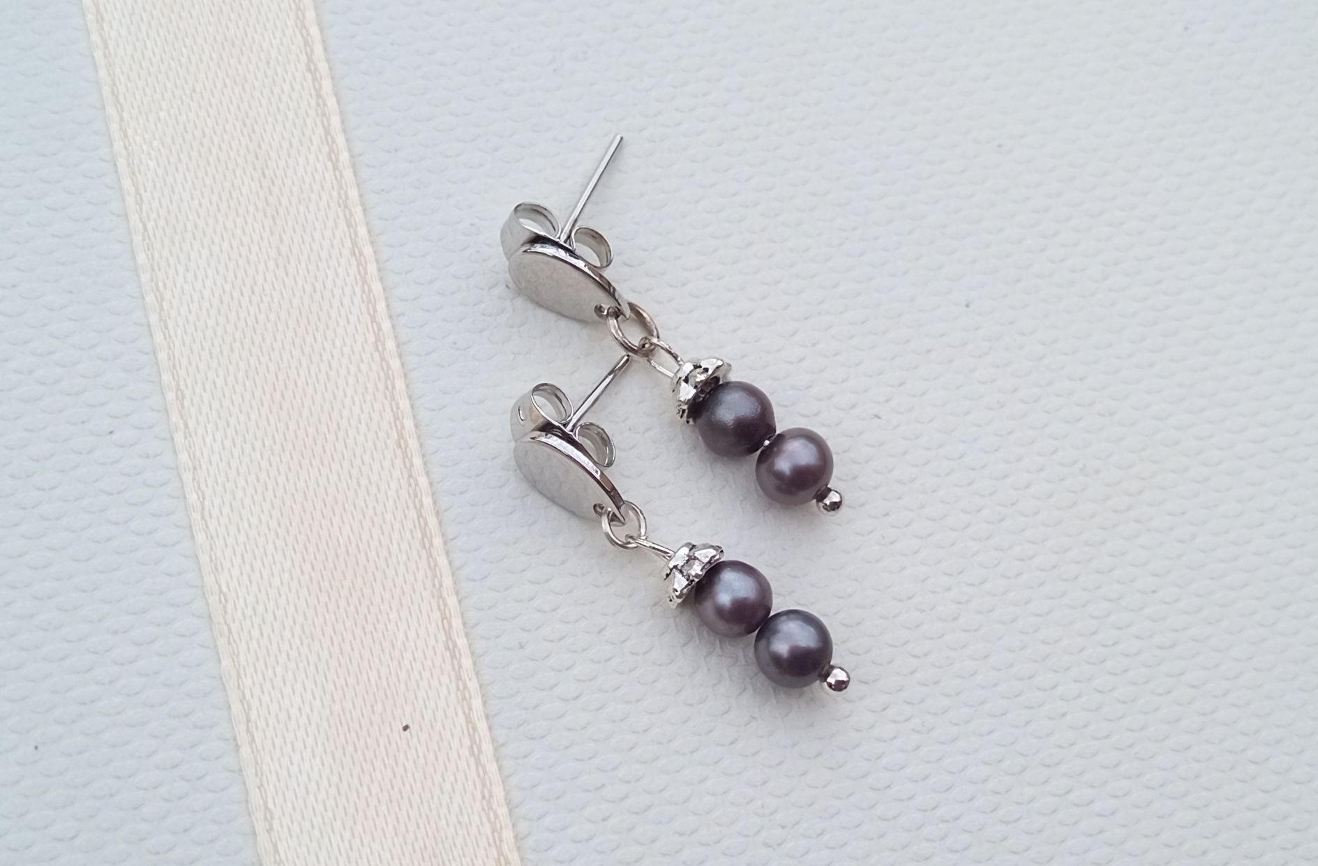 Šedé téměř dokonale kulaté mořské perly vysoké kvality o průměru cca 4 mm zdobené drobným kaplíkem a zavěšené na chirurgické oceli s uchycením ve stylu puzety. Chirurgická ocel je hypoalergenní kov, vhodný i pro alergiky.