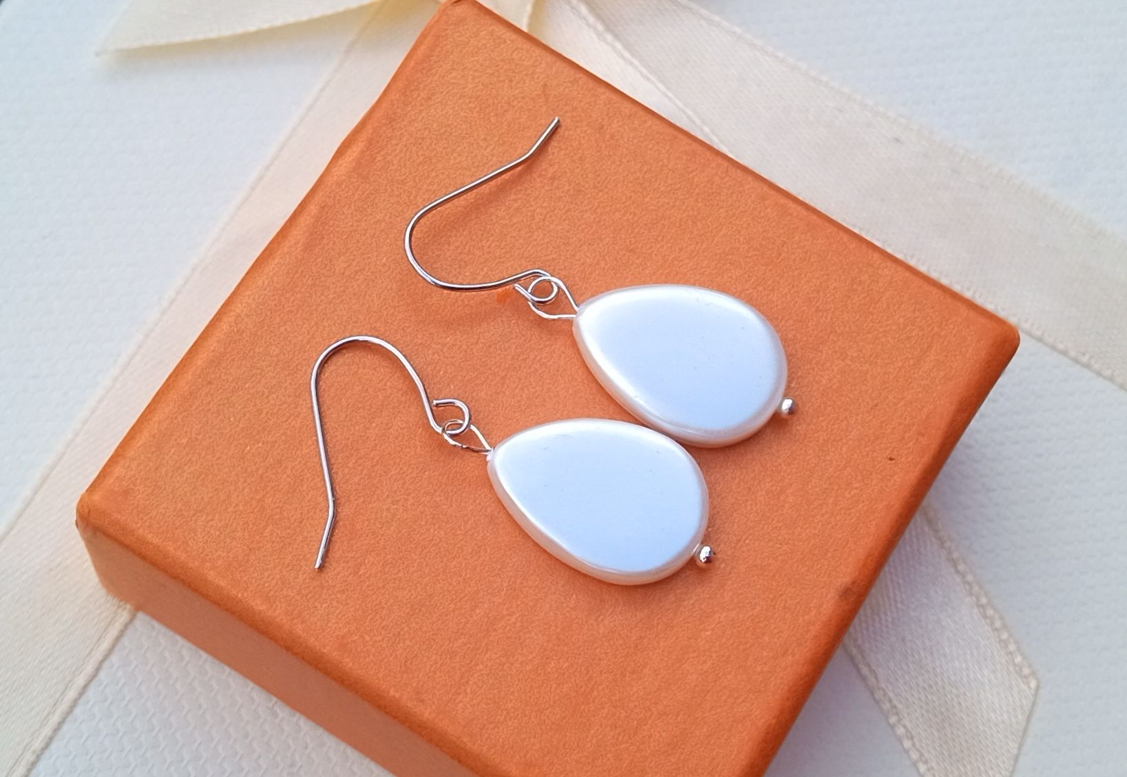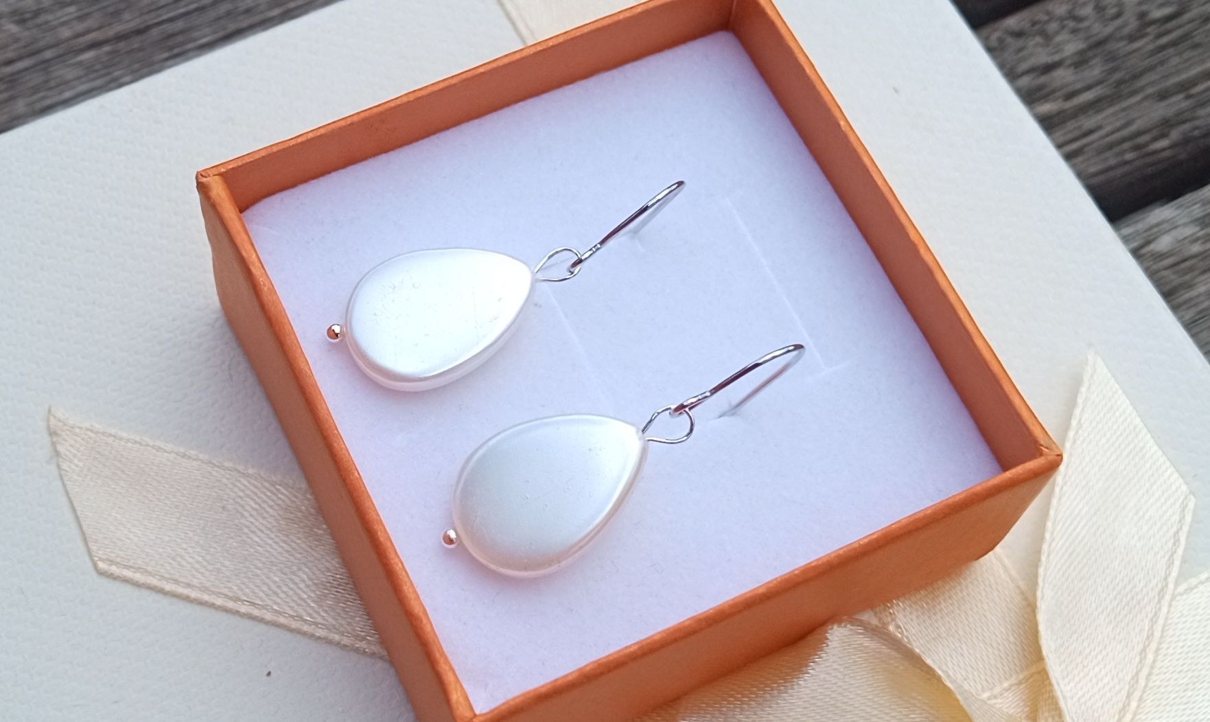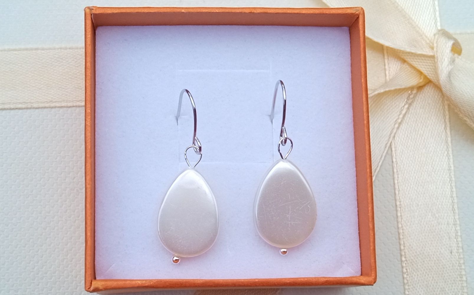 Náušnice ve tvaru kapek o velikosti 14x12 mm vyrobené z bílé přírodní perletě zavěšené na háčcích z chirurgické oceli - hypoalergenní, vhodné i pro alergiky.
