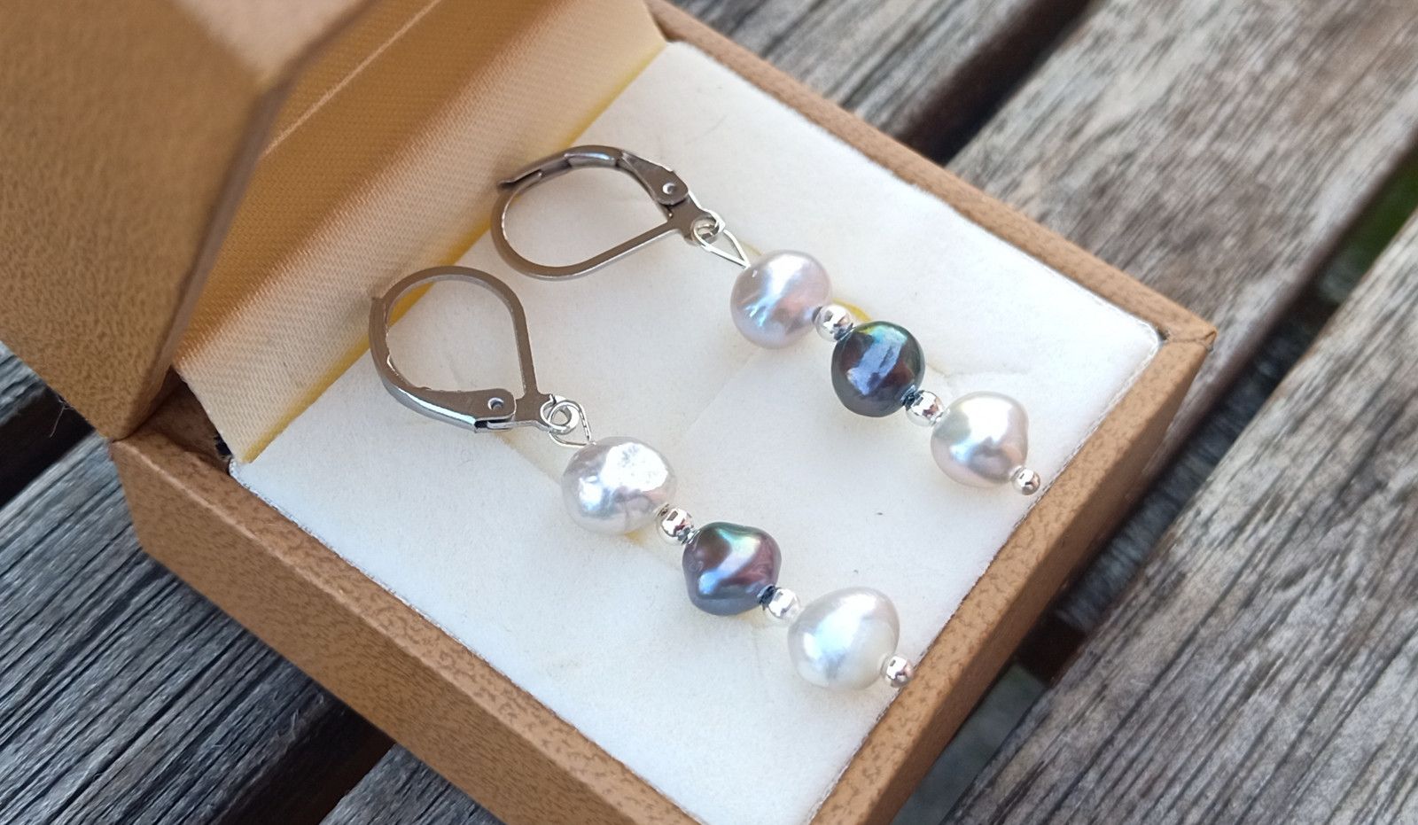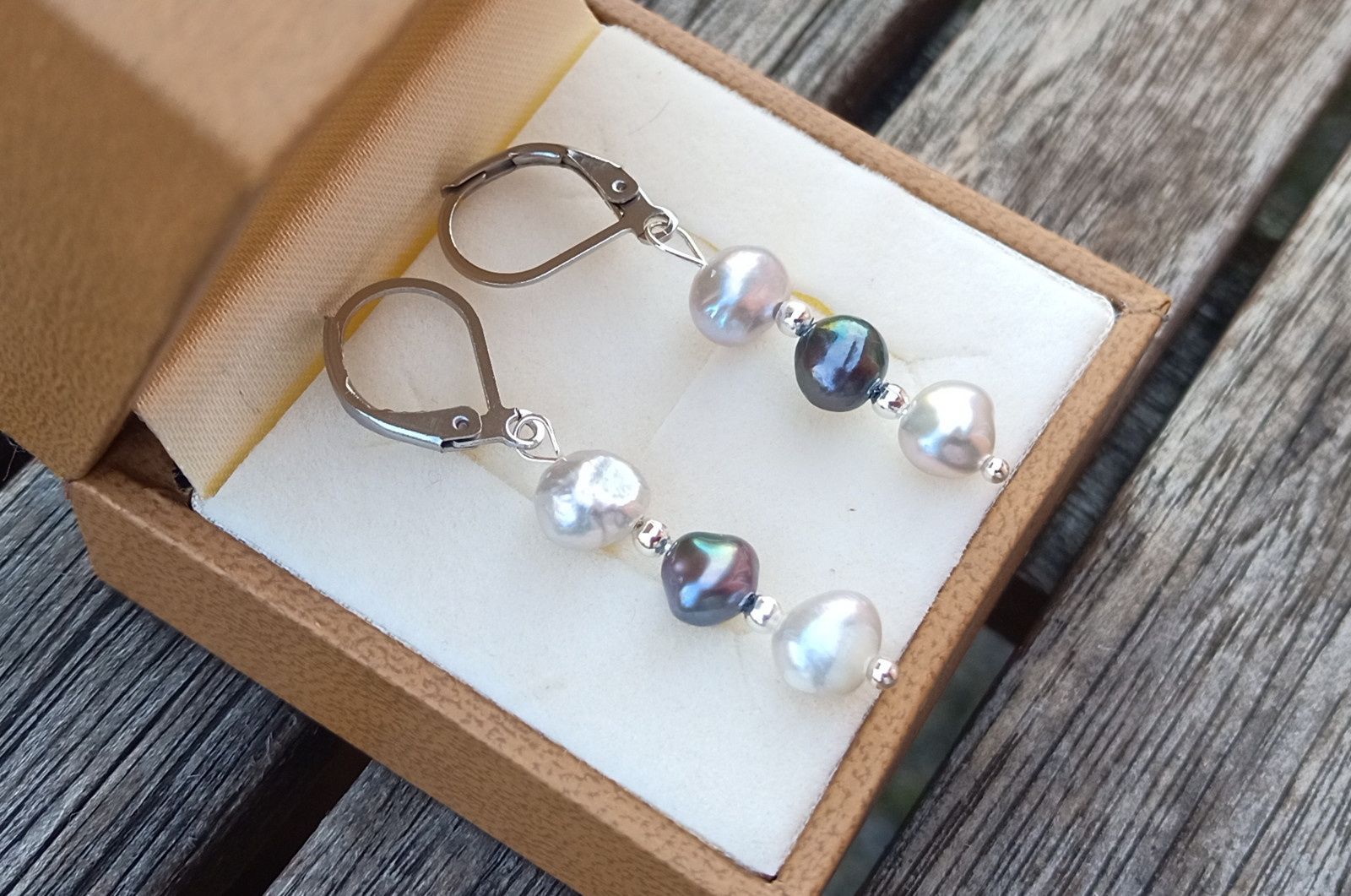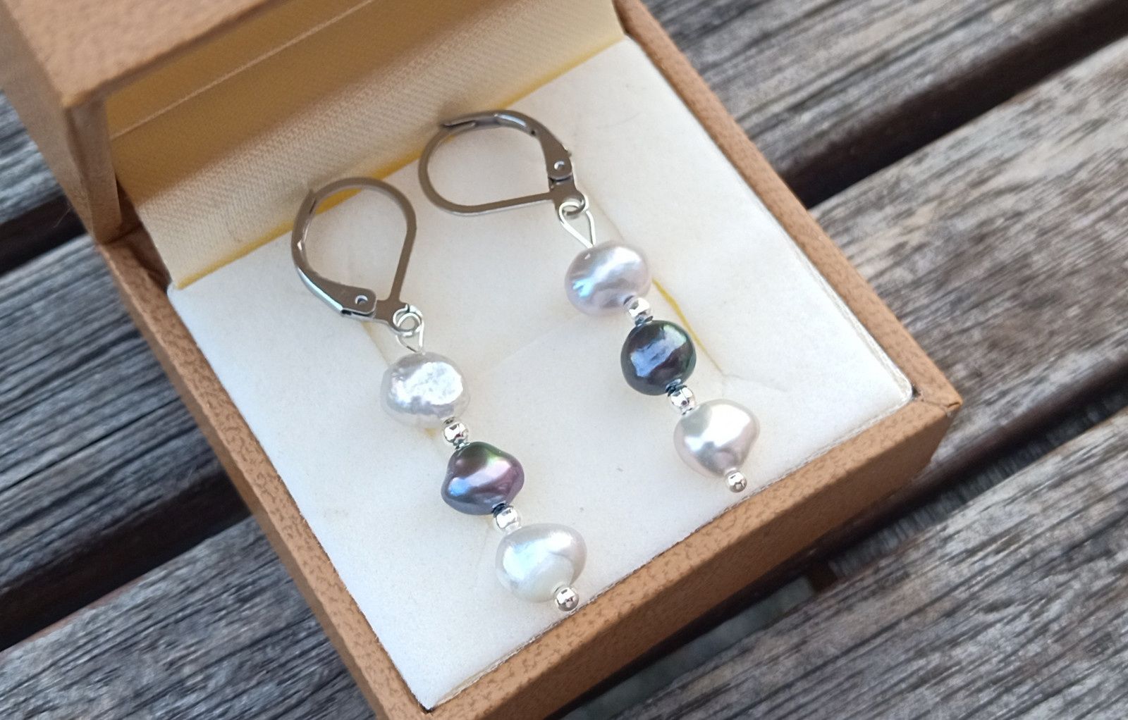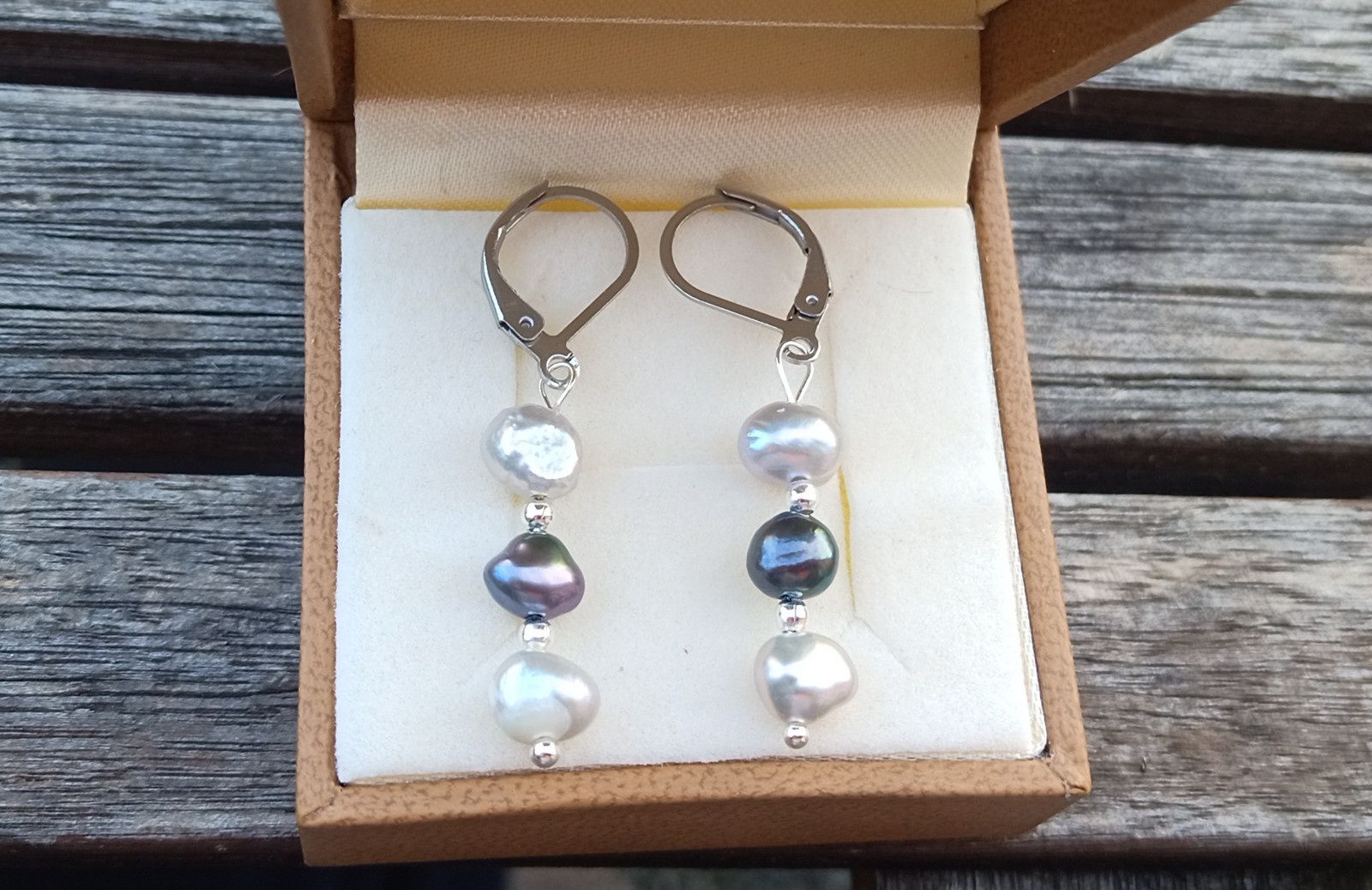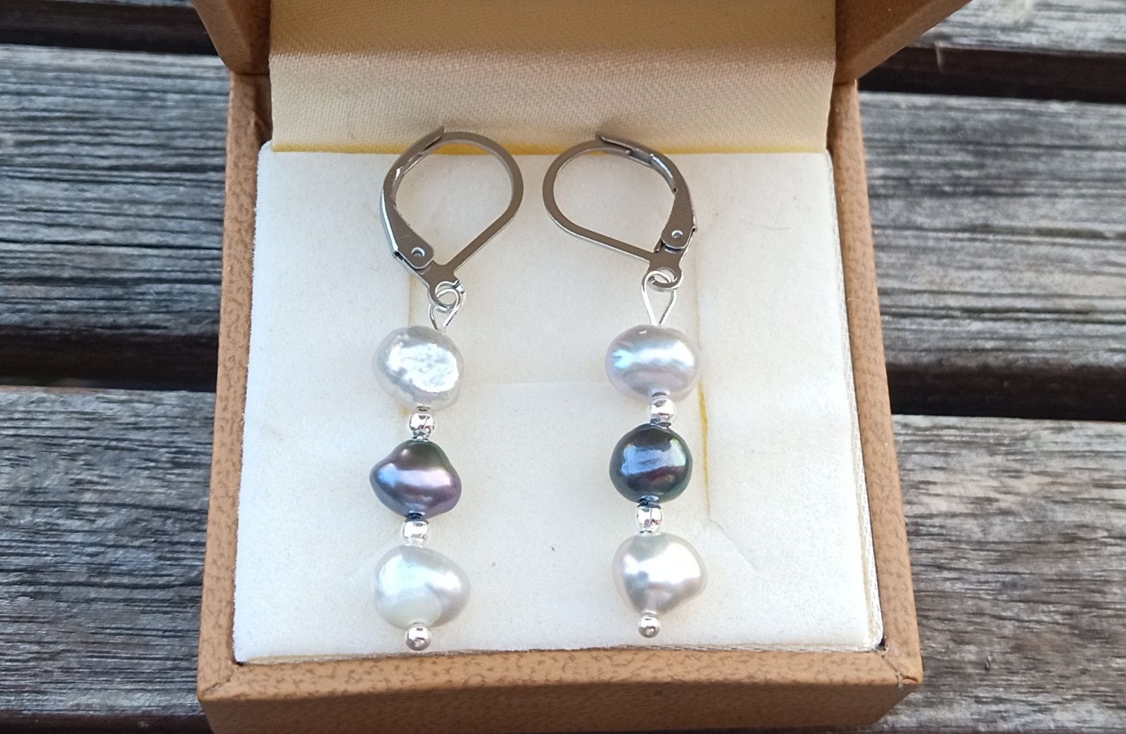 Dokonale lesklé říční perly velké cca 6 mm v přírodních odstínech světle a tmavě šedé barvy oddělené od sebe drobným stříbrným korálkem v elegantních náušnicích dlouhých 3,5 cm na zavíracích háčcích z chirurgické oceli - hypoalergenní, vhodné i pro alergiky.