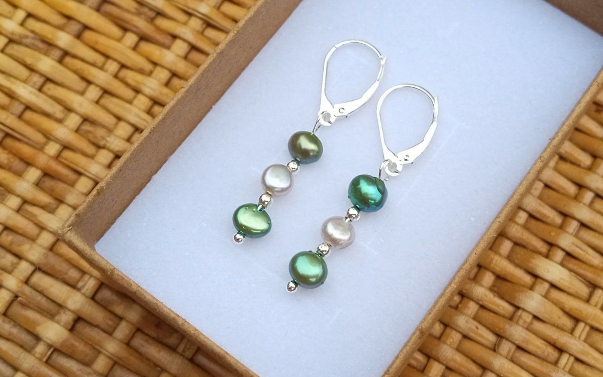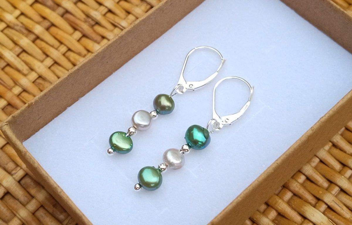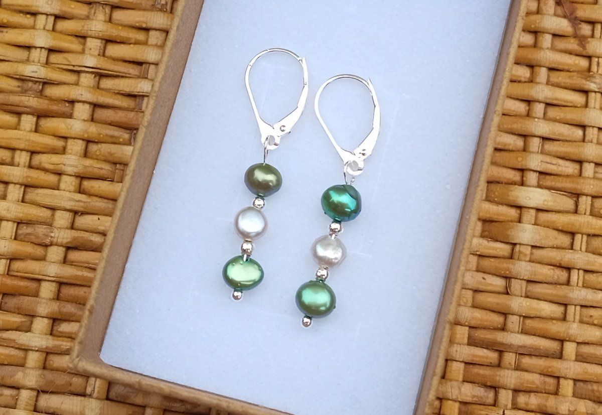 Říční perly zeleno šedé stříbrné perlové náušnice