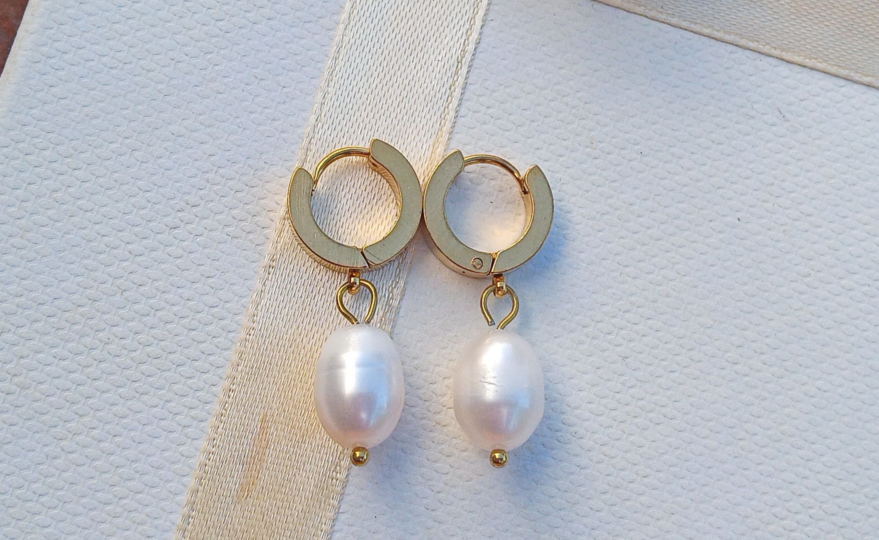 Dokonale lesklé bílé říční perly velké cca 12 mm v elegantních náušnicích na zavíracích háčcích z pozlacené chirurgické oceli - hypoalergenní, vhodné i pro alergiky.