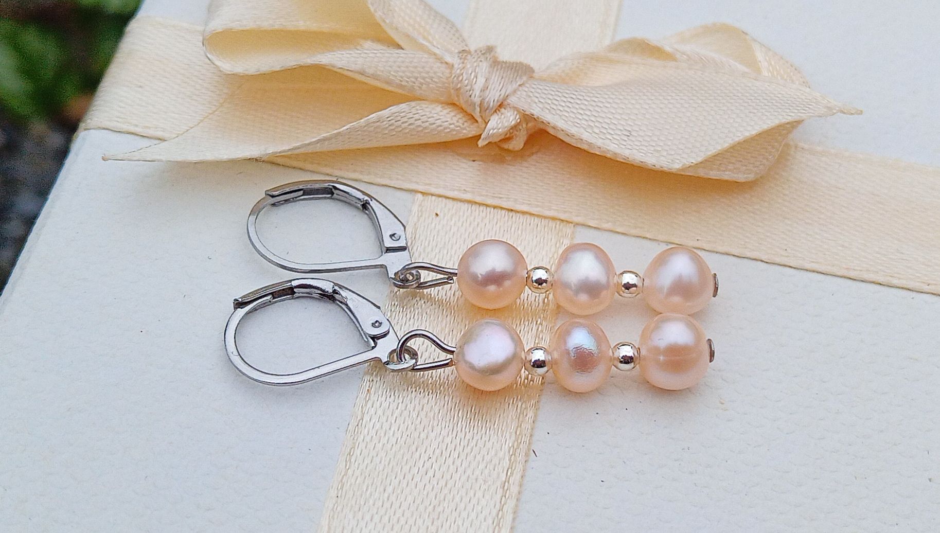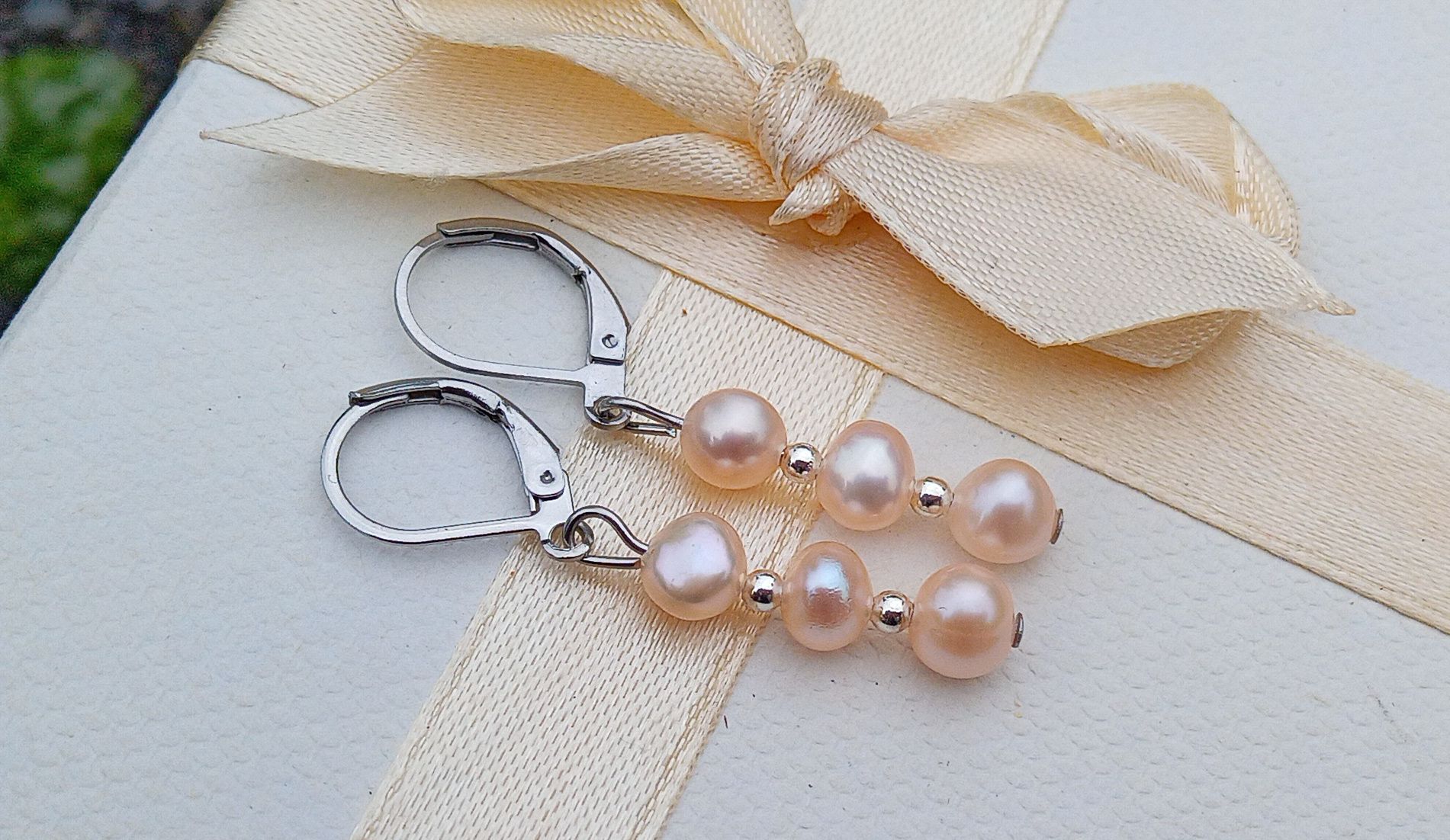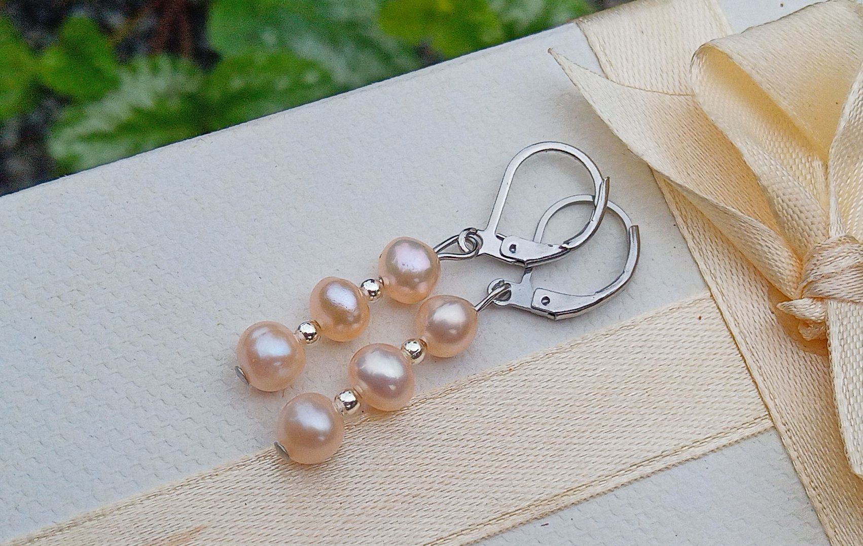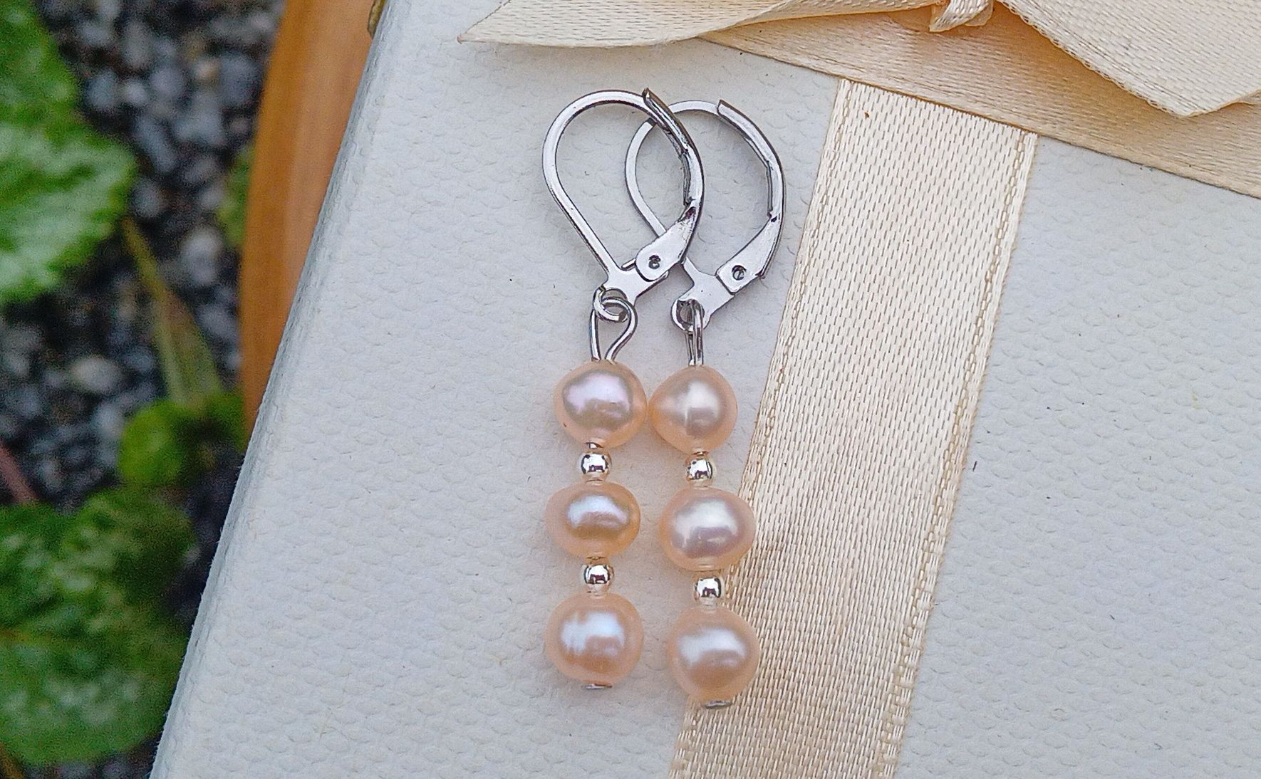 Dokonale lesklé říční perly velké cca 6 mm v něžně růžové barvě oddělené od sebe drobnými stříbrnými korálky v elegantních náušnicích dlouhých 4 cm na zavíracích háčcích z chirurgické oceli - hypoalergenní, vhodné i pro alergiky.