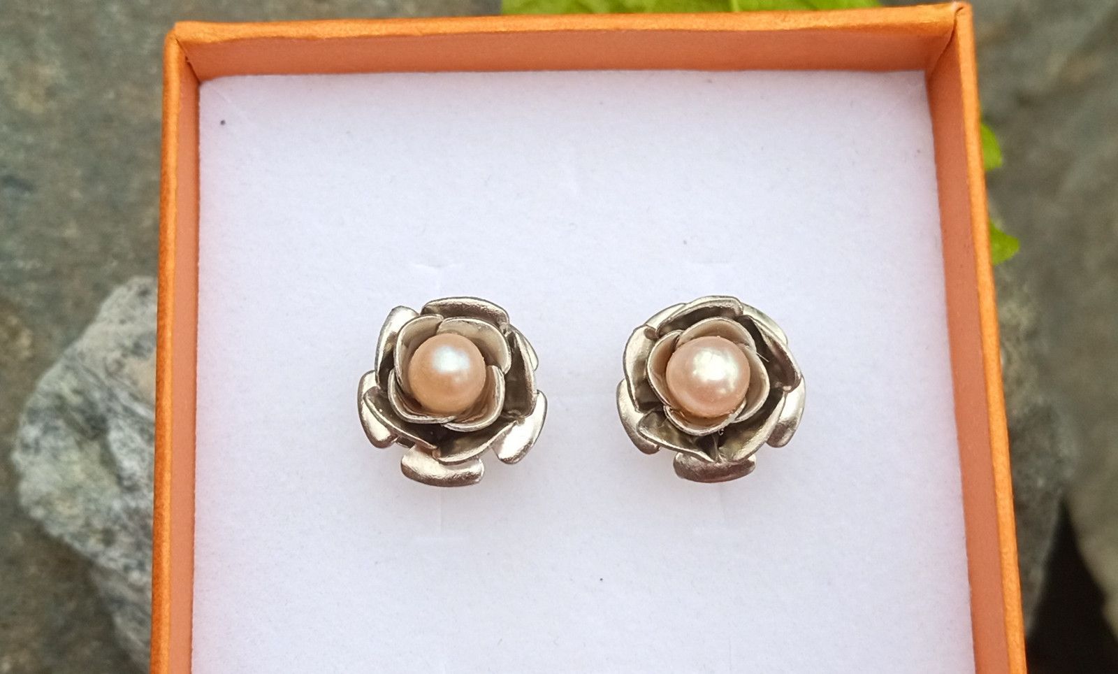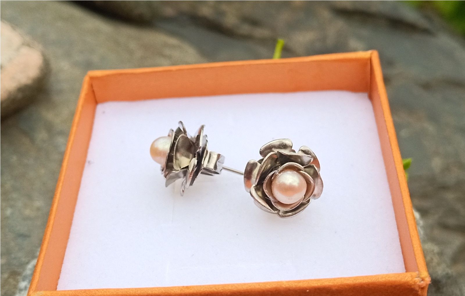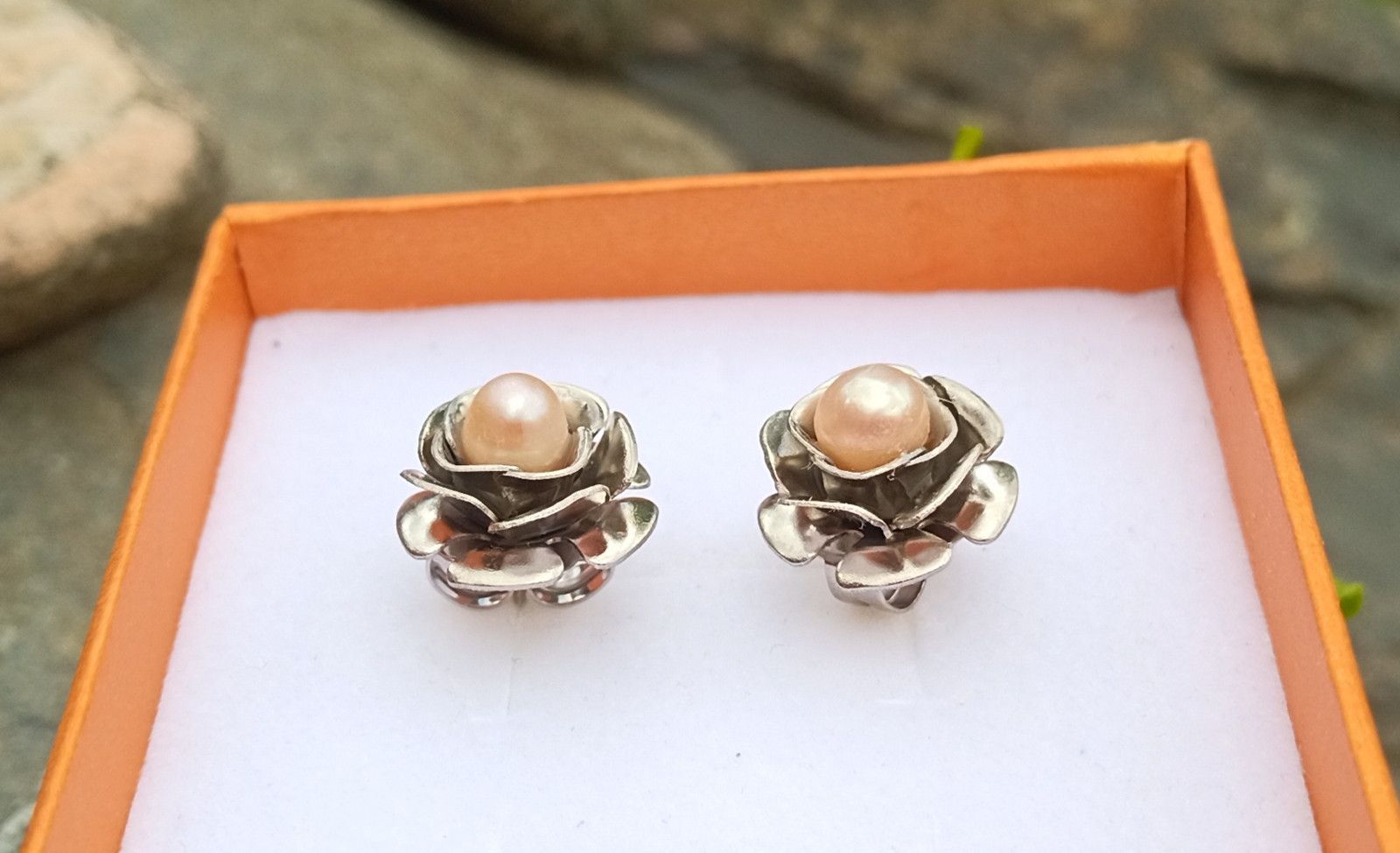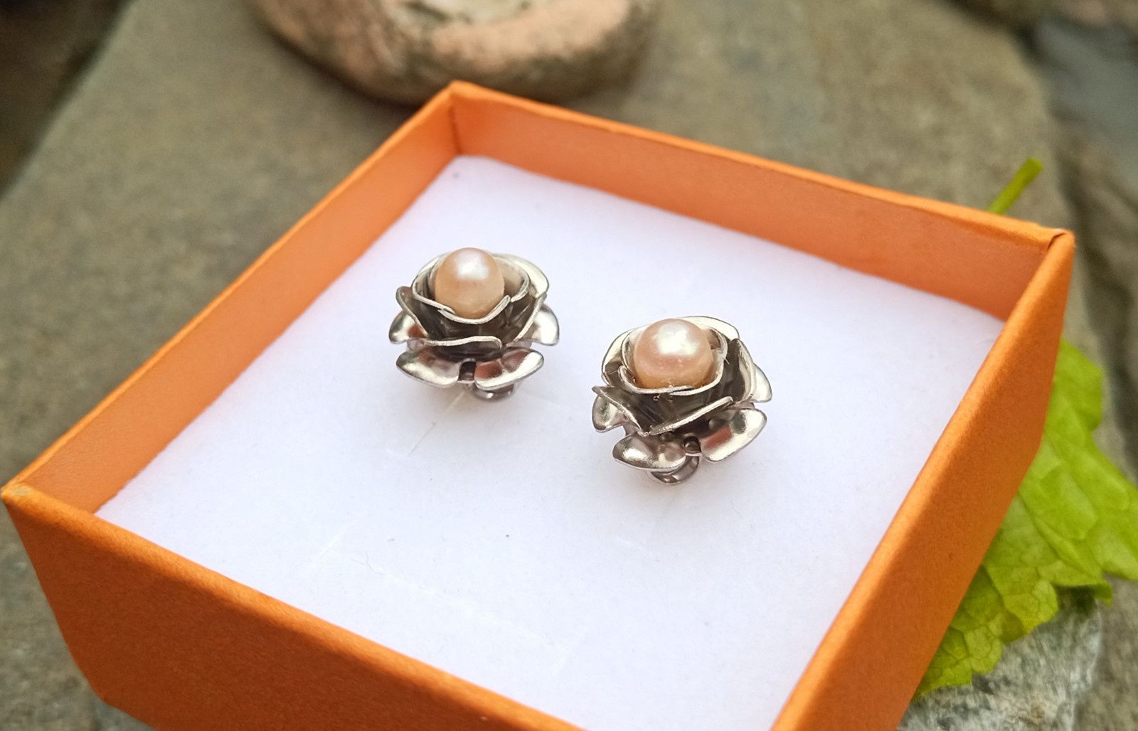 Něžné romantické náušnice puzety ve tvaru růžiček uprostřed zdobených světle růžovými dokonale lesklými říčními perlami o průměru cca 5 mm. Květinky - růžičky jsou vyrobené z chirurgické oceli - hypoalergenní, vhodné i pro alergiky.