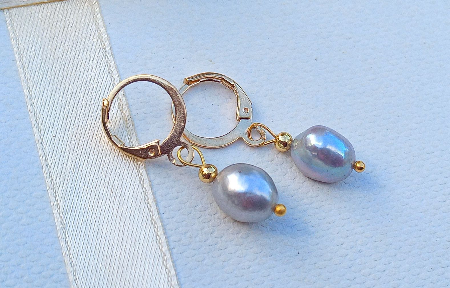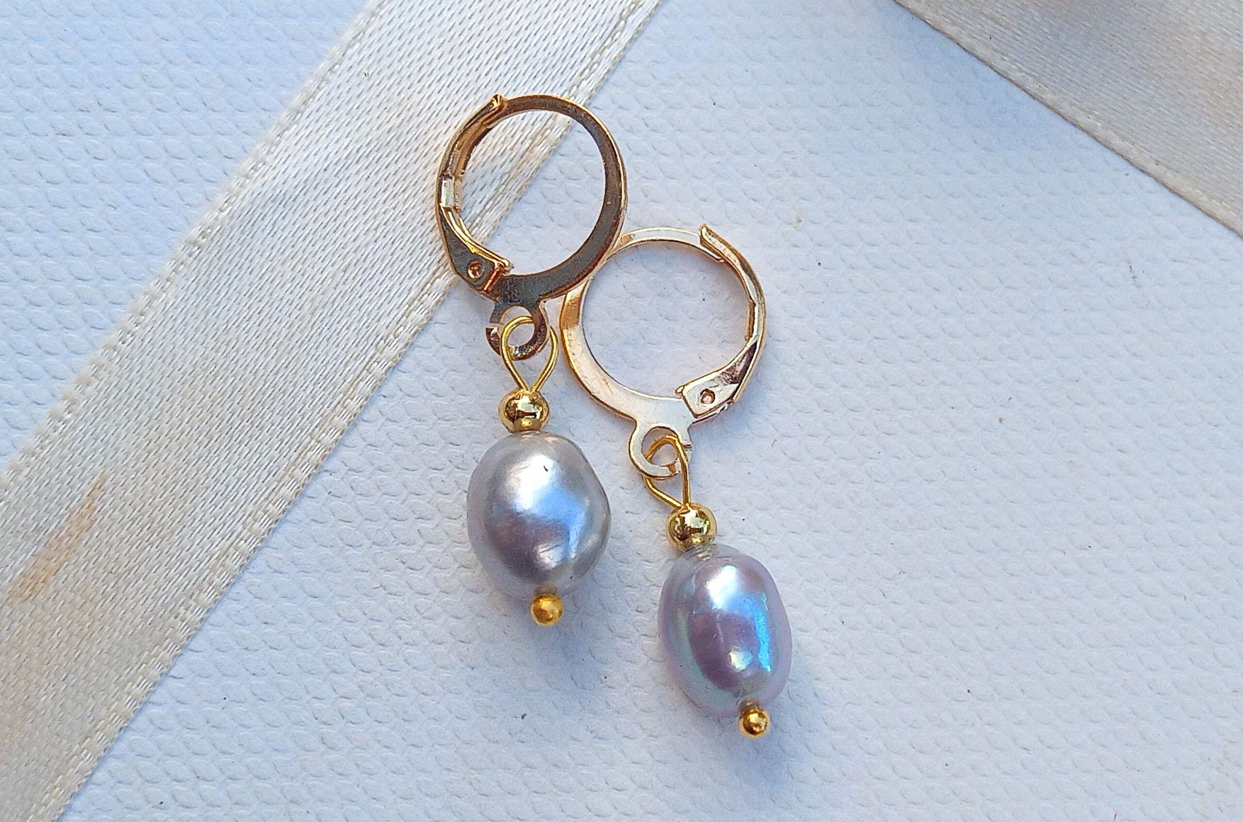Dokonale lesklé šedé říční perly velké cca 10 mm v elegantních náušnicích dlouhých 3 cm na zavíracích háčcích z pozlacené chirurgické oceli - hypoalergenní, vhodné i pro alergiky.