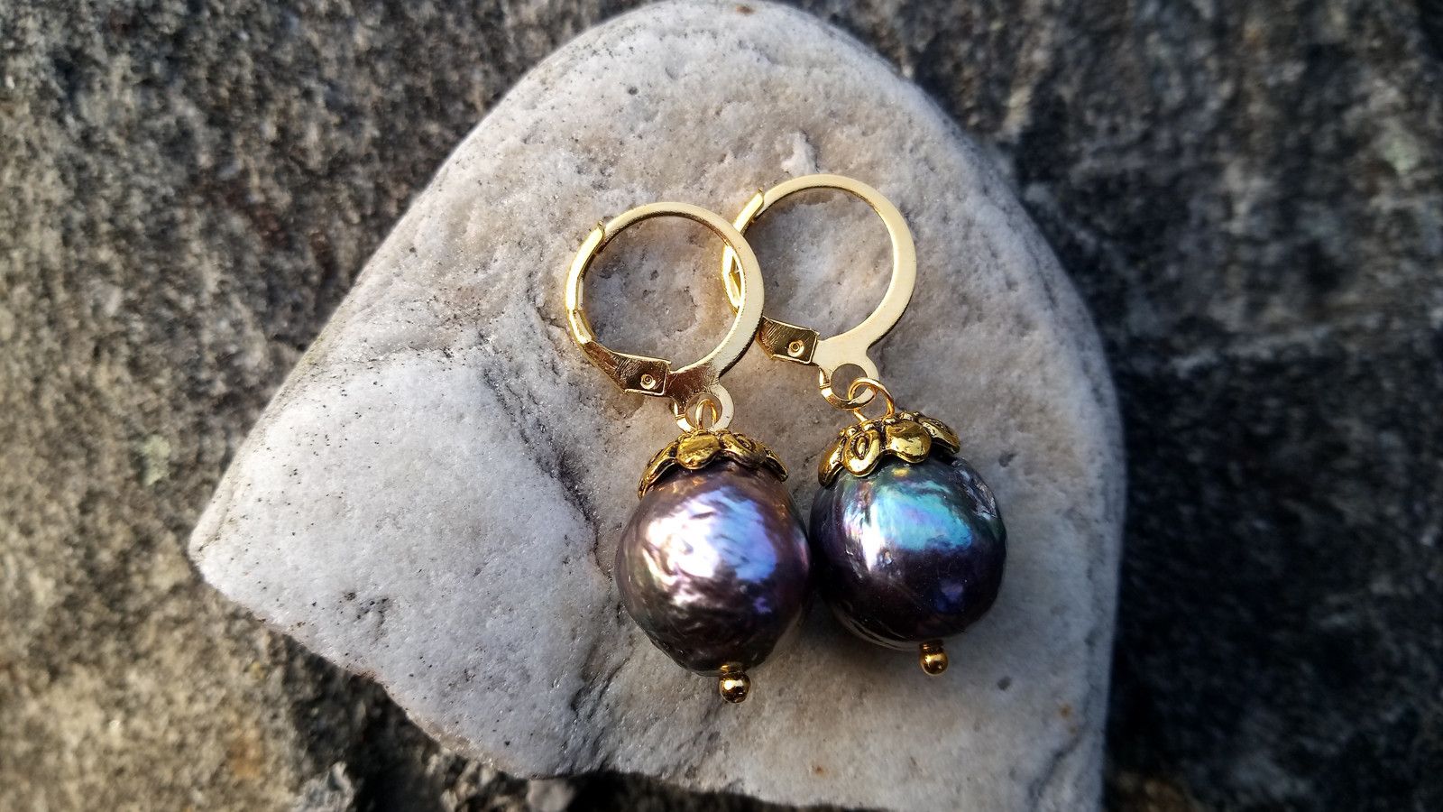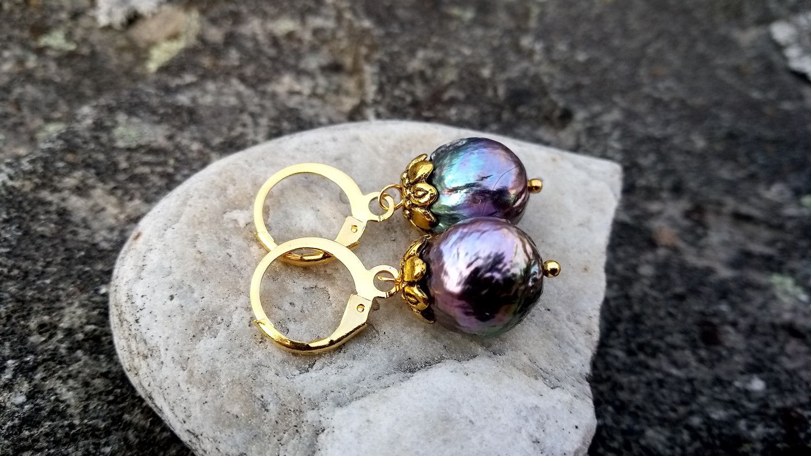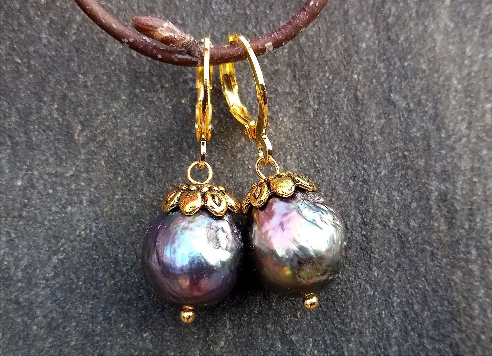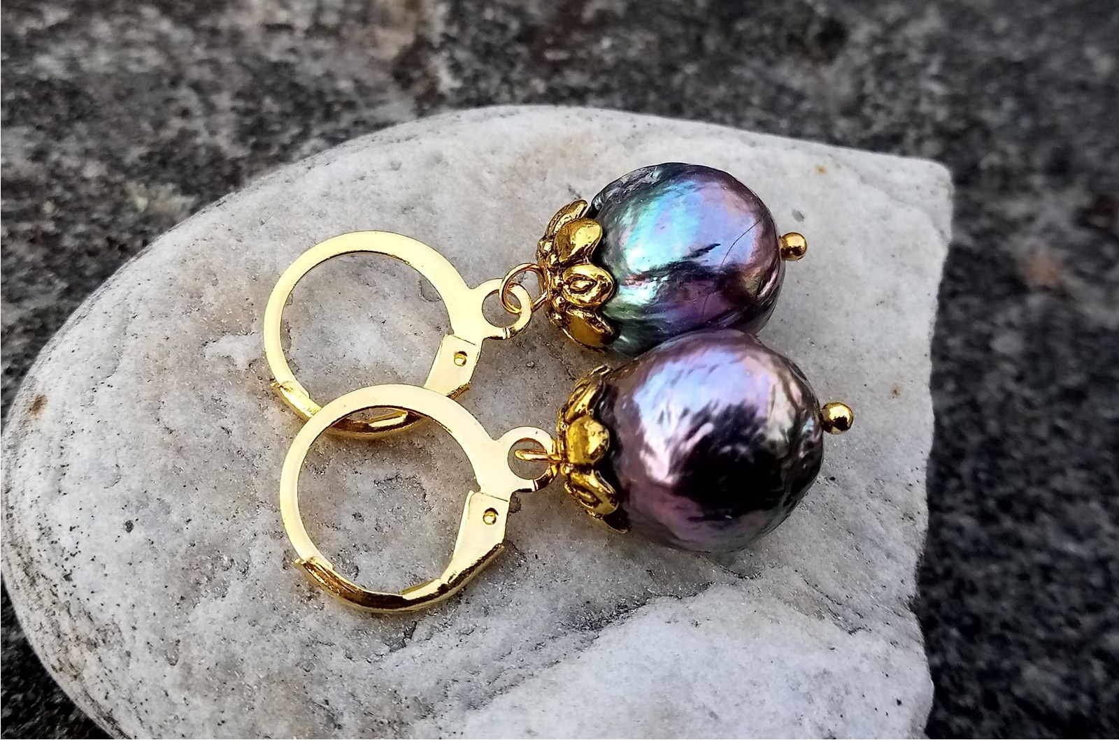 Dokonale lesklé černé pravé tahitské téměř kulaté perly o průměru cca 13 mm zdobené zlatými lístečky na kruhových zavíracích pozlacených háčcích z chirurgické oceli - hypoalergenní, vhodné i pro alergiky.