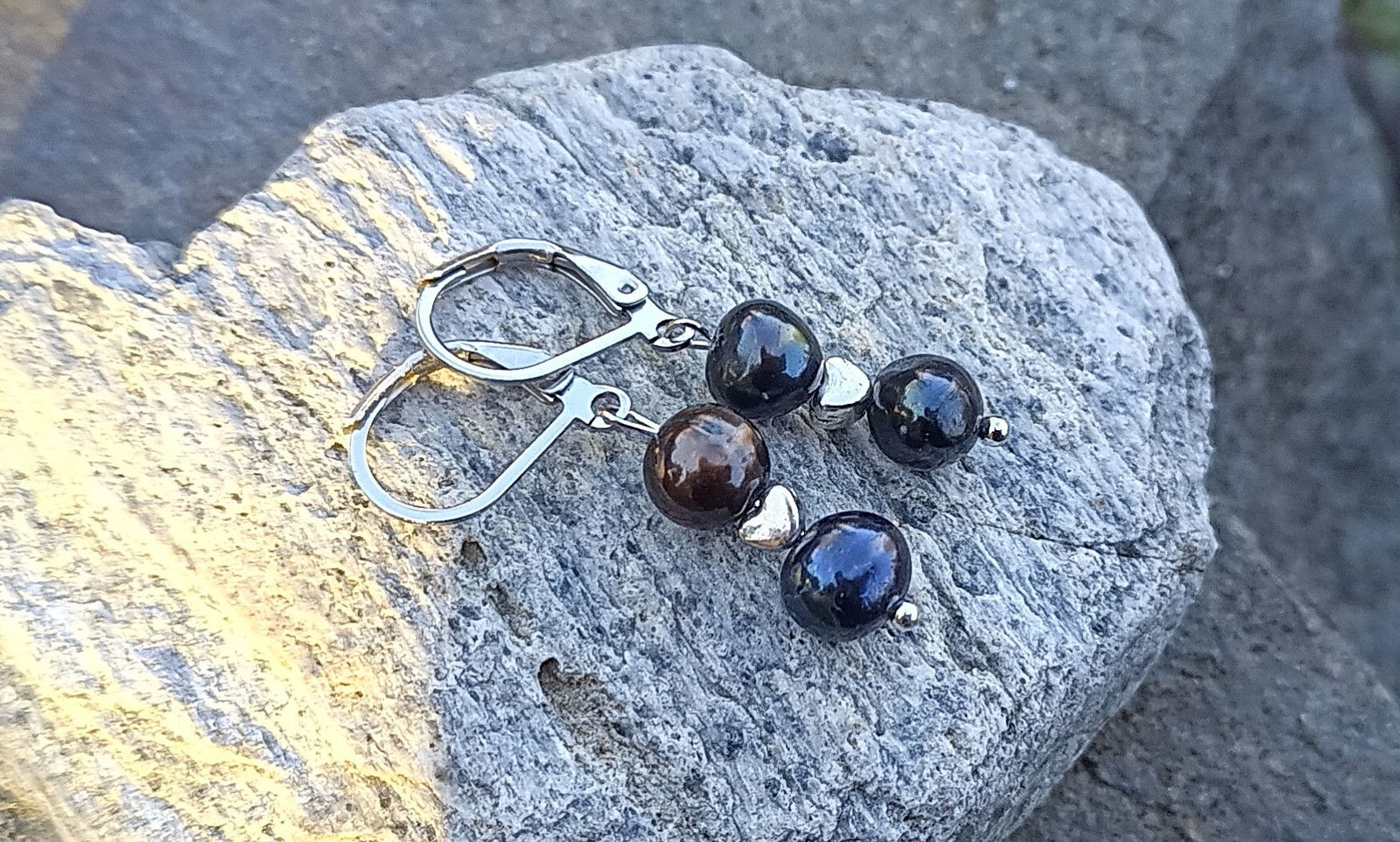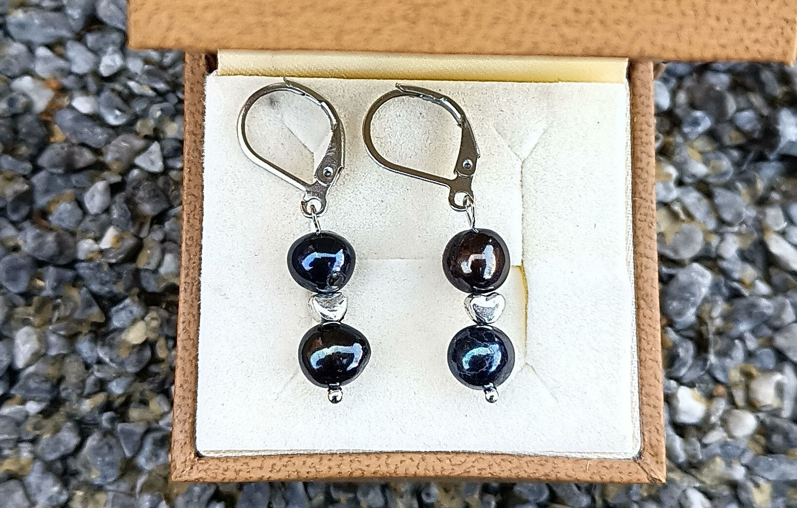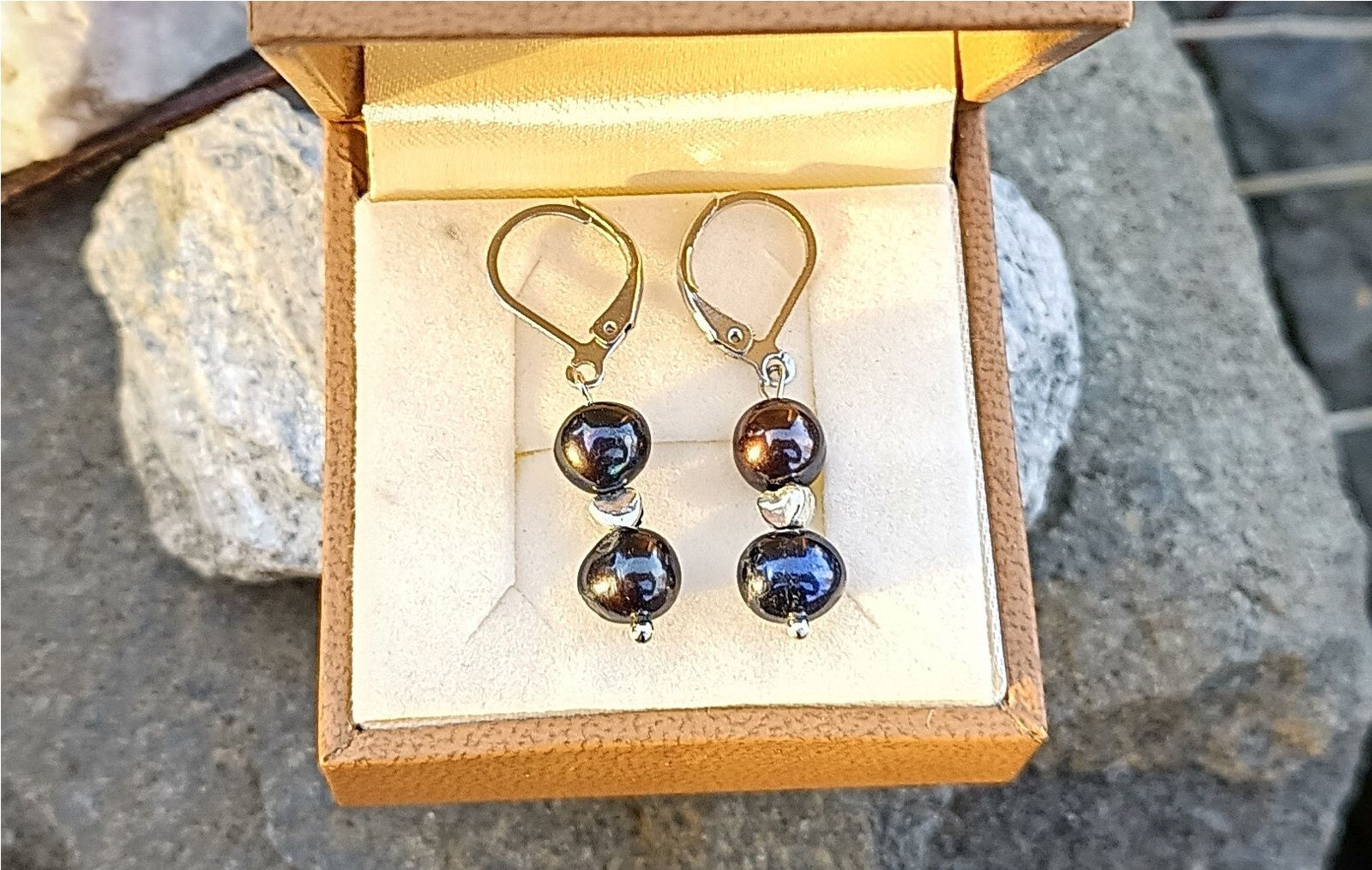 Dokonale lesklé téměř kulaté mořské perly top kvality velké cca 7 mm v tmavé barvě oddělené od sebe drobným stříbrným srdíčkem v elegantních náušnicích na zavíracích háčcích z chirurgické oceli - hypoalergenní, vhodné i pro alergiky.